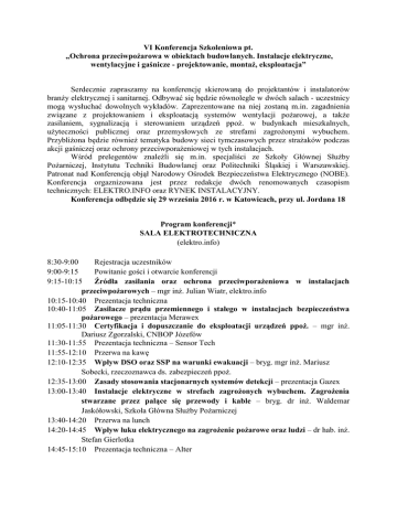 VI Konferencja Szkoleniowa pt. „Ochrona przeciwpożarowa w obiektach budowlanych. Instalacje elektryczne, wentylacyjne i gaśnicze - projektowanie, montaż, eksploatacja” Serdecznie zapraszamy na konferencję skierowaną do projektantów i instalatorów branży elektrycznej i sanitarnej. Odbywać się będzie równolegle w dwóch salach - uczestnicy mogą wysłuchać dowolnych wykładów. Zaprezentowane na niej zostaną m.in. zagadnienia związane z projektowaniem i eksploatacją systemów wentylacji pożarowej, a także zasilaniem, sygnalizacją i sterowaniem urządzeń ppoż. w budynkach mieszkalnych, użyteczności publicznej oraz przemysłowych ze strefami zagrożonymi wybuchem. Przybliżona będzie również tematyka budowy sieci tymczasowych przez strażaków podczas akcji gaśniczej oraz ochrony przeciwporażeniowej w tych instalacjach. Wśród prelegentów znaleźli się m.in. specjaliści ze Szkoły Głównej Służby Pożarniczej, Instytutu Techniki Budowlanej oraz Politechniki Śląskiej i Warszawskiej. Patronat nad Konferencją objął Narodowy Ośrodek Bezpieczeństwa Elektrycznego (NOBE). Konferencja orgaznizowana jest przez redakcje dwóch renomowanych czasopism technicznych: ELEKTRO.INFO oraz RYNEK INSTALACYJNY. Konferencja odbędzie się 29 września 2016 r. w Katowicach, przy ul. Jordana 18 Program konferencji* SALA ELEKTROTECHNICZNA (elektro.info) 8:30-9:00 Rejestracja uczestników 9:00-9:15 Powitanie gości i otwarcie konferencji 9:15-10:15 Źródła zasilania oraz ochrona przeciwporażeniowa w instalacjach przeciwpożarowych – mgr inż. Julian Wiatr, elektro.info 10:15-10:40 Prezentacja techniczna 10:40-11:05 Zasilacze prądu przemiennego i stałego w instalacjach bezpieczeństwa pożarowego – prezentacja Merawex 11:05-11:30 Certyfikacja i dopuszczanie do eksploatacji urządzeń ppoż. – mgr inż. Dariusz Zgorzalski, CNBOP Józefów 11:30-11:55 Prezentacja techniczna – Sensor Tech 11:55-12:10 Przerwa na kawę 12:10-12:35 Wpływ DSO oraz SSP na warunki ewakuacji – bryg. mgr inż. Mariusz Sobecki, rzeczoznawca ds. zabezpieczeń ppoż. 12:35-13:00 Zasady stosowania stacjonarnych systemów detekcji – prezentacja Gazex 13:00-13:40 Instalacje elektryczne w strefach zagrożonych wybuchem. Zagrożenia stwarzane przez palące się przewody i kable – bryg. dr inż. Waldemar Jaskółowski, Szkoła Główna Służby Pożarniczej 13:40-14:20 Przerwa na lunch 14:20-14:45 Wpływ łuku elektrycznego na zagrożenie pożarowe oraz ludzi – dr hab. inż. Stefan Gierlotka 14:45-15:10 Prezentacja techniczna – Alter 15:10-15:35 Ochrona ppoż. systemów PV oraz neutralizacja zagrożeń pożarowych stwarzanych przez generatory PV podczas pożaru – dr inż. Mariusz Sarniak, Politechnika Warszawska 15:35-16:00 Wpływ braku lub błędnie wykonanej instalacji odgromowej na zagrożenie pożarowe budynków – mgr inż. Krzysztof Wincencik 16:00-16:15 Przerwa na kawę 16:15-16:40 Wymagania stawiane oświetleniu awaryjnemu i ewakuacyjnemu – mgr inż. Dariusz Kamiński 16:40-17:05 Gaszenie urządzeń elektrycznych pod napięciem – st. bryg. mgr inż. Krzysztof Kociołek, Szkoła Aspirantów PSP w Krakowie 17:05–17:15 Zakończenie konferencji - mgr inż. Julian Wiatr SALA SANITARNOINSTALACYJNA (Rynek Instalacyjny) 8:30–9:00 Rejestracja uczestników 9:00–9:15 Powitanie gości i otwarcie konferencji 9:15–10:15 Wentylacja pożarowa – systemy wentylacji pożarowej, zapobieganie zadymieniu, standardy projektowania i przykłady realizacji – dr inż. Grzegorz Kubicki, Politechnika Warszawska 10:15–10:45 Wentylacja i oddymianie garaży – Aleksandra Kaczmarek, Fläkt Bovent 10:45–11:15 Zasady stosowania stacjonarnych systemów detekcji – Krzysztof Chmielewski, Gazex 11:15–11:35 Przerwa na kawę 11:35–12:30 Wentylacja pożarowa garaży – projektowanie, ocena i odbiór – wytyczne ITB 493/2015 – mgr inż. Wojciech Węgrzyński, mgr inż. Grzegorz Krajewski, Instytut Techniki Budowlanej 12:30–13:00 Zasady doboru wentylatorów oddymiających i bytowych – Venture Industries 13:00–13:40 Przerwa na lunch 13:40–14:25 Systemy wentylacji pożarowej – oddymianie. Przykłady i wytyczne 14:25–14:55 Pasywna ochrona przeciwpożarowa – K-Flex 14.55–15:10 Przerwa na kawę 15:10–16:00 Scenariusze pożarowe – podstawy prawne i zasady tworzenia – st. bryg. dr inż. Waldemar Wnęk, mł. bryg. dr inż. Rafał Porowski, Szkoła Główna Służby Pożarniczej 16:00–16:45 Instalacje hydrantowe – stan prawny, projektowanie, wykonanie i odbiór – dr inż. Grzegorz Ścieranka, Politechnika Śląska 16:45–17.00 Zakończenie konferencji *Program może ulec zmianie Informacje dla uczestników konferencji: Wstęp na konferencję jest odpłatny, koszt udziału dla członków Małopolskiej Okręgowej Izby Inżynierów Budownictwa wynosi 50 zł netto od osoby. Zgłoszenia przyjmowane będą do wyczerpania limitu miejsc według kolejności ich wpływu. Zgłoszenia: Katarzyna Zaręba tel. 22 512 60 83, kom. 501 333 717 faks 22 810 27 42 e-mail: [email protected] Formularz zgłoszenia udziału w Konferencji dostępny również na: www.rynekinstalacyjny.pl/konferencja-ppoz http://konferencja.elektro.info.pl/ z dopiskiem: MAP