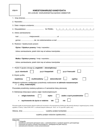 zdjęcie KWESTIONARIUSZ KANDYDATA DO LICEUM OGÓLNOKSZTAŁCĄCEGO ANIMATOR 1. Imię (imiona)............................................................................................................................................ 2. Nazwisko:................................................................................................................................................... 3. Data i miejsce urodzenia:........................................................................................................................... 4. Obywatelstwo: .................................... Nr PESEL: I___I___I___I___I___I___I___I___I___I___I___I 5. Adres zamieszkania: kod ..................... miejscowość.....................................ul. ....................................................................... gmina: ...........................tel. do rodziców/adres e-mail ............................................................................ 6. Rodzice / Opiekunowie prawni: Ojciec / Opiekun prawny / Imię i nazwisko:............................................................................................ Adres zamieszkania, jeżeli różni się od adresu kandydata:.................................................................... .................................................................................................................................................................. Matka / Opiekun prawny / Imię i nazwisko:........................................................................................... Adres zamieszkania, jeżeli różni się od adresu kandydata: ................................................................. ................................................................................................................................................................. 7. Wybór II języka obcego (j. angielski – obowiązkowy): język niemiecki język hiszpański język francuski 8. Wybór profilu: wojskowy multimedialny ogólny dziennikarski Wstępnie wybieram następujące przedmioty realizowane w zakresie rozszerzonym: j. obcy, matematyka. Pozostałe przedmioty zostaną wybrane w II semestrze klasy pierwszej. 9. Deklaracja dotycząca wyboru zajęć nieobowiązkowych: religia katolicka wychowanie do życia w rodzinie: etyka tak żaden z tych przedmiotów nie Wyrażam zgodę na przetwarzanie danych osobowych zawartych w Kwestionariuszu Osobowym dla potrzeb rekrutacji i organizacji pracy szkoły (zgodnie z Ustawą z dnia 29.08.1997 r. o ochronie danych osobowych - Dz.U. nr 133, poz 883 z późn. zm.) Gliwice, dnia ........................................... czytelny podpis kandydata ………......................................... czytelny podpis rodziców (opiekunów)…………………………………………. Załączniki: 1. 2 fotografie 2. świadectwo ukończenia gimnazjum wraz z zaświadczeniem o wynikach egzaminu gimnazjalnego 3. orzeczenie lub opinia z poradni psychologiczno –pedagogicznej (jeśli dotyczy) 4. zaświadczenie lekarskie o braku przeciwwskazań