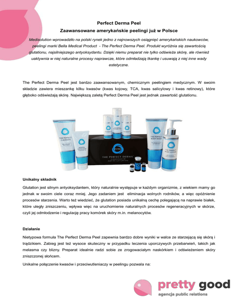 Perfect Derma Peel Zaawansowane amerykańskie peelingi już w Polsce Medisolution wprowadziło na polski rynek jedno z najnowszych osiągnięć amerykańskich naukowców, peelingi marki Bella Medical Product - The Perfect Derma Peel. Produkt wyróżnia się zawartością glutationu, najsilniejszego antyoksydantu. Dzięki niemu preparat nie tylko odświeża skórę, ale również uaktywnia w niej naturalne procesy naprawcze, które odmładzają tkankę i usuwają z niej inne wady estetyczne. The Perfect Derma Peel jest bardzo zaawansowanym, chemicznym peelingiem medycznym. W swoim składzie zawiera mieszankę kilku kwasów (kwas kojowy, TCA, kwas salicylowy i kwas retinowy), które głęboko odświeżają skórę. Największą zaletą Perfect Derma Peel jest jednak zawartość glutationu. Unikalny składnik Glutation jest silnym antyoksydantem, który naturalnie występuje w każdym organizmie, z wiekiem mamy go jednak w swoim ciele coraz mniej. Jego zadaniem jest eliminacja wolnych rodników, a więc opóźnienie procesów starzenia. Warto też wiedzieć, że glutation posiada unikalną cechę polegającą na naprawie białek, które uległy zniszczeniu, wpływa więc na uruchomienie naturalnych procesów regeneracyjnych w skórze, czyli jej odmłodzenie i regulację pracy komórek skóry m.in. melanocytów. Działanie Nietypowa formuła The Perfect Derma Peel zapewnia bardzo dobre wyniki w walce ze starzejącą się skórą i trądzikiem. Zabieg jest też wysoce skuteczny w przypadku leczenia uporczywych przebarwień, takich jak melasma czy blizny. Preparat idealnie radzi sobie ze zrogowaciałym naskórkiem i odświeżeniem skóry zniszczonej słońcem. Unikalne połączenie kwasów i przeciwutleniaczy w peelingu pozwala na: rozjaśnienie, poprawę odcienia i faktury skóry; usunięcie lub zmniejszenie przebarwień skóry; kontrolowanie skóry trądzikowej, poprawę wyglądu blizn potrądzikowych; redukcję wielkości porów; zmniejszenie drobnych linii i zmarszczek; stymulację produkcji kolagenu i elastyny, co prowadzi do przebudowy i odmłodzenia skóry. Zabieg The Perfect Derma Peel przeznaczony jest dla wszystkich rodzajów skóry i może być stosowany na twarz oraz inne obszary ciała, takie jak dekolt, szyja, ramiona, dłonie i plecy. Zabieg może być wykonywany jedynie przez lekarza. Cała procedura nakładania preparatu trwa bardzo krótko, bo około piętnastu minut i jest praktycznie bezbolesna, a na skórze widoczne jest jedynie małe zaczerwienienie. Proces odnowy następuje w kilku kolejnych dniach. W trzeciej dobie naskórek zaczyna się intensywnie łuszczyć i trwa to około czterech dni. Po etapie złuszczania skóra jest bardzo odświeżona, ale składniki zawarte w peelingu oddziałują na nią regeneracyjnie jeszcze przez kilka kolejnych tygodni, ponieważ w tkance uaktywniają się procesy naprawcze. Ceny zabiegu w różnych gabinetach będą się wahać od 800 do 1300 zł. Dla optymalnych efektów oraz dobrego procesu gojenia, wymagana jest od pacjenta odpowiednia pielęgnacja skóry w kilku kolejnych dniach po zabiegu. Pacjent otrzymuje zestaw do pielęgnacji skóry w domu wraz z instrukcją postępowania. W skład zestawu wchodzą chusteczki oraz specjalny balsam pielęgnacyjny. Jedną z pierwszych klinik w Polsce, oferujących zabiegi oparte na The Perfect Derma Peel jest warszawskie Centrum Medycyny Nowoczesnej Triclinium. Jej właściciel, doktor Marek Wasiluk, specjalista medycyny estetycznej, bardzo dobrze ocenia nowy preparat. „Uważam, że The Perfect Derma Peel jest wyjątkowo pomocny w leczeniu trądziku grudkowatego z zaskórnikami, oraz że to bardzo dobra alternatywna metoda odmładzająca skórę dla osób, które maja przeciwwskazania do laseroterapii. Paradoksalnie, mimo że peeling jest bardzo silny, to działa on bezboleśnie, a okres rekonwalescencji oraz gojenie skóry przebiegają po jego zastosowaniu bardzo łagodnie. Zapewnia to duży komfort pacjentowi, a to bardzo ważne”. --Informacja o firmie: Medisolution Sp. z o.o. jest polską firmą zajmującą się importem i dystrybucją profesjonalnych wyrobów, preparatów i urządzeń medycznych dla gabinetów medycyny estetycznej. Medisolution na pierwszym miejscu stawia bezpieczeństwo, dlatego produkt y dostarczane przez firmę spełniają najwyższe standardy jakości, posiadają certyfikaty CE oraz produkowane są w ścisłej zgodnoś ci z międzynarodową normą ISO13485:2003. Dzięki wypracowanym kontaktom ze światowymi producentami oraz doskonałej znajomości rynku amerykańskiego i azjatyckiego, oferta firmy wyróżnia się najnowocześniejszymi, często unikatowymi w Polsce technologiami i preparatami, dostępnymi ponadto w bardzo atrakcyjnych cenach. www.medisolution.pl Więcej informacji udziela: Joanna Siemińska PR Manager Agencja Pretty Good mob. +48 503 744 399 e-mail: [email protected]