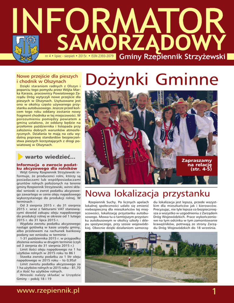 INFORMATOR SAMORZĄDOWY Gminy Rzepiennik Strzyżewski, lipiec - sierpień 2015 nr 4 • lipiec - sierpień • 2015r. • ISSN 2393-2079 Nowe przejście dla pieszych i chodnik w Olszynach Dzięki staraniom radnych z Olszyn i poparciu tego pomysłu przez Wójta Marka Karasia, pracownicy Powiatowego Zarządu Dróg wytyczyli nowe przejście dla pieszych w Olszynach. Usytuowane jest ono w okolicy często używanego przystanku autobusowego. Jeszcze przed końcem tego roku oddany zostanie nowy fragment chodnika w tej miejscowości. W porozumieniu pomiędzy powiatem a gminą ustalono, że oddany będzie na przełomie października i listopada przy założeniu dobrych warunków atmosferycznych. Działania te mają na celu wydatną poprawę standardów bezpieczeństwa pieszych korzystających z drogi powiatowej w Olszynach. Dożynki Gminne warto wiedzieć... Zapraszamy na relację (str. 4-5) Informacja o zwrocie podatku akcyzowego dla rolników Wójt Gminy Rzepiennik Strzyżewski informuje, że producenci rolni, którzy są posiadaczami lub współposiadaczami gruntów rolnych położonych na terenie gminy Rzepiennik Strzyżewski, winni składać wnioski o zwrot podatku akcyzowego zawartego w cenie oleju napędowego wykorzystanego do produkcji rolnej. W terminach : Od 3 sierpnia 2015 r. do 31 sierpnia 2015 r. wraz z fakturami VAT stanowiącymi dowód zakupu oleju napędowego do produkcji rolnej w okresie od 1 lutego 2015 r. do 31 lipca 2015 r. Wypłata zwrotu podatku akcyzowego nastąpi gotówką w kasie urzędu gminy, albo przelewem na rachunek bankowy podany we wniosku w terminie : 1-31 października 2015 r. w przypadku złożenia wniosku w drugim terminie (czyli od 3 sierpnia do 31 sierpnia 2015 r.) Limit ilości oleju napędowego na 1 ha użytków rolnych w 2015 roku to 86 l Stawka zwrotu podatku za 1 litr oleju napędowego w 2015 roku – to 0,95zł Limit zwrotu podatku akcyzowego za 1 ha użytków rolnych w 2015 roku – 81,70 zł.x ilość ha użytków rolnych. Wnioski należy składać w Urzędzie Gminy – pokój 18 i 19 www.rzepiennik.pl Nowa lokalizacja przystanku Rzepiennik Suchy. Po licznych apelach lokalnej społeczności udało się zmienić niebezpieczną dla mieszkańców tej miejscowości, lokalizację przystanku autobusowego. Mowa tu o tamtejszym przystanku autobusowym w okolicy szkoły i sklepu spożywczego, przy szosie wojewódzkiej. Obecnie dzięki działaniom samorzą- du lokalizacja jest lepsza, przede wszystkim dla mieszkańców jak i kierowców. Precyzując, nie tyle lepsza co bezpieczniejsza a wszystko w uzgodnieniu z Zarządem Dróg Wojewódzkich. Prace wykończeniowe na tym odcinku w tym zamontowanie krawężników, potrwają ze strony Zarządu Dróg Wojewódzkich do 18 września. 1 INFORMATOR SAMORZĄDOWY Gminy Rzepiennik Strzyżewski, lipiec - sierpień 2015 Z pracy Rady Gminy... W czwartek 25 czerwca odbyła się IX sesja Rady Gminy Rzepiennik Strzyżewski. Głównym punktem obrad było udzielenie absolutorium dla Wójta Gminy za rok 2014. Obecny Wójt naszej gminy Marek Karaś, kontynuując działania swojego poprzednika otrzymał oczywiście absolutorium. Jego udzielenie rekomendowała jednoznacznie Regionalna Izba Obrachunkowa z Krakowa, która rokrocznie analizuje wykonanie budżetu w każdej gminie. Na prządek dzienny obrad rady składały się również zatwierdzenie sprawozdań poszczególnych jednostek organizacyjnych gminy czyli : GOPS, GOK, Biblioteki oraz Gminnej Komisji Rozwiązywania Problemów Alkoholowych. Z apelem o patronat i wsparcie wystąpiła również Barbara Duran szefowa Stowarzyszenia „Wszystkie dzieci nasze są”, chodziło o Piknik charytatywny pod nazwą „Każdy może nad morze.” /o tej imprezie na str. 8/ Największe zainteresowanie wśród radnych wywołało jednak wystąpienie prezesa spółki komunalnej „Dorzecze Białej”. Chodziło o możliwość przystąpienia mieszkańców Rzepiennika Strzyżewskiego i Biskupiego do projektu wykonania przyłączy kanalizacyjnych i wodociągowych z dopłatą ze strony Wojewódzkiego Funduszu Ochrony Środowiska i Gospodarki Wodnej. Według symulacji prezesa w programie realizowanym przez spółkę wraz z Wojewódzkim Funduszem Ochrony Środowiska i Gospodarki Wodnej, koszt przyłącza dla mieszkańca byłby niższy o ok. 300 złotych (przy założeniu długości przyłącza 20 metrów, a na przyłączu 5 –cio metrowym byłaby to kwota ok. 800 złotych niższa) w porównaniu z metodą gospodarczą, realizowaną samodzielnie przez mieszkańca a w przypadku gdyby realizowała to firma budowlana to rozbieżność w kosztach jest jeszcze większa. Całość kosztów wykonania przyłącza mogła być rozłożona na 23 raty. Powyższe wyliczenia i symulacje nie przekonały jednak radnych i nie podjęli uchwały umożliwiającej przystąpienie do tego projektu i skorzystania przez mieszkańców z bonifikat. Także następna /nadzwyczajna/ sesja RG z dnia 10.07. a zwołana dokładnie w tej samej sprawie, zakończyła się negatywną decyzją rady gminy. Warunkiem wejścia do programu dofinansowań i rat dogodnych do spłaty dla mieszkańców a stworzonych przez spółkę Dorzecze Białej, było obciążenie budynku UG hipoteką na 5 lat co przy obciążeniach zaciągniętych w tym samym celu w poprzednich latach nie było zbyt wygórowaną ceną. Z informacji prezesa spółki wynika że mieszkańcy pozostałych gmin będących udziałowcami w spółce „Dorzecze Białej” będą mogli skorzystać z tego projektu. Sprawa ostatecznie będzie rozpatrywana przez Radę Gminy w trzecim podejściu na najbliższej sesji dnia 28 sierpnia. O decyzji w tej sprawie poinformujemy w następnym numerze informatora a na bieżąco na naszej gminnej stronie internetowej. Na zakończenie sesji podjęto również uchwałę w sprawie wyznaczenia inkasentów podatku od nieruchomości, podatku rolnego i leśnego oraz określenia wysokości wynagrodzeń za inkaso. Zwyczajowo w naszej gminie funkcje te pełnią soł