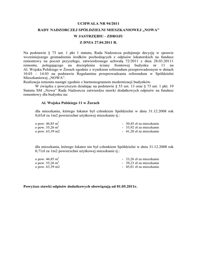 UCHWAŁA NR 94/2011 RADY NADZORCZEJ SPÓŁDZIELNI MIESZKANIOWEJ „NOWA” W JASTRZĘBIU - ZDROJU Z DNIA 27.04.2011 R. Na podstawie § 73 ust. 1 pkt 1 statutu, Rada Nadzorcza podejmuje decyzję w sprawie wcześniejszego gromadzenia środków pochodzących z odpisów lokatorskich na fundusz remontowy na poczet przyszłego, zatwierdzonego uchwałą 72/2011 z dnia 28.03.20111 remontu, polegającego na dociepleniu ściany frontowej budynku nr 11 na Al. Wojska Polskiego w Żorach zgodnie z wynikiem referendum przeprowadzonym w dniach 10.03 – 14.03 na podstawie Regulaminu przeprowadzania referendum w Spółdzielni Mieszkaniowej „NOWA”. Realizacja remontu nastąpi zgodnie z harmonogramem modernizacji budynków. W związku z powyższym działając na podstawie § 53 ust. 13 oraz § 73 ust. 1 pkt. 19 Statutu SM „Nowa” Rada Nadzorcza zatwierdza stawki dodatkowych odpisów na fundusz remontowy dla budynku na: Al. Wojska Polskiego 11 w Żorach dla mieszkania, którego lokator był członkiem Spółdzielni w dniu 31.12.2008 rok 0,65zł za 1m2 powierzchni użytkowej mieszkanie tj.: o pow. 46,85 m2 o pow. 55,26 m2 o pow. 63,39 m2 - 30,45 zł za mieszkanie - 35,92 zł za mieszkanie - 41,20 zł za mieszkanie dla mieszkania, którego lokator nie był członkiem Spółdzielni w dniu 31.12.2008 rok 0,71zł za 1m2 powierzchni użytkowej mieszkanie tj.: o pow. 46,85 m2 o pow. 55,26 m2 o pow. 63,39 m2 - 33,26 zł za mieszkanie - 39,23 zł za mieszkanie - 45,01 zł za mieszkanie Powyższe stawki odpisów dodatkowych obowiązują od 01.05.2011r.