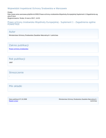 Wojewódzki Inspektorat Ochrony Środowiska w Warszawie Źródło: http://www.wios.warszawa.pl/pl/form/r2002,Prawo-ochrony-srodowiska-Wspolnoty-Europejskiej-Suplement-1-Zagadnienia-og olne-P.html Wygenerowano: Środa, 8 marca 2017, 14:53 Prawo ochrony środowiska Wspólnoty Europejskiej - Suplement 1 - Zagadnienia ogólne POWIETRZE Autor Ministerstwo Ochrony Środowiska Zasobów Naturalnych i Leśnictwa Zakres publikacji Prawo ochrony środowiska Rok publikacji 1997 Streszczenie - Plik okładki Data publikacji 07.10.2008 Rejestr zmian Ministerstwo Ochrony Środowiska Zasobów Naturalnych i Leśnictwa
