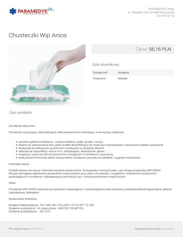 PARAMEDYK sklep ul. Gilarska 103, 03-589 Warszawa 22 679 70 16 Chusteczki Wip Anios Cena: 56,16 PLN Opis słownikowy Dostępność dostępny Producent Medilab Opis produktu Chusteczki Wip Anios Chusteczki czyszczące i dezynfekujące małe powierzchnie, endoskopy i inne wyroby medyczne szerokie spektrum biobójcze - zwalcza bakterie, prątki, grzyby i wirusy idealne do zastosowania tam, gdzie środek dezynfekcyjny nie może być rozpryskiwany i istotne jest szybkie wysychanie doskonałe do delikatnych powierzchni wrażliwych na działanie alkoholi zalecane do dezynfekcji i mycia m.in. endoskopów, inkubatorów, głowic mogą być użyte również do powierzchni zostających w kontakcie z żywnością duża powierzchnia oraz dobra wytrzymałość chusteczki pozwala na dokładne i wygodne stosowanie Instrukcja użycia Produkt gotowy do użycia. Ostrożnie wycierać powierzchnie. W przypadku mocnych plam, użyć drugą chusteczkę WIP ANIOS. Nie jest wymagane spłukiwanie powierzchni czyszczonych przy użyciu chusteczek, z wyjątkiem: inkubatorów, powierzchni pozostających w kontakcie z nieopakowaną żywnością oraz z zanieczyszczeniami organicznymi Skład Chusteczki WIP ANIOS nasycone są roztworem zawierającym: czwartorzędowe sole amoniowe, polyhexamethylo-biguanidyna, alkohol izopropylowy, detergenty Skuteczność biobójcza Działanie bakteriobójcze - EN 1040, EN 1276, prEN 13713, NFT 72-190; Działanie prątkobócze - M. tuberculosis –BACTEC TB METOD; Działanie grzybobójcze – EN 1275 Plik wygenerowano: 08-03-2017 Oprogramowanie sklepu: AptusShop PARAMEDYK sklep ul. Gilarska 103, 03-589 Warszawa 22 679 70 16 ( C. albicans ), EN 1650; Aktywny wobec HIV, HCV, Herpes wirus oraz Rotavirus Czas ekspozycji - 5 minut Szczegóły techniczne: Nasycenie roztworem - 5 ml / każda chusteczka Rozmiar – 200x 200mm Opakowanie - 50 szt. / 1 pudełko Plik wygenerowano: 08-03-2017 Powered by TCPDF (www.tcpdf.org) Oprogramowanie sklepu: AptusShop