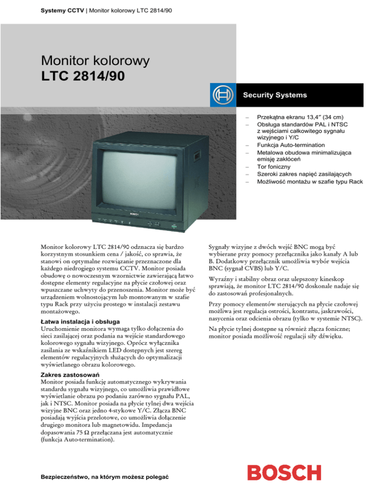 Systemy CCTV | Monitor kolorowy LTC 2814/90 Monitor kolorowy LTC 2814/90 Security Systems – – – – – – – Monitor kolorowy LTC 2814/90 odznacza się bardzo korzystnym stosunkiem cena / jakość, co sprawia, że stanowi on optymalne rozwiązanie przeznaczone dla każdego niedrogiego systemu CCTV. Monitor posiada obudowę o nowoczesnym wzornictwie zawierającą łatwo dostępne elementy regulacyjne na płycie czołowej oraz wpuszczane uchwyty do przenoszenia. Monitor może być urządzeniem wolnostojącym lub montowanym w szafie typu Rack przy użyciu prostego w instalacji zestawu montażowego. Łatwa instalacja i obsługa Uruchomienie monitora wymaga tylko dołączenia do sieci zasilającej oraz podania na wejście standardowego kolorowego sygnału wizyjnego. Oprócz wyłącznika zasilania ze wskaźnikiem LED dostępnych jest szereg elementów regulacyjnych służących do optymalizacji wyświetlanego obrazu kolorowego. Zakres zastosowań Monitor posiada funkcję automatycznego wykrywania standardu sygnału wizyjnego, co umożliwia prawidłowe wyświetlanie obrazu po podaniu zarówno sygnału PAL, jak i NTSC. Monitor posiada na płycie tylnej dwa wejścia wizyjne BNC oraz jedno 4-stykowe Y/C. Złącza BNC posiadają wyjścia przelotowe, co umożliwia dołączenie drugiego monitora lub magnetowidu. Impedancja dopasowania 75 Ω przełączana jest automatycznie (funkcja Auto-termination). Bezpieczeństwo, na którym możesz polegać Przekątna ekranu 13,4″ (34 cm) Obsługa standardów PAL i NTSC z wejściami całkowitego sygnału wizyjnego i Y/C Funkcja Auto-termination Metalowa obudowa minimalizująca emisję zakłóceń Tor foniczny Szeroki zakres napięć zasilających Możliwość montażu w szafie typu Rack Sygnały wizyjne z dwóch wejść BNC mogą być wybierane przy pomocy przełącznika jako kanały A lub B. Dodatkowy przełącznik umożliwia wybór wejścia BNC (sygnał CVBS) lub Y/C. Wyraźny i stabilny obraz oraz ulepszony kineskop sprawiają, że monitor LTC 2814/90 doskonale nadaje się do zastosowań profesjonalnych. Przy pomocy elementów sterujących na płycie czołowej możliwa jest regulacja ostrości, kontrastu, jaskrawości, nasycenia oraz odcienia obrazu (tylko w systemie NTSC). Na płycie tylnej dostępne są również złącza foniczne; monitor posiada możliwość regulacji siły dźwięku. 2 | Monitor kolorowy LTC 2814/90 Date techniczne Parametry elektryczne Model Napięcie Zakres Pobór mocy przy Standard znamionowe napięć napięciu znam. TV LTC 2814/90 120 / 230 VAC, 100 – 240 70 W PAL/ 50 / 60 Hz NTSC Kineskop przekątna 35 cm (14″), odchylanie wiązki 90°, plamka 0,66 mm, działa rzędowe, ochrona przed implozją Widoczny obszar obrazu przekątna 34 cm (13,4″) w poziomie: 10% Liniowość w pionie: 10% 350 linii TV (sygnał CVBS) Rozdzielczość pozioma Wejścia wizyjne Całkowity sygnał wizyjny 0,5 - 1,5 Vpp, synchronizacja negatywowa; automatyczne przełączanie dopasowania impedancją 75 Ω i wysoką impedancją (Hi-Z), wyjście przelotowe Y/C impedancja: 75 Ω, asymetryczne Y: 0,7 Vpp C: 0,3 Vpp poziom linii: 300 mV Wejście foniczne impedancja: 47 kΩ przelotowe, poziom linii Wyjście foniczne głośnik: 1W Elementy sterujące Płyta czołowa głośność ostrość jaskrawość kontrast nasycenie kolorów odcień (tylko NTSC) przełącznik wejścia wizyjnego - sygnał CVBS A, B / Y/C przełącznik wyboru wejścia wizyjnego wyłącznik zasilania Płyta tylna przełącznik impedancji Y/C Złącza Wejście / wyjście CVBS Wejście / wyjście Y/C Wejście / wyjście foniczne Gniazdo zasilające Parametry mechaniczne Obudowa Materiał Wykończenie Wymiary Masa Parametry środowiskowe Temperatura 4 x BNC, 2 wejścia i 2 wyjścia 2 x mini-DIN 4 x RCA (Cinch), 2 wejścia i 2 wyjścia dwa kable 3-żyłowe z obwodem ochronnym; długość 1,5 m, z wtykiem standardu europejskiego i standardu amerykańskiego stal, plastikowa płyta czołowa kolor grafitowy 353 (szer.) x 390 (gł.) x 330 (wys.) mm 14 kg pracy: 0 ÷ +40°C przechowywania: -10 ÷ +50°C maks. 90% względna, bez kondensacji Wilgotność Zgodność Kompatybilność elektromagnetyczna FCC część 15, ICES-003, CE Standardy bezpieczeństwa CE, UL, CSA, EN, IEC, DHHS norma 21 CFR Akcesoria Zestaw do montażu w szafie typu Rack LTC 9114/00 do montażu 1 monitora w szafie typu Rack 19″; szerokość 1 U, wysokość 8 U Bosch Security Systems Sp. z o.o. ul. Poleczki 3 02-822 Warszawa Tel.: (+48 22) 715 41 00 / 01 Fax: (+48 22) 715 41 05 / 06 E-mail: [email protected] www.boschsecurity.pl 9498 962 36715 05-14 | Aktualizacja 06.04.2005. Ze względu na stały postęp dane techniczne mogą ulec zmianie bez stosownego ostrzeżenia.