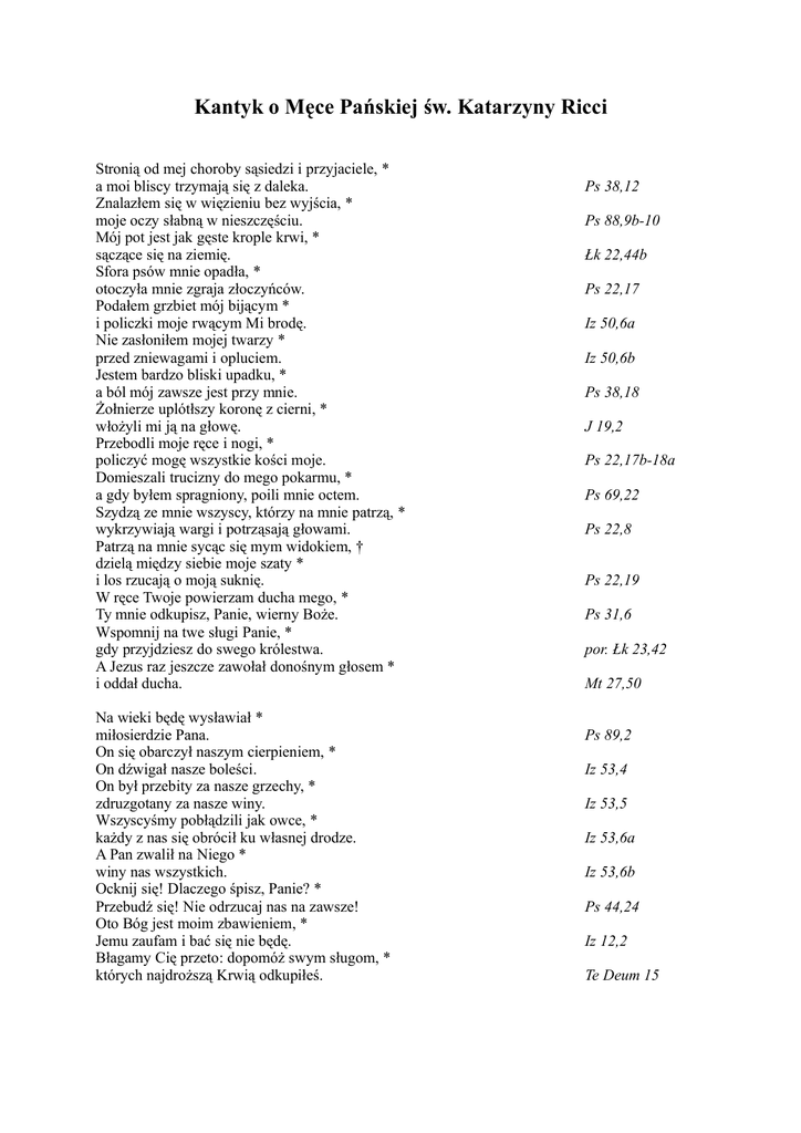Kantyk o Męce Pańskiej św. Katarzyny Ricci Stronią od mej choroby sąsiedzi i przyjaciele, * a moi bliscy trzymają się z daleka. Znalazłem się w więzieniu bez wyjścia, * moje oczy słabną w nieszczęściu. Mój pot jest jak gęste krople krwi, * sączące się na ziemię. Sfora psów mnie opadła, * otoczyła mnie zgraja złoczyńców. Podałem grzbiet mój bijącym * i policzki moje rwącym Mi brodę. Nie zasłoniłem mojej twarzy * przed zniewagami i opluciem. Jestem bardzo bliski upadku, * a ból mój zawsze jest przy mnie. Żołnierze uplótłszy koronę z cierni, * włożyli mi ją na głowę. Przebodli moje ręce i nogi, * policzyć mogę wszystkie kości moje. Domieszali trucizny do mego pokarmu, * a gdy byłem spragniony, poili mnie octem. Szydzą ze mnie wszyscy, którzy na mnie patrzą, * wykrzywiają wargi i potrząsają głowami. Patrzą na mnie sycąc się mym widokiem, † dzielą między siebie moje szaty * i los rzucają o moją suknię. W ręce Twoje powierzam ducha mego, * Ty mnie odkupisz, Panie, wierny Boże. Wspomnij na twe sługi Panie, * gdy przyjdziesz do swego królestwa. A Jezus raz jeszcze zawołał donośnym głosem * i oddał ducha. Na wieki będę wysławiał * miłosierdzie Pana. On się obarczył naszym cierpieniem, * On dźwigał nasze boleści. On był przebity za nasze grzechy, * zdruzgotany za nasze winy. Wszyscyśmy pobłądzili jak owce, * każdy z nas się obrócił ku własnej drodze. A Pan zwalił na Niego * winy nas wszystkich. Ocknij się! Dlaczego śpisz, Panie? * Przebudź się! Nie odrzucaj nas na zawsze! Oto Bóg jest moim zbawieniem, * Jemu zaufam i bać się nie będę. Błagamy Cię przeto: dopomóż swym sługom, * których najdroższą Krwią odkupiłeś. Ps 38,12 Ps 88,9b-10 Łk 22,44b Ps 22,17 Iz 50,6a Iz 50,6b Ps 38,18 J 19,2 Ps 22,17b-18a Ps 69,22 Ps 22,8 Ps 22,19 Ps 31,6 por. Łk 23,42 Mt 27,50 Ps 89,2 Iz 53,4 Iz 53,5 Iz 53,6a Iz 53,6b Ps 44,24 Iz 12,2 Te Deum 15