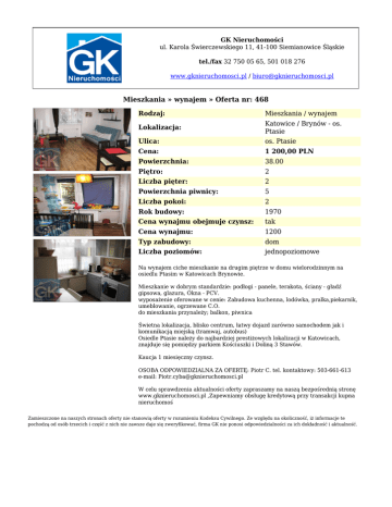 GK Nieruchomości ul. Karola Świerczewskiego 11, 41-100 Siemianowice Śląskie tel./fax 32 750 05 65, 501 018 276 www.gknieruchomosci.pl / [email protected] Mieszkania » wynajem » Oferta nr: 468 Rodzaj: Mieszkania / wynajem Lokalizacja: Katowice / Brynów - os. Ptasie Ulica: os. Ptasie Cena: 1 200,00 PLN Powierzchnia: 38.00 Piętro: 2 Liczba pięter: 2 Powierzchnia piwnicy: 5 Liczba pokoi: 2 Rok budowy: 1970 Cena wynajmu obejmuje czynsz: tak Cena wynajmu: 1200 Typ zabudowy: dom Liczba poziomów: jednopoziomowe Na wynajem ciche mieszkanie na drugim piętrze w domu wielorodzinnym na osiedlu Ptasim w Katowicach Brynowie. Mieszkanie w dobrym standardzie: podłogi - panele, terakota, ściany - gładź gipsowa, glazura, Okna - PCV. wyposażenie oferowane w cenie: Zabudowa kuchenna, lodówka, pralka,piekarnik, umeblowanie, ogrzewane C.O. do mieszkania przynależy; balkon, piwnica Świetna lokalizacja, blisko centrum, łatwy dojazd zarówno samochodem jak i komunikacją miejską (tramwaj, autobus) Osiedle Ptasie należy do najbardziej prestiżowych lokalizacji w Katowicach, znajduje się pomiędzy parkiem Kościuszki i Doliną 3 Stawów. Kaucja 1 miesięczny czynsz. OSOBA ODPOWIEDZIALNA ZA OFERTĘ: Piotr C. tel. kontaktowy: 503-661-613 e-mail: [email protected] W celu sprawdzenia aktualności oferty zapraszamy na naszą bezpośrednią stronę www.gknieruchomosci.pl ,Zapewniamy obsługę kredytową przy transakcji kupna nieruchomoś Zamieszczone na naszych stronach oferty nie stanowią oferty w rozumieniu Kodeksu Cywilnego. Ze względu na okoliczność, iż informacje te pochodzą od osób trzecich i część z nich nie zawsze daje się zweryfikować, firma GK nie ponosi odpowiedzialności za ich dokładność i aktualność.