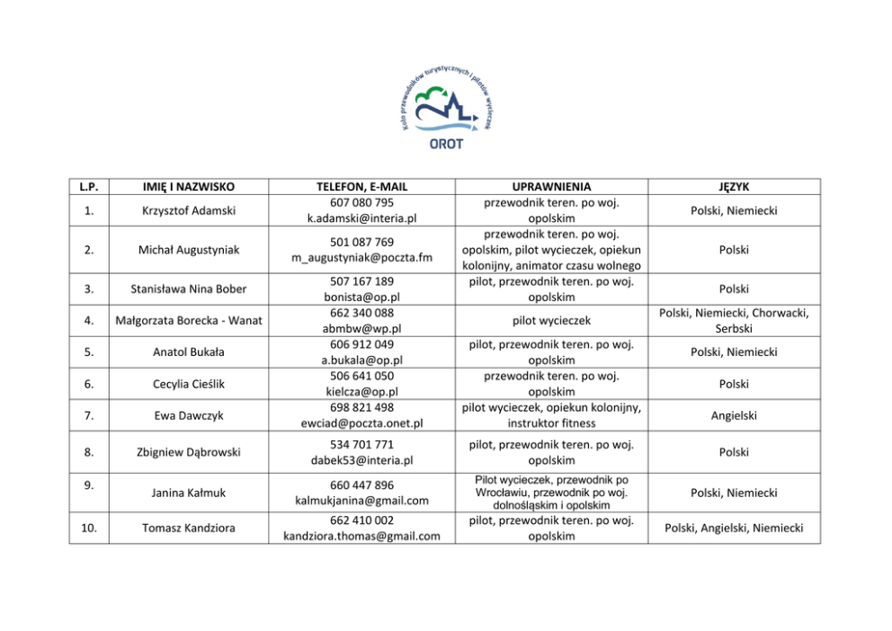 L.P. IMIĘ I NAZWISKO 1. Krzysztof Adamski 2. Michał Augustyniak 3. Stanisława Nina Bober 4. Małgorzata Borecka - Wanat 5. Anatol Bukała 6. Cecylia Cieślik 7. Ewa Dawczyk 8. 9. 10. TELEFON, E-MAIL 607 080 795 [email protected] 501 087 769 [email protected] UPRAWNIENIA przewodnik teren. po woj. opolskim przewodnik teren. po woj. opolskim, pilot wycieczek, opiekun kolonijny, animator czasu wolnego pilot, przewodnik teren. po woj. opolskim JĘZYK Polski, Niemiecki Polski 507 167 189 [email protected] 662 340 088 [email protected] 606 912 049 [email protected] 506 641 050 [email protected] 698 821 498 [email protected] pilot, przewodnik teren. po woj. opolskim przewodnik teren. po woj. opolskim pilot wycieczek, opiekun kolonijny, instruktor fitness Zbigniew Dąbrowski 534 701 771 [email protected] pilot, przewodnik teren. po woj. opolskim Polski Janina Kałmuk 660 447 896 [email protected] Pilot wycieczek, przewodnik po Wrocławiu, przewodnik po woj. dolnośląskim i opolskim Polski, Niemiecki Tomasz Kandziora 662 410 002 [email protected] pilot, przewodnik teren. po woj. opolskim Polski, Angielski, Niemiecki pilot wycieczek Polski Polski, Niemiecki, Chorwacki, Serbski Polski, Niemiecki Polski Angielski 784 493 750 [email protected] przewodnik teren. po woj. opolskim Agnieszka Kreduszyńska Kamionka 692781609 [email protected] 606 136 900 [email protected] 798 700 016 [email protected] przewodnik teren. po woj. opolskim pilot, przewodnik teren. po woj. opolskim przewodnik teren. po woj. opolskim Wojciech Kwiecień 728 515 953 [email protected] 16. Justyna Lis 507 047 867 [email protected] 17. Małgorzata Mazur 18. Henryk Mielcarz 19. Piotr Mielec 11. Małgorzata Konopka 12. Alina Kowarz 13. Felicyta Krawczyk 14. 15. Polski Polski, Niemiecki Polski, Niemiecki Polski, Angielski pilot, przewodnik teren. po woj. opolskim Polski 509 080 872 [email protected] przewodnik teren. po woj. opolskim Polski 608 014 306 [email protected] 502 181 709 przewodnik teren. po woj. opolskim przewodnik teren. po woj. Polski Polski 20. Stefan Muthwill [email protected] 502 475 724 [email protected] opolskim przewodnik teren. po woj. opolskim Polski, Niemiecki Polski, Niemiecki 21. Marcin Nowak 691 342 595 [email protected] pilot, przewodnik teren. po woj. opolskim, przewodnik sudecki, kierownik wycieczek, opiekun kolonijny 22. Eugenia Ogórek 77 4664 40 07 [email protected] Pilot, rezydent biur podróży, wychowawca kolonijny Niemiecki, Czeski Adam Olbert 604 617 680 [email protected] Pilot wycieczek Angielski, Czeski 24. Anna Pilawska 692 934 696 [email protected] 25. Anna Ponisz 26. Jerzy Rudawa 23. 27. Agnieszka Skrzypulec 607 146 930 [email protected] 604 520 403 [email protected] pilot, przewodnik teren. po woj. opolskim, przewodnik miejski po Pradze (Czechy) pilot, przewodnik teren. po woj. opolskim pilot, przewodnik teren. po woj. opolskim 661 917 410 [email protected] przewodnik teren. po woj. opolskim Polski, Czeski Polski, Angielski, Włoski Polski Polski, Niemiecki 28. Paweł Szymkowicz 603 792 221 [email protected] 29. Ewa Światły 605 566 733 [email protected] 30. Ewa Tomaszczyk 697 554 701 [email protected] 31. Magdalena TorowskaMichalak 32. Grzegorz Tymczyszyn 696 667 255 [email protected] 693 873 135 [email protected] pilot, przewodnik teren. po woj. opolskim, Przewodnik terenowy po Dolnym Śląsku, przewodnik górski sudecki, przewodnik miejski po Pradze (Czechy) pilot, przewodnik teren. po woj. opolskim przewodnik teren. po woj. opolskim, przewodnik beskidzki, przewodnik terenowy-małopolska pilot, przewodnik teren. po woj. opolskim pilot, przewodnik teren. po woj. opolskim Polski, Czeski Polski Polski Polski, Angielski, Hiszpański Polski, Angielski