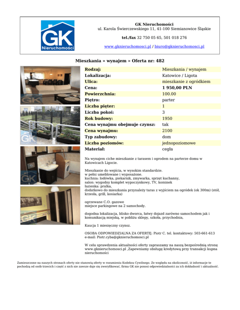 GK Nieruchomości ul. Karola Świerczewskiego 11, 41-100 Siemianowice Śląskie tel./fax 32 750 05 65, 501 018 276 www.gknieruchomosci.pl / [email protected] Mieszkania » wynajem » Oferta nr: 482 Rodzaj: Mieszkania / wynajem Lokalizacja: Katowice / Ligota Ulica: mieszkanie z ogródkiem Cena: 1 950,00 PLN Powierzchnia: 100.00 Piętro: parter Liczba pięter: 1 Liczba pokoi: 3 Rok budowy: 1950 Cena wynajmu obejmuje czynsz: tak Cena wynajmu: 2100 Typ zabudowy: dom Liczba poziomów: jednopoziomowe Materiał: cegła Na wynajem ciche mieszkanie z tarasem i ogrodem na parterze domu w Katowicach Ligocie. Mieszkanie do wejścia, w wysokim standardzie. w pełni umeblowane i wyposażone. kuchnia: lodówka, piekarnik, zmywarka, sprzęt kuchanny, salon: wygodny komplet wypoczynkowy, TV, kominek łazienka: pralka, dodatkowo do mieszkania przynależy taras z wyjściem na ogródek (ok 300m) (stół, krzesła, grill, kosiarka) ogrzewane C.O. gazowe miejsce parkingowe na 2 samochody. dogodna lokalizacja, blisko dworca, łatwy dojazd zarówno samochodem jak i komunikacją miejską, w pobliżu sklepy, szkoła, przychodnia, Kaucja 1 miesięczny czynsz. OSOBA ODPOWIEDZIALNA ZA OFERTĘ: Piotr C. tel. kontaktowy: 503-661-613 e-mail: [email protected] W celu sprawdzenia aktualności oferty zapraszamy na naszą bezpośrednią stronę www.gknieruchomosci.pl ,Zapewniamy obsługę kredytową przy transakcji kupna nieruchomości Zamieszczone na naszych stronach oferty nie stanowią oferty w rozumieniu Kodeksu Cywilnego. Ze względu na okoliczność, iż informacje te pochodzą od osób trzecich i część z nich nie zawsze daje się zweryfikować, firma GK nie ponosi odpowiedzialności za ich dokładność i aktualność.