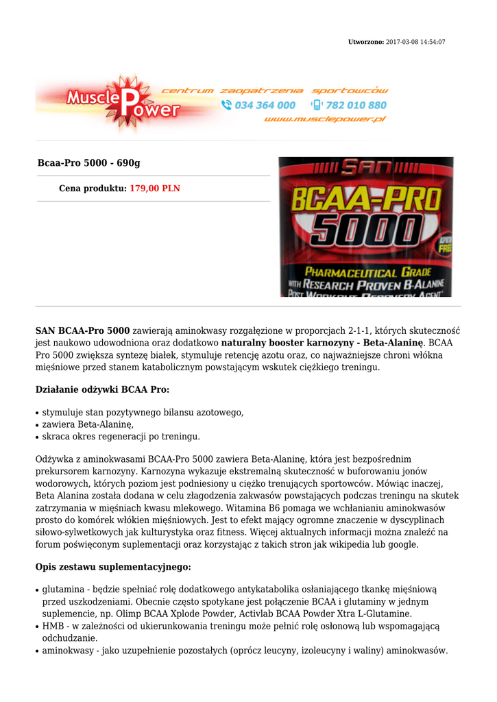 Utworzono: 2017-03-08 14:54:07 Bcaa-Pro 5000 - 690g Cena produktu: 179,00 PLN SAN BCAA-Pro 5000 zawierają aminokwasy rozgałęzione w proporcjach 2-1-1, których skuteczność jest naukowo udowodniona oraz dodatkowo naturalny booster karnozyny - Beta-Alaninę. BCAA Pro 5000 zwiększa syntezę białek, stymuluje retencję azotu oraz, co najważniejsze chroni włókna mięśniowe przed stanem katabolicznym powstającym wskutek ciężkiego treningu. Działanie odżywki BCAA Pro: ● ● ● stymuluje stan pozytywnego bilansu azotowego, zawiera Beta-Alaninę, skraca okres regeneracji po treningu. Odżywka z aminokwasami BCAA-Pro 5000 zawiera Beta-Alaninę, która jest bezpośrednim prekursorem karnozyny. Karnozyna wykazuje ekstremalną skuteczność w buforowaniu jonów wodorowych, których poziom jest podniesiony u ciężko trenujących sportowców. Mówiąc inaczej, Beta Alanina została dodana w celu złagodzenia zakwasów powstających podczas treningu na skutek zatrzymania w mięśniach kwasu mlekowego. Witamina B6 pomaga we wchłanianiu aminokwasów prosto do komórek włókien mięśniowych. Jest to efekt mający ogromne znaczenie w dyscyplinach siłowo-sylwetkowych jak kulturystyka oraz fitness. Więcej aktualnych informacji można znaleźć na forum poświęconym suplementacji oraz korzystając z takich stron jak wikipedia lub google. Opis zestawu suplementacyjnego: ● ● ● glutamina - będzie spełniać rolę dodatkowego antykatabolika osłaniającego tkankę mięśniową przed uszkodzeniami. Obecnie często spotykane jest połączenie BCAA i glutaminy w jednym suplemencie, np. Olimp BCAA Xplode Powder, Activlab BCAA Powder Xtra L-Glutamine. HMB - w zależności od ukierunkowania treningu może pełnić rolę osłonową lub wspomagającą odchudzanie. aminokwasy - jako uzupełnienie pozostałych (oprócz leucyny, izoleucyny i waliny) aminokwasów. ● Aminokwasy proste, tzw. całodzienne stosowane są głównie do posiłków. kreatyna - odgrywa rolę stymulanta anabolicznego. Kreatyna może być przyjmowana jako standardowy monohydrat lub w formach złożonych, jako: jabłczan kreatyny, pirogronian kreatyny, kre alkalyn, stak kreatynowy, itd... BCAA i kreatyna to tanie połączenie zapewniające szybką budowę trwałej muskulatury. Skład: Porcja: 6.9 g Porcji w opakowaniu: 100 Opakowanie: 690 g Wartość odżywcza w 1 porcji L-Leucyna 2500 mg L-Izoleucyna 1250 mg L-Walina 1250 mg Witamina B6 2 mg Mikronizowana Beta Alanina 750 mg Dawkowanie: Przyjmować w zależności od zapotrzebowania od jednej do trzech porcji dziennie. Dawkowanie BCAA powinno przebiegać w sposób następujący: przed i po treningu i/lub z posiłkami. Adres: http://www.muscle.trustnet.pl/ Telefon: 34 36 43 000, 782 010 880 Email: [email protected]