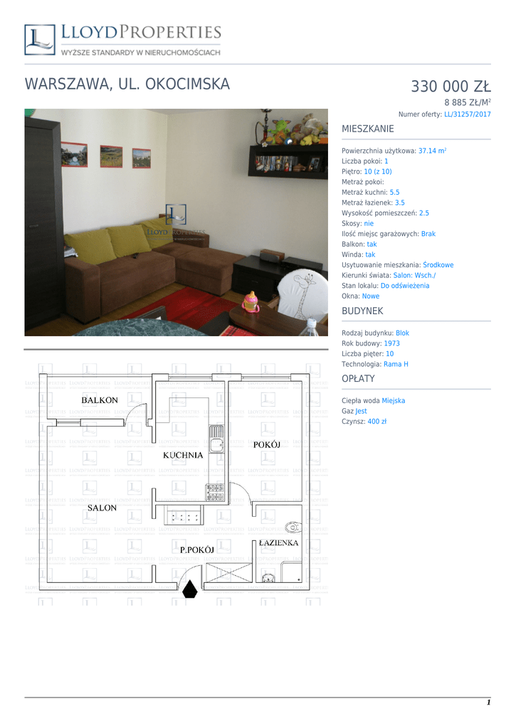 WARSZAWA, UL. OKOCIMSKA 330 000 ZŁ 8 885 ZŁ/M2 Numer oferty: LL/31257/2017 MIESZKANIE Powierzchnia użytkowa: 37.14 m2 Liczba pokoi: 1 Piętro: 10 (z 10) Metraż pokoi: Metraż kuchni: 5.5 Metraż łazienek: 3.5 Wysokość pomieszczeń: 2.5 Skosy: nie Ilość miejsc garażowych: Brak Balkon: tak Winda: tak Usytuowanie mieszkania: Środkowe Kierunki świata: Salon: Wsch./ Stan lokalu: Do odświeżenia Okna: Nowe BUDYNEK Rodzaj budynku: Blok Rok budowy: 1973 Liczba pięter: 10 Technologia: Rama H OPŁATY Ciepła woda Miejska Gaz Jest Czynsz: 400 zł 1 Wojciech Zygmunt Property Expert + 48 533 300 906 [email protected] OPIS Bardzo ładne dwupokojowe mieszkanie usytuowane na dziesiątym piętrze w dziesięciopiętrowym budynku. Kuchnia częściowo otwarta na salon, z oknem o ekspozycji wschodniej. Mieszkanie rozkładowe, pokoje ustawne. W upalne dni mieszkanie nie nagrzewa się. W bliskiej odległości Centrum Handlowe Wola Park, osiedlowy bazarek, szkoła podstawowa, gimnazjum. Lokalizacja mieszkania to jeden z najbardziej pożądanych punktów Woli. Ulica Górczewska zapewnia świetną komunikację z centrum miasta, natomiast bezpośrednia bliskość 3 Parków sprawia, że odczuwa się tu klimat spokojnej, zielonej Woli. W bezpośrednim sąsiedztwie znajdziemy liczne placówki oświatowe, ośrodki sportu, basen i przede wszystkim ścieżki rowerowe, miejsca do biegania i spacerów. A dla miłośników bardziej wyczynowych sportów – oddaloną o 25 min spacerem, jedną z wyższych w Warszawie ściankę do wspinaczki w hali sportowej na ul. Obozowej. Blok z lat 70. Na przestrzeni ostatnich lat poddany gruntownym remontom (wymiana instalacji wod-kan, C.O, elektryka na klatce, ocieplony, nowa elewacja, remoncie dachu oraz wymianie rynien), nowa winda. 2
