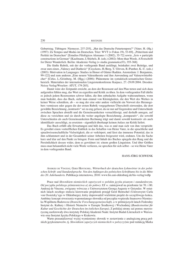230 RECENZJE Geburtstag. Tübingen: Niemeyer, 237-255], „Hat das Deutsche Futurtempora?“ [Vater, H. (Hg.) (1997): Zu Tempus und Modus im Deutschen. Trier: WVT (= Fokus 19), 53-69], „Präteritum und Perfekt im Deutschen“ [Estudios Filológicos Alemanes 1 (2002), 35-72] sowie „Sein + participle constructions in German“ [Kaufmann, I./Stiebels, B. (eds.) (2002): More than Words. A Festschrift for Dieter Wunderlich. Berlin: Akademie-Verlag (= studia grammatica53), 355-368]. Die fünfte Rubrik, mit der der vorliegende Band ausklingt, beinhaltet zwei Beiträge, und zwar zum einen „Valency and Diathesis“ [Cuyckens, H./Berg, T./ Dirven, R./Panther, K.-U. (eds.) (2003): Motivation in Languages: Studies in Honor of Günter Radden. Amsterdam: J. Benjamins, 99-122] und zum anderen „Eine neuere Valenztheorie und ihre Anwendung auf Valenzwörterbücher“ [Cirko, L./Grimberg, M. (Hgg.) (2006): Phänomene im syntaktisch-semantischen Grenzbereich. Materialien der internationalen Linguistenkonferenz Karpacz, 27.-29.09.2004. Dresden: Neisse Verlag/Wrocław: ATUT, 179-203]. Damit wäre der Zeitpunkt erreicht, an dem der Rezensent auf den Plan treten und sich dazu aufgerufen fühlen mag, das Wort zu ergreifen und Kritik zu üben. In dem vorliegenden Fall dürfte es jedoch jedem Rezensenten schwer fallen, die ihm zubedachte Aufgabe wahrzunehmen, wenn man bedenkt, dass das Buch, sieht man einmal von Kleinigkeiten, die den Wert des Werkes in keiner Weise schmälern, ab – so mag der eine oder andere vielleicht ein Vorwort des Herausgebers vermissen oder gegen die der ersten Rubrik vorgegebenen Überschrift einwenden, die dort gewählte Bezeichnung „kontrastiv“ sei zu eng gefasst, da sie nur auf Gegensätze und Unterschiede zwischen Sprachen abstellt und die Gemeinsamkeiten vernachlässigt, und deshalb anregen, auf diese zu verzichten und sie durch die weiter angelegte Bezeichnung „komparativ“, die sowohl Unterschieden als auch Gemeinsamkeiten Rechnung trägt und damit sowohl kontrastiv als auch identifikativ ausschlägt, zu ersetzten - eigentlich überhaupt keinen Anlass zur Kritik liefert. Das Buch erfüllt alle Erwartungen und hält das, was es und man sich von ihm verspricht: Es gewährt einen vortrefflichen Einblick in das Schaffen von Heinz Vater, in die sprachliche und sprachwissenschaftliche Vielseitigkeit, die er verkörpert, und lässt das immense Potential, das in ihm schlummert und in der Gesamtheit seiner Arbeiten freigesetzt wird, erahnen. Um die Sache kurz und klar auf den Punkt zu bringen: Form und Inhalt des Buches spiegeln den Rang und die Persönlichkeit dessen wider, dem es gewidmet ist: einem großen Linguisten. Und über Größen muss man bekanntlich nicht viele Worte verlieren, sie sprechen für sich selbst – so wie Heinz Vater in dem vorliegenden Band. HANS-JÖRG SCHWENK ANDRZEJ DE VINCENZ, GERD HENTSCHEL. Wörterbuch der deutschen Lehnwörter in der polnischen Schrift- und Standardsprache. Von den Anfängen des polnischen Schrifttums bis in die Mitte des 20. Jahrhunderts. Publikacja internetowa, 2010: www.bis.uni-oldenburg.de/bis-verlag/wdlp Prace nad Słownikiem niemieckich zapożyczeń w polskim języku pisanym i standardowym. Od początku polskiego piśmiennictwa aż do połowy XX w. zainicjował na przełomie lat 70. i 80. Andrzej de Vincenz, związany wówczas z Uniwersytetem Georga Augusta w Getyndze. W ostatnich latach zeszłego stulecia kierowanie projektem przejął Gerd Hentschel (Uniwersytet Carla von Ossietzky’ego w Oldenburgu), który doprowadził wieloletni projekt do szczęśliwego końca. Ambitny koncept stworzenia wspomnianego słownika od początku wspierała finansowo Niemiecka Wspólnota Badawcza (Deutsche Forschungsgemeinschaft), a w późniejszych latach Federalny Instytut ds. Kultury i Historii Niemców w Europie Środkowej i Wschodniej (Bundesinstitut für Kultur und Geschichte der Deutschen im östlichen Europa). Z polskiej strony zaś pomoc merytoryczną zaoferowały dwa instytuty Polskiej Akademii Nauk: Instytut Badań Literackich w Warszawie oraz Instytut Języka Polskiego w Krakowie. Warto przeanalizować wyżej wymieniony słownik w zestawieniu z analogiczną pracą polskich językoznawców, tj. Słownikiem zapożyczeń niemieckich w polszczyźnie pod redakcją Marka RECENZJE 231 Łazińskiego, który ukazał się w 2008 roku, w Warszawie, nakładem Wydawnictwa Naukowego PWN. Gwoli wyjaśnienia należy nadmienić, że M. Łaziński w przedsłowiu publikacji PWN wspomina o – jeszcze wówczas nieukończonym – projekcie A. de Vincenza. Dziwić może natomiast fakt, iż próżno szukać podobnej wzmianki w pracy badaczy z Oldenburga, choć leksykon naszych rodzimych polonistów ukazał się dwa lata przed dziełem niemieckich językoznawców. Mimo że oba słowniki zawierają podobną liczbę haseł – niemiecki 2444, zaś polski ok. 2100, to zamieszczone w nich lemmy nie pokrywają się w pełni. Jest to spowodowane tym, iż autorzy różnie definiują zjawisko zapożyczenia językowego. De Vincenz i Hentschel uznają za zapożyczenia z języka niemieckiego w polszczyźnie tylko bezpośrednie pożyczki (z języka niemieckiego do języka polskiego). Tym samym pomijają tzw. kalki językowe oraz lemmy, w przypadku których język niemiecki występował jedynie jako pośrednik (ten casus obrazuje np. słowo inspicjent, które język polski przejął od niemieckiego Inspizient, te zaś pochodzi od łacińskiego inspicere oznaczającego doglądać). Z kolei Łaziński rozróżnia lemmy o źródłosłowie niemieckim i równoległym francuskim bądź angielskim (np. ekscelencja, dżungla) oraz te internacjonalizmy, których etymologia bezspornie jest niemiecka (np. uniwersytet, wata, cukier). Pierwszą z tych grup pomija, zaś drugą – jako pożyczkę z niemczyzny – umieszcza w swym leksykonie. Następna rozbieżność między omawianymi publikacjami wynika z korpusu badawczego. Niemieccy poloniści skoncentrowali swe wysiłki n