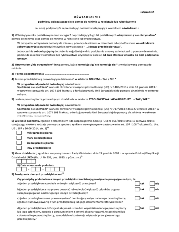 załącznik 3A OŚWIADCZENIE podmiotu ubiegającego się o pomoc de minimis w rolnictwie lub rybołówstwie Ja niżej podpisany/a reprezentując podmiot występujący z wnioskiem oświadczam : 1) W bieżącym roku podatkowym oraz w ciągu 2 poprzedzających go lat podatkowych otrzymałem / nie otrzymałem* pomoc de minimis oraz pomoc de minimis w rolnictwie lub rybołówstwie. W przypadku otrzymania pomocy de minimis, pomocy de minimis w rolnictwie lub rybołówstwie wnioskodawca zobowiązany jest przedłożyć wszystkie zaświadczenia – „jednego przedsiębiorstwa”. Jednocześnie zobowiązuję się do złożenia najpóźniej w dniu podpisania umowy zaświadczeń o pomocy de minimis, pomoc de minimis w rolnictwie lub rybołówstwie uzyskanej w okresie od dnia złożenia wniosku do dnia podpisania umowy. 2) Otrzymałem /nie otrzymałem* inną pomoc, która kumuluje się/ nie kumuluje się * z wnioskowaną pomocą de minimis. 3) Forma opodatkowania …………………………………………………….. 4) Jestem przedsiębiorcą prowadzącym działalność w sektorze ROLNYM – TAK / NIE * W przypadku odpowiedzi twierdzącej oświadczam: Spełniam/ nie spełniam* warunki określone w rozporządzeniu Komisji (UE) nr 1408/2013 z dnia 18 grudnia 2013 r. w sprawie stosowania art. 107 i 108 Traktatu o funkcjonowaniu Unii Europejskiej do pomocy de minimis w sektorze rolnym. 5) Jestem przedsiębiorcą prowadzącym działalność w sektorze RYBOŁÓWSTWA I AKWAKULTURY – TAK / NIE * W przypadku odpowiedzi twierdzącej oświadczam: Spełniam/ nie spełniam* warunki określone w rozporządzeniu Komisji (UE) nr 717/2014 z dnia 27 czerwca 2014 r. w sprawie stosowania art. 107 i 108 Traktatu o funkcjonowaniu Unii Europejskiej do pomocy de minimis w sektorze rybołówstaw i akwakultury. 6) Wielkość podmiotu, zgodnie z załącznikiem I do rozporządzenia Komisji (UE) nr 651/2014 z dnia 17 czerwca 2014 r. uznającego niektóre rodzaje pomocy za zgodne z rynkiem wewnętrznym w zastosowaniu art. 107 i 108 Traktatu (Dz. Urz. UE L 187 z 26.06.2014, str. 1)1) mikroprzedsiębiorca mały przedsiębiorca średni przedsiębiorca inny przedsiębiorca 7) Klasa działalności, zgodnie z rozporządzeniem Rady Ministrów z dnia 24 grudnia 2007 r. w sprawie Polskiej Klasyfikacji Działalności (PKD) (Dz. U. Nr 251, poz. 1885, z późn. zm.)2) 8) Data utworzenia podmiotu - - 9) Powiązania z innymi przedsiębiorcami3) Czy pomiędzy podmiotem a innymi przedsiębiorcami istnieją powiązania polegające na tym, że: a) jeden przedsiębiorca posiada w drugim większość praw głosu? tak nie b) jeden przedsiębiorca ma prawo powołać lub odwołać większość członków organu zarządzającego lub nadzorującego innego przedsiębiorcy? tak nie c) jeden przedsiębiorca ma prawo wywierać dominujący wpływ na innego przedsiębiorcę zgodnie z umową zawartą z tym przedsiębiorcą lub jego dokumentami założycielskimi? tak nie d) jeden przedsiębiorca, który jest akcjonariuszem lub wspólnikiem innego przedsiębiorcy lub jego członkiem, zgodnie z porozumieniem z innymi akcjonariuszami, wspólnikami lub członkami tego przedsiębiorcy, samodzielnie kontroluje większość praw głosu u tego przedsiębiorcy? tak nie e) przedsiębiorca pozostaje w jakimkolwiek ze stosunków opisanych powyżej poprzez jednego innego przedsiębiorcę lub kilku innych przedsiębiorców? tak nie W przypadku zaznaczenia przynajmniej jednej odpowiedzi twierdzącej, należy podać: a) identyfikator podatkowy NIP wszystkich powiązanych z podmiotem przedsiębiorców b) łączną wartość pomocy de minimis udzielonej w bieżącym roku podatkowym oraz w dwóch poprzedzających latach podatkowych wszystkim powiązanym z podmiotem przedsiębiorcom4) 10) Informacja o utworzeniu wnioskodawcy w wyniku podziału innego przedsiębiorcy lub połączenia z innym przedsiębiorcą, w tym przez przejęcie innego przedsiębiorcy Czy podmiot w ciągu bieżącego roku podatkowego oraz w okresie dwóch poprzedzających lat podatkowych: a) powstał wskutek połączenia się innych przedsiębiorców? tak nie b) przejął innego przedsiębiorcę? tak nie c) powstał w wyniku podziału innego przedsiębiorcy? tak nie W przypadku zaznaczenia odpowiedzi twierdzącej w lit. a) lub b) należy podać: a) identyfikator podatkowy NIP wszystkich połączonych lub przejętych przedsiębiorców b) łączną wartość pomocy de minimis udzielonej w bieżącym roku podatkowym oraz w dwóch poprzedzających latach podatkowych wszystkim połączonym lub przejętym przedsiębiorcom4) W przypadku zaznaczenia odpowiedzi twierdzącej w lit. c) należy podać: a) identyfikator podatkowy NIP przedsiębiorcy przed podziałem b) łączną wartość pomocy de minimis udzielonej w bieżącym roku podatkowym oraz w dwóch poprzedzających latach podatkowych przedsiębiorcy istniejącemu przed podziałem w odniesieniu do działalności przejmowanej przez podmiot4) Jeśli nie jest możliwe ustalenie, jaka część pomocy de minimis uzyskanej przez przedsiębiorcę przed podziałem przeznaczona była na działalność przejętą przez podmiot, należy podać: – łączną wartość pomocy de minimis udzielonej w bieżącym roku podatkowym oraz w dwóch poprzedzających latach podatkowych przedsiębiorcy 4) przed podziałem – wartość kapitału przedsiębiorcy przed podziałem – wartość kapitału podmiotu na moment podziału Data i podpis wnioskodawcy 1) Zaznacza się właściwą pozycję znakiem X. 2) Podaje się klasę działalności, w związku z którą podmiot ubiega się o pomoc de minimis. Jeżeli brak jest możliwości ustalenia jednej takiej działalności, podaje się klasę PKD tej działalności, która generuje największy przychód. 3) Za powiązane nie uważa się podmiotów, w przypadku których powiązanie występuje wyłącznie za pośrednictwem organu publicznego, np. Skarbu Państwa, jednostki samorządu terytorialnego. 4) Podaje się wartość pomocy w