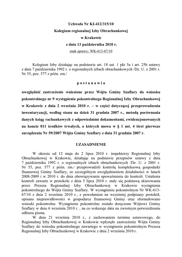 Uchwała Nr KI-412/315/10 Kolegium regionalnej Izby Obrachunkowej w Krakowie z dnia 13 października 2010 r. znak sprawy: WK-613-67/10 Kolegium Izby działając na podstawie art. 18 ust. 1 pkt 5a i art. 25b ustawy z dnia 7 października 1992 r. o regionalnych izbach obrachunkowych /Dz. U. z 2001 r. Nr 55, poz. 577 z późn. zm./ postanawia uwzględnić zastrzeżenie wniesione przez Wójta Gminy Szaflary do wniosku pokontrolnego nr 9 wystąpienia pokontrolnego Regionalnej Izby Obrachunkowej w Krakowie z dnia 2 września 2010 r. – w części dotyczącej przeprowadzenia inwentaryzacji, według stanu na dzień 31 grudnia 2007 r., metodą porównania danych ksiąg rachunkowych z odpowiednimi dokumentami, ewidencjonowanych na koncie 011 środków trwałych, o których mowa w § 1 ust. 4 tiret pierwsze zarządzenia Nr 59/2007 Wójta Gminy Szaflary z dnia 31 grudnia 2007 r. UZASADNIENIE W okresie od 12 maja do 2 lipca 2010 r. inspektorzy Regionalnej Izby Obrachunkowej w Krakowie, działając na podstawie przepisów ustawy z dnia 7 października 1992 r. o regionalnych izbach obrachunkowych /Dz. U. z 2001 r. Nr 55, poz. 577 z późn. zm./ przeprowadzili kontrolę kompleksową gospodarki finansowej Gminy Szaflary, ze szczególnym uwzględnieniem działalności w latach 2008-2009 i w 2010 r. do dnia obowiązywania upoważnienia do kontroli. Ustalenia kontroli zawarte w protokole z dnia 5 lipca 2010 r. stały się podstawą skierowania przez Prezesa Regionalnej Izby Obrachunkowej w Krakowie wystąpienia pokontrolnego do Wójta Gminy Szaflary. W wystąpieniu pokontrolnym Nr WK-61367/10 z dnia 2 września 2010 r., z powołaniem na wcześniej podpisany protokół, opisano nieprawidłowości w gospodarce finansowej Gminy oraz sformułowano wnioski pokontrolne. Wystąpienie pokontrolne zostało doręczone Wójtowi Gminy Szaflary w dniu 6 września 2010 r. , na co wskazuje data na zwrotnym potwierdzeniu odbioru pisma. W dniu 21 września 2010 r., z zachowaniem terminu ustawowego, do Regionalnej Izby Obrachunkowej w Krakowie wpłynęło zastrzeżenie Wójta Gminy Szaflary do wniosku pokontrolnego zawartego w wystąpieniu pokontrolnym Prezesa Regionalnej Izby Obrachunkowej w Krakowie z dnia 2 września 2010 r. Zastrzeżenie Wójta Gminy Szaflary, zawarte w piśmie Nr PF/0717/79/2010 z dnia 20 września 2010 r. dotyczy wniosku pokontrolnego numer 9. Rozpatrując zastrzeżenie zgłoszone przez Wójta Gminy Szaflary pismem z dnia 20 września 2010 r. – Kolegium Izby po zapoznaniu się z treścią pisma, treścią wystąpienia pokontrolnego Regionalnej Izby Obrachunkowej w Krakowie z dnia 2 września 2010 r. i zawartych w nim wniosków pokontrolnych oraz z protokołem z kontroli kompleksowej gospodarki finansowej Gminy Szaflary, stwierdziło co następuje: Wniosek pokontrolny nr 9 brzmi: Przeprowadzanie inwentaryzacji składników majątkowych Gminy w sposób zgodny z postanowieniami art. 26 ustawy z dnia 29 września 1994 r. o rachunkowości /tekst jednolity Dz. U. z 2009 r. Nr 152, poz. 1223 z późn. zm./, a zwłaszcza dokonywanie inwentaryzacji środków trwałych, do których dostęp nie jest znacznie utrudniony, metodą spisu z natury. Wniosek tej treści sformułowany został w związku z przedstawionym w wystąpieniu pokontrolnym opisem nieprawidłowości, dokonanym w wyniku ustaleń kontroli. Nieprawidłowość ta polegała na – cyt. „przeprowadzeniu inwentaryzacji środków trwałych ewidencjonowanych na koncie 011 według stanu na dzień 31 grudnia 2007 r. metodą porównania danych ksiąg rachunkowych z odpowiednimi dokumentami, zamiast metodą spisu z natury, co stanowi naruszenie postanowień art. 26 ust. 1 pkt 1 w związku z art. 26 ust. 3 pkt 3 ustawy z dnia 29 września 1994 r. o rachunkowości”. W zgłoszonym zastrzeżeniu Wójt Gminy Szaflary podniósł, że inwentaryzację środków trwałych metodą porównania danych ksiąg rachunkowych z odpowiednimi dokumentami, zamiast metodą spisu z natury, przeprowadzono na podstawie zarządzenia Wójta Gminy Szaflary Nr 59/2007 z 31 grudnia 2007 r. zmieniającego § 2 zarządzenia Wójta Gminy Szaflary Nr 46/2007 z dnia 30 października 2007 r., na podstawie rozporządzenia Ministra Finansów z dnia 26 lipca 2006 r. /winno być 28 lipca – przyp. KI/ w sprawie szczególnych zasad rachunkowości oraz planów kont dla budżetu państwa, budżetów jednostek samorządu terytorialnego oraz niektórych jednostek sektora finansów publicznych /Dz. U. Nr 142, poz. 1020, z 2008 r. Nr 72, poz. 422/. Zdaniem zgłaszającego zastrzeżenie § 3, § 5 ust. 7 i § 21 powyższego rozporządzenia, jako przepisy szczególne, umożliwiały przeprowadzenie inwentaryzacji w sposób określony w przyjętych przez jednostkę zasadach rachunkowości. Zastrzeżenie Wójta Gminy do opisanego wyżej wniosku pokontrolnego Nr 9 sprowadza się zatem do zarzutu uznania – w wystąpieniu pokontrolnym – za niewłaściwą, metodę według której przeprowadzono inwentaryzację ewidencjonowanych na koncie 011 środków trwałych, o których mowa w § 1 ust. 4 tiret pierwsze zarządzenia Nr 59/2007 Wójta Gminy Szaflary z dnia 31 grudnia 2007 r. tj. gruntów i środków trwałych trudno dostępnych oglądowi, budowli, w tym: drogowych. Odnosząc się do zgłoszonego zastrzeżenia Kolegium Izby stwierdza: Stosownie do art. 4 ust. 1 ustawy z dnia 29 września 1994 r. o rachunkowości /Dz. U. z 2009 r. Nr 152, poz. 1223 z późn. zm./ podmioty i osoby określone w art. 2 ust. 1 tej ustawy, w tym gminy, obowiązane są stosować przyjęte zasady / politykę/ rachunkowości, rzetelnie i jasno przedstawiając sytuację majątkową i finansową oraz wynik finansowy. Rachunkowość, zgodnie z ust. 3 tego artykułu, obejmuje m.in. okresowe ustalanie lub sprawdzanie drogą inwentaryzacji rzeczywistego stanu aktywów i pasywów. Obowiązujące w okresie, którego dotyczyła kontrola gospodarki finansowej Gminy Szaflary, szczególne zasady rachunkowości oraz plany kont dla budżetu