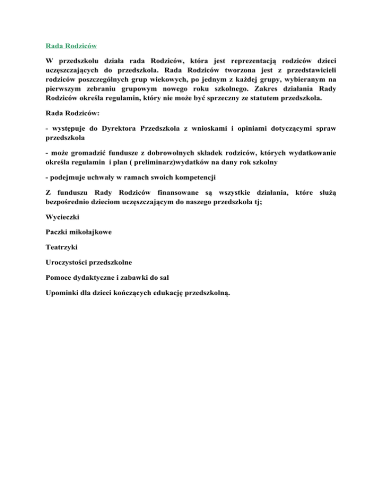 Rada Rodziców W przedszkolu działa rada Rodziców, która jest