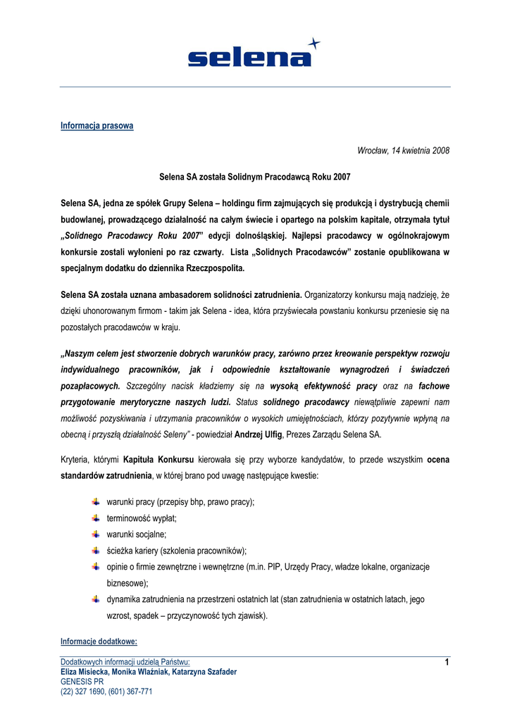 Informacja prasowa Wrocław, 14 kwietnia 2008 Selena SA została Solidnym Pracodawcą Roku 2007 Selena SA, jedna ze spółek Grupy Selena – holdingu firm zajmujących się produkcją i dystrybucją chemii budowlanej, prowadzącego działalność na całym świecie i opartego na polskim kapitale, otrzymała tytuł „Solidnego Pracodawcy Roku 2007” edycji dolnośląskiej. Najlepsi pracodawcy w ogólnokrajowym konkursie zostali wyłonieni po raz czwarty. Lista „Solidnych Pracodawców” zostanie opublikowana w specjalnym dodatku do dziennika Rzeczpospolita. Selena SA została uznana ambasadorem solidności zatrudnienia. Organizatorzy konkursu mają nadzieję, Ŝe dzięki uhonorowanym firmom - takim jak Selena - idea, która przyświecała powstaniu konkursu przeniesie się na pozostałych pracodawców w kraju. „Naszym celem jest stworzenie dobrych warunków pracy, zarówno przez kreowanie perspektyw rozwoju indywidualnego pracowników, jak i odpowiednie kształtowanie wynagrodzeń i świadczeń pozapłacowych. Szczególny nacisk kładziemy się na wysoką efektywność pracy oraz na fachowe przygotowanie merytoryczne naszych ludzi. Status solidnego pracodawcy niewątpliwie zapewni nam moŜliwość pozyskiwania i utrzymania pracowników o wysokich umiejętnościach, którzy pozytywnie wpłyną na obecną i przyszłą działalność Seleny” - powiedział Andrzej Ulfig, Prezes Zarządu Selena SA. Kryteria, którymi Kapituła Konkursu kierowała się przy wyborze kandydatów, to przede wszystkim ocena standardów zatrudnienia, w której brano pod uwagę następujące kwestie: warunki pracy (przepisy bhp, prawo pracy); terminowość wypłat; warunki socjalne; ścieŜka kariery (szkolenia pracowników); opinie o firmie zewnętrzne i wewnętrzne (m.in. PIP, Urzędy Pracy, władze lokalne, organizacje biznesowe); dynamika zatrudnienia na przestrzeni ostatnich lat (stan zatrudnienia w ostatnich latach, jego wzrost, spadek – przyczynowość tych zjawisk). Informacje dodatkowe: Dodatkowych informacji udzielą Państwu: Eliza Misiecka, Monika Wlaźniak, Katarzyna Szafader GENESIS PR (22) 327 1690, (601) 367-771 1 Grupa Selena to holding spółek zajmujących się produkcją i dystrybucją chemii budowlanej, prowadzący działalność na całym świecie i oparty na polskim kapitale. W skład Grupy wchodzi 25 spółek, w tym 17 podmiotów zagranicznych oraz 9 nowoczesnych zakładów produkcyjnych (4 zakłady w Polsce, po jednym we Włoszech, w Brazylii, Korei, Chinach oraz USA). Grupa Selena jest - pod względem wielkości - czwartym na świecie producentem piany poliuretanowej uŜywanej do montaŜu okien i drzwi. Grupa Selena systematycznie zwiększa sprzedaŜ zagraniczną, która w 2006 roku stanowiła 65,5% przychodów. Realizuje zamówienia na rynkach ponad 50 państw, w tym przez własne spółki handlowe zlokalizowane w 15 krajach (Polska, Rosja, Czechy, Finlandia, Kazachstan, Ukraina, Bułgaria, Rumunia, Węgry, Niemcy, Włochy, Brazylia, USA, Korea Płd. i Chiny). Ponadto, Grupa Selena planuje umacnianie pozycji w regionach: Azji Południowo-Wschodniej (Chiny), Bliskiego Wschodu (Turcja i Egipt oraz petrokraje Półwyspu Arabskiego), Ameryki Południowej (Argentyna), Ameryki Północnej (Kanada oraz Meksyk) oraz dalszą ekspansję na nowe rynki zagraniczne. Grupa Selena oferuje szeroką gamę produktów przeznaczonych zarówno dla profesjonalnych wykonawców, jak i uŜytkowników indywidualnych - główne marki to TYTAN oraz ARTELIT. Pozycja rynkowa Kluczowym elementem strategii Grupy Selena jest jakość. Pojęcie "przewaga dzięki produktowi" oznacza, Ŝe w kaŜdej kategorii produktów Grupa Selena dąŜy do tego, aby jej wyroby miały najwyŜszą pozycję jakościową. Taka strategia zapewnia wysoki poziom zaufania klientów do produktów i procentuje w przyznawanych spółce licznych wyróŜnieniach. Pozycja Grupy Selena w Polsce: 1. Lider w kategorii pian: 37% udział w rynku (w ujęciu wartościowym oraz ilościowym). 2. Drugie miejsce w kategorii uszczelniaczy: 19% udział w rynku. Działalność Grupy Selena obejmuje wszystkie etapy tworzenia produktów: począwszy od zaawansowanych badań, przez produkcję, dystrybucję, marketing, aŜ po sprzedaŜ na całym świecie. Na kaŜdym etapie kreowania produktów Selena gwarantuje innowacyjne rozwiązania, które zapewniają utrzymanie najwyŜszych, światowych standardów, potwierdzonych licznymi nagrodami i międzynarodowymi certyfikatami jakości. Wysoką jakość produktów Seleny potwierdzają prestiŜowe nagrody i certyfikaty renomowanych instytucji. W styczniu 2008 roku Grupa Selena otrzymała tytuł „Tego, który zmienia polski przemysł” - przyznawany przez Miesięcznik Gospodarczy „Nowy Przemysł” - za skuteczną ekspansję zagraniczną, stworzenie najwyŜszej jakości produktów i wypromowanie marek w branŜy, w której dominuje silna konkurencja. Nagrody otrzymane w 2007 roku: Dodatkowych informacji udzielą Państwu: Eliza Misiecka, Monika Wlaźniak, Katarzyna Szafader GENESIS PR (22) 327 1690, (601) 367-771 2 • prestiŜowa nagroda „Gazela Biznesu” - wyróŜnienie przyznawane dynamicznie rozwijającym się spółkom krajowym, które notują stabilny wzrost przychodów, a dla swoich klientów są wiarygodnym i rzetelnym partnerem biznesowym, • tytuł Europrodukt dla Uniwersalnej Emulsji Gruntującej Tytan Grunt w ogólnopolskim konkursie pod patronatem Ministerstwa Gospodarki i Polskiej Agencji Rozwoju Przedsiębiorczości, • Nagroda Budowlanej Marki Roku 2006 - przyznaną na Targach Budma 2007, • do portfolio nagród przyznawanych przez międzynarodowe kapituły spółka dołączyła otrzymany na targach w Construct Expo Ambient 2007 w Rumunii medal za doskonały produkt oraz medale dla pian poliuretanowych Tytan Lexy i Tytan 65 zdobyte podczas targów ITF w Bułgarii. Wyroby oferowane przez Grupę Selena produkowane są według standardów ISO 9001, dzięki czemu zapewnione są: wysoka i stabilna j