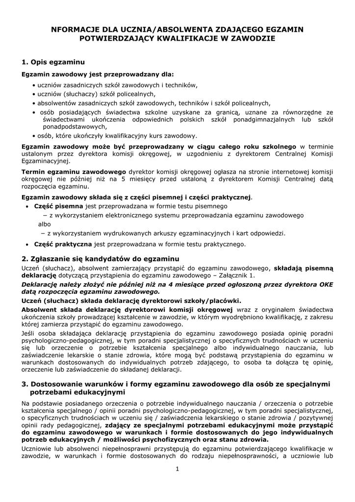 NFORMACJE DLA UCZNIA/ABSOLWENTA ZDAJĄCEGO EGZAMIN POTWIERDZAJĄCY KWALIFIKACJE W ZAWODZIE 1. Opis egzaminu Egzamin zawodowy jest przeprowadzany dla: • uczniów zasadniczych szkół zawodowych i techników, • uczniów (słuchaczy) szkół policealnych, • absolwentów zasadniczych szkół zawodowych, techników i szkół policealnych, • osób posiadających świadectwa szkolne uzyskane za granicą, uznane za równorzędne ze świadectwami ukończenia odpowiednich polskich szkół ponadgimnazjalnych lub szkół ponadpodstawowych, • osób, które ukończyły kwalifikacyjny kurs zawodowy. Egzamin zawodowy może być przeprowadzany w ciągu całego roku szkolnego w terminie ustalonym przez dyrektora komisji okręgowej, w uzgodnieniu z dyrektorem Centralnej Komisji Egzaminacyjnej. Termin egzaminu zawodowego dyrektor komisji okręgowej ogłasza na stronie internetowej komisji okręgowej nie później niż na 5 miesięcy przed ustaloną z dyrektorem Komisji Centralnej datą rozpoczęcia egzaminu. Egzamin zawodowy składa się z części pisemnej i części praktycznej. Część pisemna jest przeprowadzana w formie testu pisemnego − z wykorzystaniem elektronicznego systemu przeprowadzania egzaminu zawodowego albo − z wykorzystaniem wydrukowanych arkuszy egzaminacyjnych i kart odpowiedzi. Część praktyczna jest przeprowadzana w formie testu praktycznego. 2. Zgłaszanie się kandydatów do egzaminu Uczeń (słuchacz), absolwent zamierzający przystąpić do egzaminu zawodowego, składają pisemną deklarację dotyczącą przystąpienia do egzaminu zawodowego – Załącznik 1. Deklarację należy złożyć nie później niż na 4 miesiące przed ogłoszoną przez dyrektora OKE datą rozpoczęcia egzaminu zawodowego. Uczeń (słuchacz) składa deklarację dyrektorowi szkoły/placówki. Absolwent składa deklarację dyrektorowi komisji okręgowej wraz z oryginałem świadectwa ukończenia szkoły prowadzącej kształcenie w zawodzie, w którym wyodrębniono kwalifikację, z zakresu której zamierza przystąpić do egzaminu zawodowego. Jeśli osoba składająca deklarację przystąpienia do egzaminu zawodowego posiada opinię poradni psychologiczno-pedagogicznej, w tym poradni specjalistycznej o specyficznych trudnościach w uczeniu się lub orzeczenie o potrzebie kształcenia specjalnego albo indywidualnego nauczania, lub zaświadczenie lekarskie o stanie zdrowia, które mogą być podstawą przystąpienia do egzaminu w warunkach dostosowanych do indywidualnych potrzeb zdającego, to osoba ta dołącza tę opinię, orzeczenie lub zaświadczenie do składanej deklaracji. 3. Dostosowanie warunków i formy egzaminu zawodowego dla osób ze specjalnymi potrzebami edukacyjnymi Na podstawie posiadanego orzeczenia o potrzebie indywidualnego nauczania / orzeczenia o potrzebie kształcenia specjalnego / opinii poradni psychologiczno-pedagogicznej, w tym poradni specjalistycznej, o specyficznych trudnościach w uczeniu się / zaświadczenia lekarskiego o stanie zdrowia / pozytywnej opinii rady pedagogicznej, zdający ze specjalnymi potrzebami edukacyjnymi może przystąpić do egzaminu zawodowego w warunkach i formie dostosowanych do jego indywidualnych potrzeb edukacyjnych / możliwości psychofizycznych oraz stanu zdrowia. Uczniowie lub absolwenci niepełnosprawni przystępują do egzaminu potwierdzającego kwalifikacje w zawodzie, w warunkach i formie dostosowanych do rodzaju niepełnosprawności, a uczniowie lub 1 absolwenci niedostosowani społecznie lub zagrożeni niedostosowaniem społecznym – w warunkach dostosowanych do indywidualnych potrzeb rozwojowych i edukacyjnych oraz możliwości psychofizycznych, na podstawie orzeczenia o potrzebie kształcenia specjalnego. Dyrektor Komisji Centralnej opracowuje szczegółową informację o sposobach dostosowania warunków i formy przeprowadzania egzaminu zawodowego do indywidualnych potrzeb i możliwości psychofizycznych zdających i podaje ją do publicznej wiadomości na stronie internetowej Komisji Centralnej nie później niż do dnia 30 września. Sposoby dostosowania warunków przeprowadzania egzaminu zawodowego do potrzeb i możliwości uczniów (słuchaczy) lub absolwentów wskazuje rada pedagogiczna, spośród możliwych sposobów dostosowania warunków przeprowadzania egzaminu zawodowego, określonych w szczegółowej informacji Dyrektora CKE. Sposoby dostosowania warunków przeprowadzania egzaminu zawodowego do potrzeb i możliwości absolwentów, którzy ukończyli szkołę we wcześniejszych latach wskazuje odpowiednio PZE lub KOE w porozumieniu z dyrektorem komisji okręgowej, spośród możliwych sposobów dostosowania warunków przeprowadzania egzaminu zawodowego, określonych w szczegółowej informacji Dyrektora CKE. Za dostosowanie warunków przeprowadzania egzaminu zawodowego do indywidualnych możliwości i potrzeb zdających odpowiada w części pisemnej egzaminu PZE, a w części praktycznej KOE. 4. Zwolnienie laureatów i finalistów turniejów lub olimpiad tematycznych z części pisemnej egzaminu Laureaci i finaliści turniejów lub olimpiad tematycznych związanych z wybranym obszarem kształcenia zawodowego są zwolnieni z części pisemnej egzaminu zawodowego na podstawie zaświadczenia stwierdzającego uzyskanie tytułu odpowiednio laureata lub finalisty. Zaświadczenie przedkłada się przewodniczącemu zespołu egzaminacyjnego. Zwolnienie laureata lub finalisty turnieju lub olimpiady tematycznej z części pisemnej egzaminu zawodowego jest równoznaczne z uzyskaniem z tej części egzaminu zawodowego wyniku 100% punktów możliwych do uzyskania. Wykaz turniejów i olimpiad tematycznych dotyczący egzaminu potwierdzającego kwalifikacje w zawodzie podany jest przez dyrektora Centralnej Komisji Egzaminacyjnej do publicznej wiadomości na stronie internetowej CKE (www.cke.edu.pl). 5. Miejsce przystąpienia zdającego do egzaminu 5.1. Część pisemna egzaminu Do części pisemnej egzaminu zawodowego uczeń (słuc
