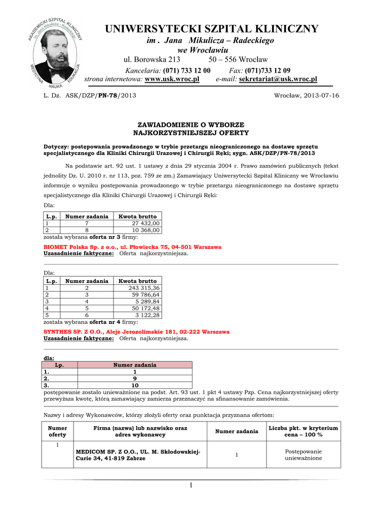 UNIWERSYTECKI SZPITAL KLINICZNY im . Jana Mikulicza – Radeckiego we Wrocławiu ul. Borowska 213 50 – 556 Wrocław Kancelaria: (071) 733 12 00 Fax: (071)733 12 09 strona internetowa: www.usk.wroc.pl e-mail: [email protected] L. Dz. ASK/DZP/PN-78/2013 Wrocław, 2013-07-16 ZAWIADOMIENIE O WYBORZE NAJKORZYSTNIEJSZEJ OFERTY Dotyczy: postępowania prowadzonego w trybie przetargu nieograniczonego na dostawę sprzętu specjalistycznego dla Kliniki Chirurgii Urazowej i Chirurgii Ręki; sygn. ASK/DZP/PN-78/2013 Na podstawie art. 92 ust. 1 ustawy z dnia 29 stycznia 2004 r. Prawo zamówień publicznych (tekst jednolity Dz. U. 2010 r. nr 113, poz. 759 ze zm.) Zamawiający Uniwersytecki Szpital Kliniczny we Wrocławiu informuje o wyniku postępowania prowadzonego w trybie przetargu nieograniczonego na dostawę sprzętu specjalistycznego dla Kliniki Chirurgii Urazowej i Chirurgii Ręki: Dla: L.p. Numer zadania Kwota brutto 1 7 27 432,00 2 8 10 368,00 została wybrana oferta nr 3 firmy: BIOMET Polska Sp. z o.o., ul. Płowiecka 75, 04-501 Warszawa Uzasadnienie faktyczne: Oferta najkorzystniejsza. Dla: L.p. Numer zadania Kwota brutto 1 2 243 315,36 2 3 59 786,64 3 4 5 289,84 4 5 50 172,48 5 6 3 122,28 została wybrana oferta nr 4 firmy: SYNTHES SP. Z O.O., Aleje Jerozolimskie 181, 02-222 Warszawa Uzasadnienie faktyczne: Oferta najkorzystniejsza. dla: Lp. Numer zadania 1. 1 2. 9 3. 10 postępowanie zostało unieważnione na podst. Art. 93 ust. 1 pkt 4 ustawy Pzp. Cena najkorzystniejszej oferty przewyższa kwotę, którą zamawiający zamierza przeznaczyć na sfinansowanie zamówienia. Nazwy i adresy Wykonawców, którzy złożyli oferty oraz punktacja przyznana ofertom: Numer oferty Firma (nazwa) lub nazwisko oraz adres wykonawcy Numer zadania Liczba pkt. w kryterium cena – 100 % 1 Postępowanie unieważnione 1 MEDICOM SP. Z O.O., UL. M. SkłodowskiejCurie 34, 41-819 Zabrze 1 2 MED. & CARE Tomasz Witkowski, ul. Chwaszczyńska 170, 81-571 Gdynia 3 BIOMET Polska Sp. z o.o., ul. Płowiecka 75, 04-501 Warszawa 4 SYNTHES SP. Z O.O., Aleje Jerozolimskie 181, 02-222 Warszawa 10 7 8 9 2 3 4 5 6 Postępowanie unieważnione 100 100 Postępowanie unieważnione 100 100 100 100 100 Z postępowania nie wykluczono Wykonawców. W postępowaniu nie odrzucono ofert. Przewidywany termin zawarcia umowy w niniejszym postępowaniu: zgodnie z artykułem 94 ust 1 Ustawy Prawo zamówień publicznych - 29.07.2013 r. Z upoważnienia Dyrektora Uniwersyteckiego Szpitala Klinicznego im. Jana Mikulicza – Radeckiego we Wrocławiu Mariola Dwornikowska - Dąbrowska Z-ca Dyrektora ds. Finansowych 2