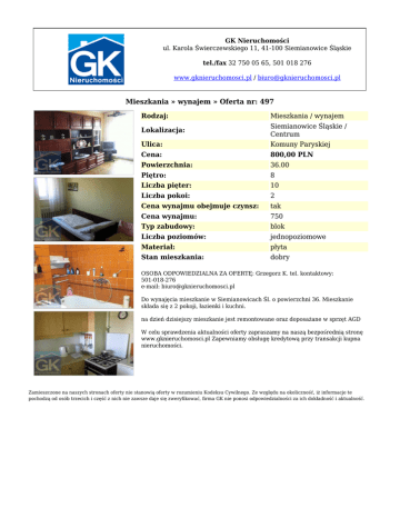 GK Nieruchomości ul. Karola Świerczewskiego 11, 41-100 Siemianowice Śląskie tel./fax 32 750 05 65, 501 018 276 www.gknieruchomosci.pl / [email protected] Mieszkania » wynajem » Oferta nr: 497 Rodzaj: Mieszkania / wynajem Lokalizacja: Siemianowice Śląskie / Centrum Ulica: Komuny Paryskiej Cena: 800,00 PLN Powierzchnia: 36.00 Piętro: 8 Liczba pięter: 10 Liczba pokoi: 2 Cena wynajmu obejmuje czynsz: tak Cena wynajmu: 750 Typ zabudowy: blok Liczba poziomów: jednopoziomowe Materiał: płyta Stan mieszkania: dobry OSOBA ODPOWIEDZIALNA ZA OFERTĘ: Grzegorz K. tel. kontaktowy: 501-018-276 e-mail: [email protected] Do wynajęcia mieszkanie w Siemianowicach Śl. o powierzchni 36. Mieszkanie składa się z 2 pokoji, łazienki i kuchni. na dzień dzisiejszy mieszkanie jest remontowane oraz doposażane w sprzęt AGD W celu sprawdzenia aktualności oferty zapraszamy na naszą bezpośrednią stronę www.gknieruchomosci.pl Zapewniamy obsługę kredytową przy transakcji kupna nieruchomości. Zamieszczone na naszych stronach oferty nie stanowią oferty w rozumieniu Kodeksu Cywilnego. Ze względu na okoliczność, iż informacje te pochodzą od osób trzecich i część z nich nie zawsze daje się zweryfikować, firma GK nie ponosi odpowiedzialności za ich dokładność i aktualność.