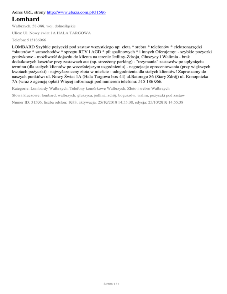 Adres URL strony http://www.ebaza.com.pl/31506 Lombard Wałbrzych, 58-300, woj. dolnośląskie Ulica: Ul. Nowy świat 1A HALA TARGOWA Telefon: 515186066 LOMBARD Szybkie pożyczki pod zastaw wszystkiego np: złota * srebra * telefonów * elektronarzędzi *skuterów * samochodów * sprzętu RTV i AGD * pił spalinowych * i innych Oferujemy: - szybkie pożyczki gotówkowe - możliwość dojazdu do klienta na terenie Jedliny-Zdroju, Głuszycy i Walimia - brak dodatkowych kosztów przy zastawach aut (np. strzeżony parking) - "trzymanie" zastawów po upłynięciu terminu (dla stałych klientów po wcześniejszym uzgodnieniu) - negocjacje oprocentowania (przy większych kwotach pożyczki) - najwyższe ceny złota w mieście - udogodnienia dla stałych klientów! Zapraszamy do naszych punktów: ul. Nowy Świat 1A (Hala Targowa box 44) ul.Batorego 86 (Stary Zdrój) ul. Konopnicka 7A (wraz z agencją opłat) Więcej informacji pod numerem telefonu: 515 186 066. Kategorie: Lombardy Wałbrzych, Telefony komórkowe Wałbrzych, Złoto i srebro Wałbrzych Słowa kluczowe: lombard, wałbrzych, głuszyca, jedlina, zdrój, boguszów, walim, pożyczki pod zastaw Numer ID: 31506, liczba odsłon: 1033, aktywacja: 25/10/2010 14:55:38, edycja: 25/10/2010 14:55:38 Strona 1 / 1