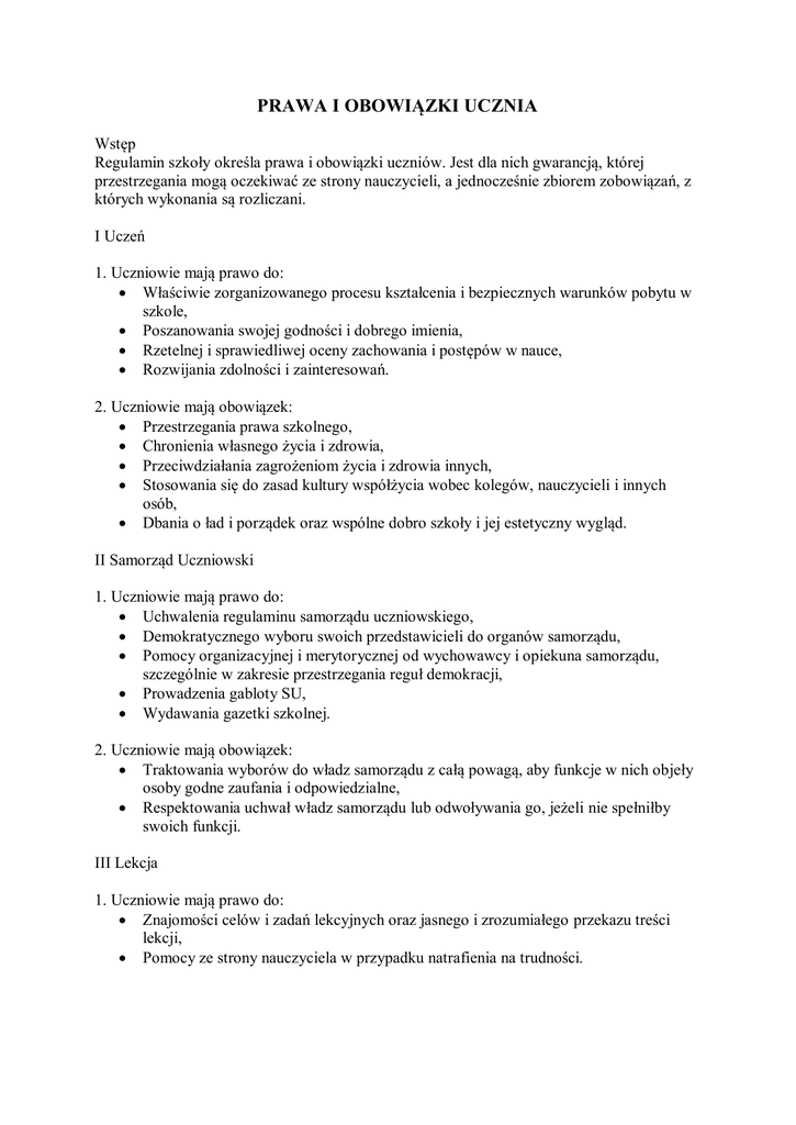 PRAWA I OBOWIĄZKI UCZNIA Wstęp Regulamin szkoły określa prawa i obowiązki uczniów. Jest dla nich gwarancją, której przestrzegania mogą oczekiwać ze strony nauczycieli, a jednocześnie zbiorem zobowiązań, z których wykonania są rozliczani. I Uczeń 1. Uczniowie mają prawo do: Właściwie zorganizowanego procesu kształcenia i bezpiecznych warunków pobytu w szkole, Poszanowania swojej godności i dobrego imienia, Rzetelnej i sprawiedliwej oceny zachowania i postępów w nauce, Rozwijania zdolności i zainteresowań. 2. Uczniowie mają obowiązek: Przestrzegania prawa szkolnego, Chronienia własnego życia i zdrowia, Przeciwdziałania zagrożeniom życia i zdrowia innych, Stosowania się do zasad kultury współżycia wobec kolegów, nauczycieli i innych osób, Dbania o ład i porządek oraz wspólne dobro szkoły i jej estetyczny wygląd. II Samorząd Uczniowski 1. Uczniowie mają prawo do: Uchwalenia regulaminu samorządu uczniowskiego, Demokratycznego wyboru swoich przedstawicieli do organów samorządu, Pomocy organizacyjnej i merytorycznej od wychowawcy i opiekuna samorządu, szczególnie w zakresie przestrzegania reguł demokracji, Prowadzenia gabloty SU, Wydawania gazetki szkolnej. 2. Uczniowie mają obowiązek: Traktowania wyborów do władz samorządu z całą powagą, aby funkcje w nich objeły osoby godne zaufania i odpowiedzialne, Respektowania uchwał władz samorządu lub odwoływania go, jeżeli nie spełniłby swoich funkcji. III Lekcja 1. Uczniowie mają prawo do: Znajomości celów i zadań lekcyjnych oraz jasnego i zrozumiałego przekazu treści lekcji, Pomocy ze strony nauczyciela w przypadku natrafienia na trudności. 2. Uczniowie mają obowiązek: Punktualnego i systematycznego przychodzenia na zajęcia, Aktywnego udziału w lekcjach i przestrzegania ustalonych zasad porządkowych, Uzupełnienia braków wynikających z absencji. IV Sala lekcyjna 1. Uczniowie mają prawo do: Udziału w zagospodarowaniu powierzonej im Sali lekcyjnej wg własnego projektu uzgodnionego z wychowawcą, Kontrolowania porządku, zostawionego w sali przez wcześniej uczącą się tam klasę. 2. Uczniowie mają obowiązek: Zostawienia sali lekcyjnej w nienagannym porządku, Dbania o powierzony klasie sprzęt i pomoce naukowe, Niezwłocznego zgłaszania nauczycielowi wszystkich uszkodzeń sprzętu lub pomocy dydaktycznych. V Odpoczynek 1. Uczniowie mają prawo do: Odpoczynku podczas przerwy, Dwóch dni w tygodniu wolnych od zajęć lekcyjnych, tj. soboty i niedzieli, z włączeniem tych sobót, w które są odpracowywane inne dni robocze. 2. Uczniowie mają obowiązek: Przestrzegania zasad bezpieczeństwa i higieny pracy, Dbania o kulturę zachowania i kulturę języka, Zachowania zasad higieny osobistej i higieny otoczenia. VI Prace domowe 1. Uczniowie mają prawo do: Uwzględnienia przez nauczyciela ich fizycznych i psychicznych możliwości, Ukierunkowania przez nauczyciela, jak wykonać zadania domowe. 2. Uczniowie mają obowiązek: Starannego i sumiennego odrabiania prac domowych, Kształtowania nawyku odrabiania prac domowych w tym dniu, w którym zostały zadane. VII Zeszyt przedmiotowy 1. Uczniowie mają prawo do: Ukierunkowania przez nauczyciela, jak należy prowadzić zeszyt 2. Uczniowie mają obowiązek: Starannego prowadzenia zeszytów i ćwiczeń zgodnie z wymaganiami nauczyciela. VIII Procedury lekcyjne 1. Zachowanie w czasie lekcji Uczeń nie je na lekcji, nie żuje gumy, Nie trzyma się na ławce butelek, ciastek itp. nie będących pomocami do danej lekcji, jedyna rzecz dopuszczalna to maskotka na szczęście, Posiadacze telefonów komórkowych wyłączają je na czas lekcji, Jeżeli do klasy wchodzi osoba dorosła, wszyscy wstają, ponownie siadają na polecenie nauczyciela, Lekcja kończy się na wyraźny sygnał nauczyciela, Klasa jest zobowiązana zostawić po sobie porządek; odpowiadają za to wszyscy uczniowie, a kontrolują dyżurni, Uczniowie ustawiają krzesła na ławki, jeżeli jest to ostatnia lekcja w tej pracowni. 2. Zastępstwa W czasie zastępstw nauczyciel powinien prowadzić lekcje z przedmiotu, który jest w planie lub lekcję własnego przedmiotu zgodnie z przygotowanym planem zastępstw. 3. Pracownie przedmiotowe: Szczególne zasady zachowania w pracowniach: Chemicznej, Fizycznej, Biologicznej, Informatycznych, Technicznej, Oraz w Sali gimnastycznej i bibliotece, określają odrębne regulaminy wywieszone w tych pracowniach. IX Procedury inne niż lekcyjne 1. Nieobecności. Usprawiedliwienia nieobecności ucznia przynosi na pierwszą godzinę wychowawczą po ustaniu nieobecności, Ucznia może zwolnić z części lub całości zajęć wychowawca klasy lub dyrektor szkoły. Zwolnienie ucznia następuje na podstawie osobistej prośby od rodziców lub potwierdzenia telefonicznego, O każdym przypadku wagarów niezwłocznie informowani są rodzice, Uczniowie, którzy nie uczęszczają na lekcje religii przebywają w ich czasie w czytelni. 2. Strój szkolny Uczniowie chodzą ubrani schludnie i estetycznie, W dni uroczyste uczniowie przychodzą w stroju galowym, obowiązuje biała koszula z krawatem, marynarka lub sweter, dla dziewcząt ciemna spódniczka i biała bluzka, Dozwolona jest skromna biżuteria noszona przez dziewczęta, Dziewczęta przychodzą do szkoły bez makijażu, Uczniowie zmieniają w szkole obuwie. Obowiązuje lekkie obuwie sportowe ( trampki, tenisówki ). Nie jest dozwolone noszenie w szkole butów na wysokiej podeszwie lub wysokim obcasie, Przy wejściu do Sali gimnastycznej uczniowie zawsze zmieniają buty na sportowe, na jasnej podeszwie, Strój na w: ciemne szorty, biała lub jasna koszulka i skarpetki. 3. Savoir – vivre Uczeń wita się i żegna z pracownikami szkoły, w tym czasie stoi i nie trzyma rąk w kieszeniach, W szkole nie można nosić nakryć głowy, Nie używa się wulgaryzmów Nie bije się z kolegami, Nie przynosi do szkoły żadnych niebezpiecznych przedmiotów, Nie pali papierosów, nie stosuje używek, 
