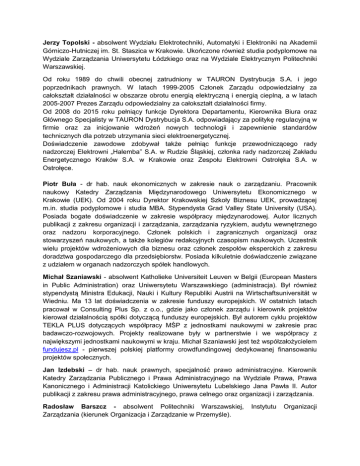 Jerzy Topolski - absolwent Wydziału Elektrotechniki, Automatyki i Elektroniki na Akademii Górniczo-Hutniczej im. St. Staszica w Krakowie. Ukończone również studia podyplomowe na Wydziale Zarządzania Uniwersytetu Łódzkiego oraz na Wydziale Elektrycznym Politechniki Warszawskiej. Od roku 1989 do chwili obecnej zatrudniony w TAURON Dystrybucja S.A. i jego poprzednikach prawnych. W latach 1999-2005 Członek Zarządu odpowiedzialny za całokształt działalności w obszarze obrotu energią elektryczną i energią cieplną, a w latach 2005-2007 Prezes Zarządu odpowiedzialny za całokształt działalności firmy. Od 2008 do 2015 roku pełniący funkcje Dyrektora Departamentu, Kierownika Biura oraz Głównego Specjalisty w TAURON Dystrybucja S.A. odpowiadający za politykę regulacyjną w firmie oraz za inicjowanie wdrożeń nowych technologii i zapewnienie standardów technicznych dla potrzeb utrzymania sieci elektroenergetycznej. Doświadczenie zawodowe zdobywał także pełniąc funkcje przewodniczącego rady nadzorczej Elektrowni „Halemba” S.A. w Rudzie Śląskiej, członka rady nadzorczej Zakładu Energetycznego Kraków S.A. w Krakowie oraz Zespołu Elektrowni Ostrołęka S.A. w Ostrołęce. Piotr Buła - dr hab. nauk ekonomicznych w zakresie nauk o zarządzaniu. Pracownik naukowy Katedry Zarządzania Międzynarodowego Uniwersytetu Ekonomicznego w Krakowie (UEK). Od 2004 roku Dyrektor Krakowskiej Szkoły Biznesu UEK, prowadzącej m.in. studia podyplomowe i studia MBA. Stypendysta Grad Valley State University (USA). Posiada bogate doświadczenie w zakresie współpracy międzynarodowej. Autor licznych publikacji z zakresu organizacji i zarządzania, zarządzania ryzykiem, audytu wewnętrznego oraz nadzoru korporacyjnego. Członek polskich i zagranicznych organizacji oraz stowarzyszeń naukowych, a także kolegiów redakcyjnych czasopism naukowych. Uczestnik wielu projektów wdrożeniowych dla biznesu oraz członek zespołów eksperckich z zakresu doradztwa gospodarczego dla przedsiębiorstw. Posiada kilkuletnie doświadczenie związane z udziałem w organach nadzorczych spółek handlowych. Michał Szaniawski - absolwent Katholieke Universiteit Leuven w Belgii (European Masters in Public Administration) oraz Uniwersytetu Warszawskiego (administracja). Był również stypendystą Ministra Edukacji, Nauki i Kultury Republiki Austrii na Wirtschaftsuniversität w Wiedniu. Ma 13 lat doświadczenia w zakresie funduszy europejskich. W ostatnich latach pracował w Consulting Plus Sp. z o.o., gdzie jako członek zarządu i kierownik projektów kierował działalnością spółki dotyczącą funduszy europejskich. Był autorem cyklu projektów TEKLA PLUS dotyczących współpracy MŚP z jednostkami naukowymi w zakresie prac badawczo-rozwojowych. Projekty realizowane były w partnerstwie i we współpracy z największymi jednostkami naukowymi w kraju. Michał Szaniawski jest też współzałożycielem fundujesz.pl - pierwszej polskiej platformy crowdfundingowej dedykowanej finansowaniu projektów społecznych. Jan Izdebski – dr hab. nauk prawnych, specjalność prawo administracyjne. Kierownik Katedry Zarządzania Publicznego i Prawa Administracyjnego na Wydziale Prawa, Prawa Kanonicznego i Administracji Katolickiego Uniwersytetu Lubelskiego Jana Pawła II. Autor publikacji z zakresu prawa administracyjnego, prawa celnego oraz organizacji i zarządzania. Radosław Barszcz - absolwent Politechniki Warszawskiej, Zarządzania (kierunek Organizacja i Zarządzanie w Przemyśle). Instytutu Organizacji W latach 1992-1994 koordynator projektu Centrum Badawczo-Rozwojowe w Zespole Zarządzania Strategicznego Telekomunikacji Polskiej S.A. W latach 1994-1997 ekspert ds. inwestycji kapitałowych w Departamencie Restrukturyzacji i Prywatyzacji Polskiego Banku Rozwoju S.A. Od 1998 roku pracuje w Ministerstwie Skarbu Państwa. Był naczelnikiem Wydziału Nadzoru Właścicielskiego oraz Wydziału Prywatyzacji Pośredniej. Od roku 2006 do 2010 roku pełnił funkcje zastępcy dyrektora/ dyrektora Departamentu Nadzoru Właścicielskiego. Obecnie pełni funkcję Radcy Ministra. Od 1998 roku zasiadał w radach nadzorczych następujących spółek prawa handlowego: Elektrownia Skawina S.A. (Energa S.A.), Zakład Energetyczny Słupsk S.A. (CEZ S.A.), PGE Polska Grupa Energetyczna S.A., PGE Elektrownia Turów S.A., Grupa Azoty Zakłady Azotowe „Puławy” S.A., Grupa Lotos S.A., Przedsiębiorstwo Badan Geofizycznych Sp. z o.o.