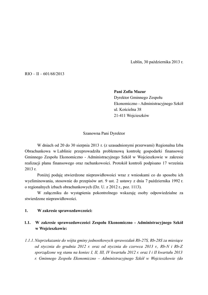 Lublin, 30 października 2013 r. RIO – II – 601/68/2013 Pani Zofia Mazur Dyrektor Gminnego Zespołu Ekonomiczno - Administracyjnego Szkół ul. Kościelna 38 21-411 Wojcieszków Szanowna Pani Dyrektor W dniach od 20 do 30 sierpnia 2013 r. (z uzasadnionymi przerwami) Regionalna Izba Obrachunkowa w Lublinie przeprowadziła problemową kontrolę gospodarki finansowej Gminnego Zespołu Ekonomiczno - Administracyjnego Szkół w Wojcieszkowie w zakresie realizacji planu finansowego oraz rachunkowości. Protokół kontroli podpisano 17 września 2013 r. Poniżej podaję stwierdzone nieprawidłowości wraz z wnioskami co do sposobu ich wyeliminowania, stosownie do przepisów art. 9 ust. 2 ustawy z dnia 7 października 1992 r. o regionalnych izbach obrachunkowych (Dz. U. z 2012 r., poz. 1113). W załączniku do wystąpienia pokontrolnego wskazuję osoby odpowiedzialne za stwierdzone nieprawidłowości. 1. 1.1. W zakresie sprawozdawczości: W zakresie sprawozdawczości Zespołu Ekonomiczno - Administracyjnego Szkół w Wojcieszkowie: 1.1.1. Nieprzekazanie do wójta gminy jednostkowych sprawozdań Rb-27S, Rb-28S za miesiące od stycznia do grudnia 2012 r. oraz od stycznia do czerwca 2013 r., Rb-N i Rb-Z sporządzone wg stanu na koniec I, II, III, IV kwartału 2012 r. oraz I i II kwartału 2013 r. Gminnego Zespołu Ekonomiczno – Administracyjnego Szkół w Wojcieszkowie (do 2 wójta gminy za wskazane okresy sprawozdawcze przekazywano sprawozdania Rb-27S, Rb28S, Rb-N i Rb-Z obejmujące swym zakresem dochody, wydatki, należności i zobowiązania GZEAS-u i wszystkich jednostek oświatowych) – str. 2 – 3 protokołu. Przedkładać wójtowi gminy jednostkowe sprawozdania Rb-27S „Miesięczne/roczne sprawozdanie z wykonania planu dochodów budżetowych jednostki samorządu terytorialnego” i Rb-28S „Miesięczne/roczne sprawozdanie z wykonania planu wydatków budżetowych jednostki samorządu terytorialnego” – za każdy kolejny miesiąc kalendarzowy oraz Rb-N „Kwartalne sprawozdanie o stanie należności oraz wybranych aktywów finansowych” i Rb-Z „Kwartalne sprawozdanie o stanie zobowiązań według tytułów dłużnych oraz poręczeń i gwarancji” – według stanu na koniec każdego kwartału roku budżetowego Gminnego Zespołu Ekonomiczno – Administracyjnego Szkół w Wojcieszkowie, stosownie do przepisów § 4 pkt 3 lit. b i § 18 rozporządzenia Ministra Finansów z dnia 3 lutego 2010 w sprawie sprawozdawczości budżetowej (Dz. U. Nr 20, poz. 103) oraz § 6 ust. 1 pkt 4 i § 8 ust. 1 rozporządzenia Ministra Finansów z dnia 4 marca 2010 r. w sprawie sprawozdań jednostek sektora finansów publicznych w zakresie operacji finansowych (Dz. U. Nr 43 poz. 247). 1.1.2. Niewykazanie w bilansie Zespołu wszystkich danych wynikających z ksiąg rachunkowych (dane wynikające z ksiąg rachunkowych prowadzonych dla projektu „Pomocna dłoń” wykazano w odrębnym bilansie). Nieprzekazanie do wójta gminy jednostkowego bilansu (przedłożono sprawozdanie finansowe obejmujące swym zakresem aktywa i pasywa GZEAS-u i wszystkich jednostek oświatowych ) – str. 3, 4 protokołu. Sporządzać jeden bilans jednostki, zawierając w nim informacje w zakresie ustalonym w załączniku Nr 5 do rozporządzenia Ministra Finansów z dnia 5 lipca 2010 r. w sprawie szczególnych zasad rachunkowości oraz planów kont dla budżetu państwa, budżetów jednostek samorządu terytorialnego, jednostek budżetowych, samorządowych zakładów budżetowych, państwowych funduszy celowych oraz państwowych jednostek budżetowych mających siedzibę poza granicami Rzeczypospolitej Polskiej (Dz. U. z 2013 r., poz. 289), powoływanego w dalszej części tego wystąpienia jako „rozporządzenie Ministra Finansów z dnia 5 lipca 2010 r.” i przekazywać go wójtowi gminy, zgodnie z przepisami § 17 ust. 3 pkt 1 i § 26 ust. 1 tego rozporządzenia. 1.2. W zakresie sprawozdawczości jednostek, których obsługę finansowo – księgową prowadzi Zespół: 1.2.1. Niesporządzenie przez Dyrektora Zespołu Szkół w Wojcieszkowie jednostkowych 3 sprawozdań Rb-27S, Rb-28S za miesiące od stycznia do grudnia 2012 r. oraz od stycznia do czerwca 2013 r., Rb-N i Rb-Z sporządzone wg stanu na koniec I, II, III, IV kwartału 2012 r. oraz I i II kwartału 2013 r. obejmujących wszystkie realizowane dochody i wydatki oraz należności i zobowiązania (za wskazane okresy sprawozdawcze sporządzano odrębne sprawozdania dla dochodów i wydatków, należności i zobowiązania Szkoły Podstawowej w Wojcieszkowie, Gimnazjum w Wojcieszkowie oraz Przedszkola w Wojcieszkowie). Nieprzekazanie do wójta gminy jednostkowych sprawozdań Rb-27S, Rb-28S za miesiące od stycznia do grudnia 2012 r. oraz od stycznia do czerwca 2013 r., Rb-N i Rb-Z sporządzone wg stanu na koniec I, II, III, IV kwartału 2012 r. oraz I i II kwartału 2013 r. Zespołu Szkół w Wojcieszkowie, Szkoły Podstawowej w Hermanowie, Szkoły Podstawowej w Siedliskach, Szkoły Podstawowej w Oszczepalinie Drugim, Szkoły Podstawowej w Woli Bystrzyckiej, Szkoły Podstawowej w Wólce Domaszewskiej – str. 2, 3 protokołu. Sporządzać jednostkowe sprawozdania Rb-27S „Miesięczne/roczne sprawozdanie z wykonania planu dochodów budżetowych jednostki samorządu terytorialnego” i Rb-28S „Miesięczne/roczne sprawozdanie z wykonania planu wydatków budżetowych jednostki samorządu terytorialnego” oraz Rb-N „Kwartalne sprawozdanie o stanie należności oraz wybranych aktywów finansowych” i Rb-Z „Kwartalne sprawozdanie o stanie zobowiązań według tytułów dłużnych oraz poręczeń i gwarancji” Zespołu Szkół w Wojcieszkowie obejmujące wszystkie zrealizowane dochody i wydatki oraz należności i zobowiązania (niezależnie od sposobu prowadzenia ewidencji księgowej), stosownie do przepisów § 6 ust. 1 pkt 1 i § 9 ust. 1 i 2 rozporządzenia w sprawie sprawozdawczości budżetowej oraz § 4 ust. 1 pkt 1 rozporządzenia w sprawie sprawozdań jednost
