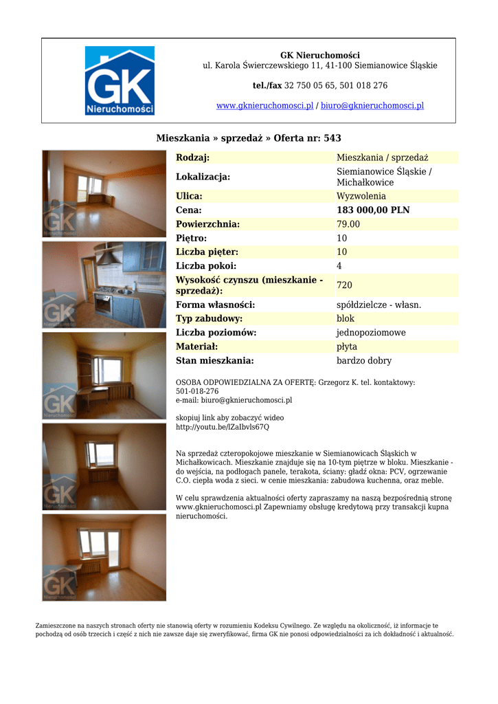 GK Nieruchomości ul. Karola Świerczewskiego 11, 41-100 Siemianowice Śląskie tel./fax 32 750 05 65, 501 018 276 www.gknieruchomosci.pl / [email protected] Mieszkania » sprzedaż » Oferta nr: 543 Rodzaj: Mieszkania / sprzedaż Lokalizacja: Siemianowice Śląskie / Michałkowice Ulica: Wyzwolenia Cena: 183 000,00 PLN Powierzchnia: 79.00 Piętro: 10 Liczba pięter: 10 Liczba pokoi: 4 Wysokość czynszu (mieszkanie sprzedaż): 720 Forma własności: spółdzielcze - własn. Typ zabudowy: blok Liczba poziomów: jednopoziomowe Materiał: płyta Stan mieszkania: bardzo dobry OSOBA ODPOWIEDZIALNA ZA OFERTĘ: Grzegorz K. tel. kontaktowy: 501-018-276 e-mail: [email protected] skopiuj link aby zobaczyć wideo http://youtu.be/lZaIbvls67Q Na sprzedaż czteropokojowe mieszkanie w Siemianowicach Śląskich w Michałkowicach. Mieszkanie znajduje się na 10-tym piętrze w bloku. Mieszkanie do wejścia, na podłogach panele, terakota, ściany: gładź okna: PCV, ogrzewanie C.O. ciepła woda z sieci. w cenie mieszkania: zabudowa kuchenna, oraz meble. W celu sprawdzenia aktualności oferty zapraszamy na naszą bezpośrednią stronę www.gknieruchomosci.pl Zapewniamy obsługę kredytową przy transakcji kupna nieruchomości. Zamieszczone na naszych stronach oferty nie stanowią oferty w rozumieniu Kodeksu Cywilnego. Ze względu na okoliczność, iż informacje te pochodzą od osób trzecich i część z nich nie zawsze daje się zweryfikować, firma GK nie ponosi odpowiedzialności za ich dokładność i aktualność.