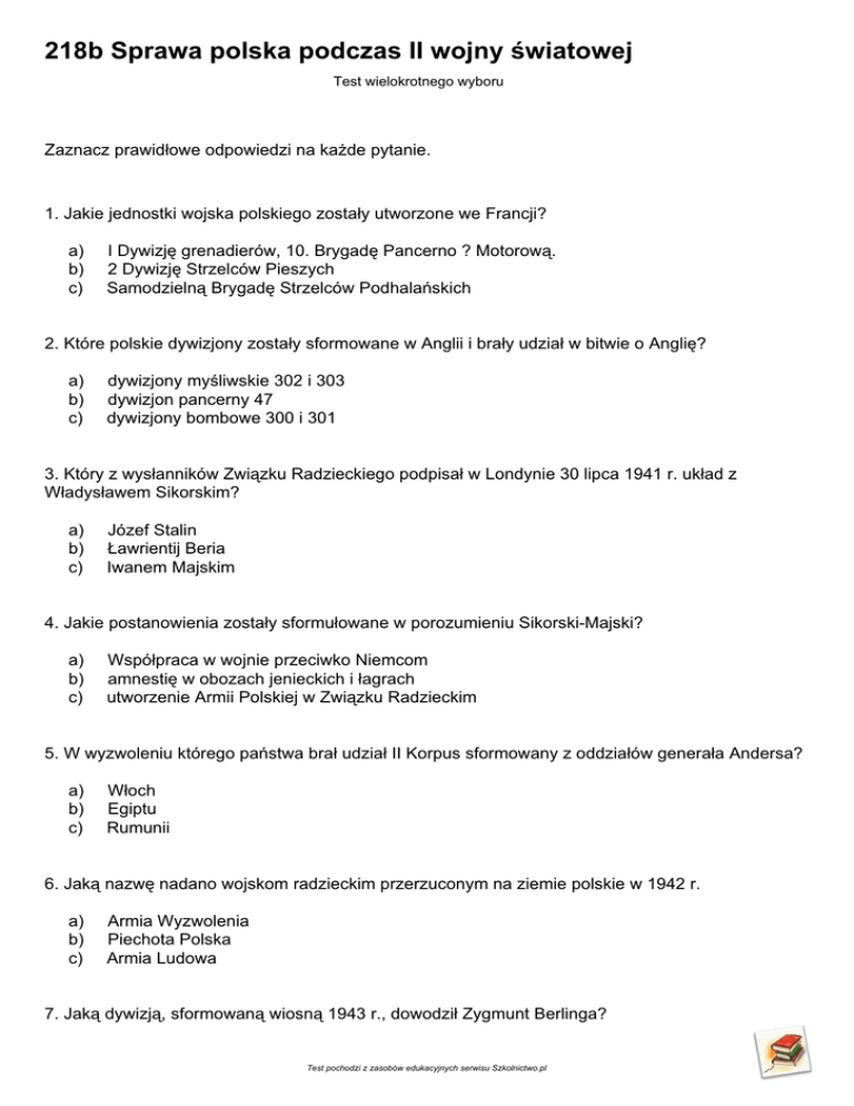 218b Sprawa polska podczas II wojny światowej Test wielokrotnego wyboru Zaznacz prawidłowe odpowiedzi na każde pytanie. 1. Jakie jednostki wojska polskiego zostały utworzone we Francji? a) b) c) I Dywizję grenadierów, 10. Brygadę Pancerno ? Motorową. 2 Dywizję Strzelców Pieszych Samodzielną Brygadę Strzelców Podhalańskich 2. Które polskie dywizjony zostały sformowane w Anglii i brały udział w bitwie o Anglię? a) b) c) dywizjony myśliwskie 302 i 303 dywizjon pancerny 47 dywizjony bombowe 300 i 301 3. Który z wysłanników Związku Radzieckiego podpisał w Londynie 30 lipca 1941 r. układ z Władysławem Sikorskim? a) b) c) Józef Stalin Ławrientij Beria Iwanem Majskim 4. Jakie postanowienia zostały sformułowane w porozumieniu Sikorski-Majski? a) b) c) Współpraca w wojnie przeciwko Niemcom amnestię w obozach jenieckich i łagrach utworzenie Armii Polskiej w Związku Radzieckim 5. W wyzwoleniu którego państwa brał udział II Korpus sformowany z oddziałów generała Andersa? a) b) c) Włoch Egiptu Rumunii 6. Jaką nazwę nadano wojskom radzieckim przerzuconym na ziemie polskie w 1942 r. a) b) c) Armia Wyzwolenia Piechota Polska Armia Ludowa 7. Jaką dywizją, sformowaną wiosną 1943 r., dowodził Zygmunt Berlinga? Test pochodzi z zasobów edukacyjnych serwisu Szkolnictwo.pl a) b) c) Pierwsza Dywizja Pancerna imienia Tadeusza Kościuszki Pierwsza Dywizja Piechoty imienia Tadeusza Kościuszki Pierwsza Dywizja Zmotoryzowana imienia Tadeusza Kościuszki 8. W jakich dniach odbyła się bitwa pod Lenino? a) b) c) 3-8 września 1943 r. 14-16 września 1943 r. 12-13 października 1943 r. 9. Co zakładał plan ?Burza?? a) b) c) walkę z wycofującymi się wojskami niemieckimi połączenie się z wojskiem francuskim w celu rozbicia wojsk niemieckich wyzwolenie ziem polskich, ukraińskich i czechosłowackich 10. Kiedy odbyło się powstanie w Warszawie dowodzone przez pułkownika Antoniego Chruściela? a) b) c) 1 sierpnia1944 r 12 września 1944 r. 14 września 1944 r. 11. Jakie części Warszawy zostały zdobyte w pierwszych dniach sierpnia? a) b) c) Żoliborz, Mokotów, Ochotę i Stare Miasto Bielany, Żoliborz, Wilanów, Wola i część Śródmieścia część Śródmieścia z Powiślem, Stare Miasto, Żoliborz, Mokotów i część Ochoty 12. Kiedy ofensywa radziecka dotarła do lewego brzegu Wisły? a) b) c) 10 września 1944 r. 12 października 1944 r. 3 października 1944 r. 13. Co było skutkiem niepowodzenia powstania w Warszawie? a) b) c) nieobecność Armii Krajowej szybkie gromadzenie oddziałów niemieckich niskie zapasy amunicji i broni 14. Kiedy skapitulowało powstanie w Warszawie? a) b) c) 29 września 1944 r. 2 października 5 października Test pochodzi z zasobów edukacyjnych serwisu Szkolnictwo.pl 15. Jaką decyzję podjęły Niemcy po zakończeniu powstania w Warszawie? a) wycofanie się z Warszawy b) całkowite zniszczenie Warszawy c) wysyłanie ocalałych warszawian do obozów pracy w Niemczech lub Generalnym Gubernatorstwie Test pochodzi z zasobów edukacyjnych serwisu Szkolnictwo.pl