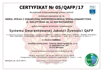 CERTYFIKAT Nr 05/QAFP/17 Na podstawie przeprowadzonego procesu kontroli niniejszym zaświadcza się, że INDROL SPÓŁKA Z OGRANICZONĄ ODPOWIEDZIALNOŚCIĄ SPÓŁKA KOMANDYTOWA ul. WOLSZTYŃSKA 68, 62-068 ROSTARZEWO spełnia wymagania techniczne i organizacyjne Systemu Gwarantowanej Jakości Żywności QAFP w zakresie zeszytu branżowego „TUSZKI, ELEMENTY I MIĘSO Z KURCZAKA, INDYKA I MŁODEJ POLSKIEJ GĘSI OWSIANEJ. WYMAGANIA PRODUKCYJNE I JAKOŚCIOWE. - wyd. nr 3 z dnia 24.12.2013 r.” w obszarze rozbioru. Certyfikat wydany przez: Centrum Jakości AgroEko Sp. z o.o. ul. Modlińska 6 lok. 207 03-216 Warszawa Jednostka akredytowana przez Polskie Centrum Akredytacji AC 148 Termin ważności: od 23.01.2017 do 22.01.2018 Integralną część certyfikatu stanowią załączniki w ilości: 1 szt. Warszawa, dn. 23.01.2017 r. System certyfikacji nr 6 wg normy PN-EN ISO/IEC 17067:2013 Kolejne wydanie certyfikatu automatycznie anuluje wydanie poprzednie ZAŁĄCZNIK NUMER 1 DO CERTYFIKATU NR 05/QAFP/17 wydanego w dniu 23.01.2017 r. Dla INDROL SPÓŁKA Z OGRANICZONĄ ODPOWIEDZIALNOŚCIĄ SPÓŁKA KOMANDYTOWA ul. WOLSZTYŃSKA 68, 62-068 ROSTARZEWO Zakres działalności objętej certyfikatem Systemu QAFP: L.p. 1. 2. Zakres działalności objętej certyfikatem Tuszki i elementy z indyka Kulinarne mięso z piersi indyka Produkty otrzymywane w ramach Systemu QAFP Rodzaj produktów Ilość (t) Tuszka Piersi całe ze skórą, z kością Piersi dzielone ze skórą, z kością Piersi całe ze skórą, bez kości Piersi dzielone ze skórą, z kością Ćwiartka Noga Udo Podudzie Skrzydło całe Skrzydło dzielone Mięso z piersi Mięso z nogi Mięso z uda Mięso z podudzia Mięso z skrzydeł Pierś indyka bez skóry i bez kości Cała pierś Połowa piersi Polędwiczka Sznycle lub pierś dzielona na małe porcje kulinarne 2500 Kolejne wydanie załącznika automatycznie anuluje wydanie poprzednie. Warszawa, dn. 23.01.2017 r.