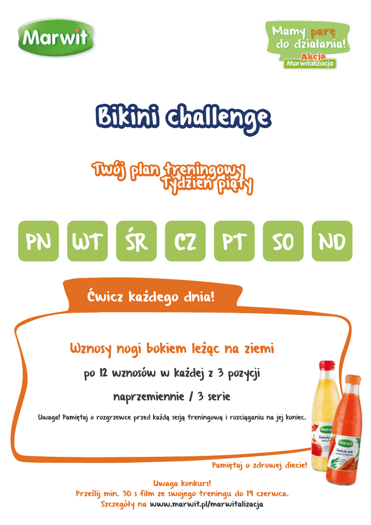 Bikini challenge Twój plan t reningowy Tydzień piąty PN WT ŚR CZ PT SO Ćwicz każdego dnia! Wznosy nogi bokiem leżąc na ziemi po 12 wznosów w każdej z 3 pozycji naprzemiennie / 3 serie Uwaga! Pamiętaj o rozgrzewce przed każdą sesją treningową i rozciąganiu na jej koniec. Pamiętaj o zdrowej diecie! Uwaga konkurs! Prześlij min. 30 s film ze swojego treningu do 19 czerwca. Szczegóły na www.marwit.pl/marwitalizacja ND