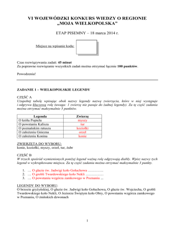 VI WOJEWÓDZKI KONKURS WIEDZY O REGIONIE „MOJA WIELKOPOLSKA” ETAP PISEMNY – 18 marca 2014 r. Miejsce na wpisanie kodu: Czas rozwiązywania zadań: 45 minut Za poprawne rozwiązanie wszystkich zadań można otrzymać łącznie 100 punktów. Powodzenia! ZADANIE 1 – WIELKOPOLSKIE LEGENDY CZĘŚĆ A Uzupełnij tabelę wpisując obok nazwy legendy nazwę zwierzęcia, które w niej występuje i odgrywa kluczową rolę (uwaga: 1 zwierzę nie pasuje do żadnej legendy). Za tę część zadania można otrzymać maksymalnie 5 punktów. Legenda O królu Popielu O powstaniu Kalisza O poznańskim ratuszu O założeniu Gniezna O założeniu Konina Zwierzę myszy tur koziołki orzeł konie ZWIERZĘTA DO WYBORU: konie, koziołki, myszy, orzeł, tur, żubr CZĘŚĆ B W trzech spośród wymienionych poniżej legend ważną rolę odgrywają diabły. Wpisz nazwy tych legend w wykropkowane miejsca. Za tę część zadania można otrzymać maksymalnie 3 punkty. 1. … O głazie św. Jadwigi koło Gołuchowa …………. 2. … O grobli Twardowskiego koło Nekli …………… 3. … O powstaniu wzgórza zamkowego w Poznaniu ... LEGENDY DO WYBORU: O brzozie gryżyńskiej, O głazie św. Jadwigi koło Gołuchowa, O głazie św. Wojciecha, O grobli Twardowskiego koło Nekli, O Jeziorze Świętym koło Obry, O powstaniu wzgórza zamkowego w Poznaniu, O żnińskich dzwonach 1 CZĘŚĆ C W legendach związanych z wymienionymi poniżej miejscowościami główne role odegrały kobiety. Uzupełnij tabelę wpisując bohaterki legend obok nazw miejscowości, z którymi są związane. Za tę część zadania można otrzymać maksymalnie 5 punktów. Miejscowość Gołańcz Kalisz Kórnik Poznań Szamotuły Bohaterka legendy starościanka Hanka starościanka Dorota Teofila z Działyńskich Szołdrska-Potulicka księżna Ludgarda Halszka z Ostroga BOHATERKI LEGEND DO WYBORU: Halszka z Ostroga, księżna Ludgarda, starościanka Dorota, starościanka Hanka, Teofila z Działyńskich Szołdrska-Potulicka ZADANIE 2 – ATRAKCYJNE OBIEKTY FLORYSTYCZNE I FAUNISTYCZNE Przyporządkuj wymienionym poniżej atrakcyjnym obiektom florystycznym i faunistycznym nazwy miejscowości, w których się znajdują (uwaga: 1 nazwa miejscowości może być kilkakrotnie wpisana do tabeli, jednak dla 1 typu obiektu nie można wpisać kilkukrotnie tej samej nazwy miejscowości; w 1 miejscowości nie ma żadnego z poniższych obiektów florystycznych ani faunistycznych). Za zadanie można otrzymać maksymalnie 11 punktów. Typ obiektu ogród botaniczny ogród dendrologiczny palmiarnia arboretum zagroda żubrów stacja doświadczalna z zagrodą wilków ogród zoologiczny lub mini zoo Miejscowości Poznań Poznań Poznań Gołuchów Gołuchów Stobnica Leszno Kórnik Zielonka Nowy Tomyśl Poznań MIEJSCOWOŚCI DO WYBORU: Gołuchów, Licheń Stary, Kórnik, Leszno, Nowy Tomyśl, Poznań, Stobnica, Zielonka, ZADANIE 3 – DOMOWE GRATY Wyjaśnij znaczenie słów gwarowych. W tym celu połącz nazwy gwarowe z nazwami w języku literackim. Odpowiedzi zapisz w tabeli. Za zadanie można otrzymać maksymalnie 9 punktów. GWARA: 1 – deczka 2 – drabka 3 – funcka 4 – kasta 5 – knyp 6 - statory 7 – tytka 8 – weko 9 – węborek JĘZYK LITERACKI: A – drabina B – kocyk C – lampa D – naczynia kuchenne E – nóż F – papierowa torebka G – skrzynia H – słój do zapraw I – wiadro 2 1 2 3 4 5 6 7 8 9 B A C G E D F H I ZADANIE 4 – O KRAJOBRAZIE SŁÓW KILKA Przeczytaj poniższe zdania, a następnie wpisz literę P obok zdań prawdziwych, a literę F obok zdań fałszywych (uwaga: wystarczy 1 element fałszywy, aby całe zdanie również było fałszywe). Za zadanie można otrzymać maksymalnie 6 punktów. F P P F F P Na rozległym obszarze między Wartą, a Prosną w północno-zachodniej części regionu występuje wielki kompleks wydm śródlądowych porośniętych borami sosnowymi Puszczy Noteckiej. Większość powierzchni regionu (część północna i środkowa) znajdowała się pod wpływem ostatniego zlodowacenia, w związku z czym występuje tu więcej jezior niż w części południowej. Rzeka Warta w granicach Wielkopolski przepływa (na odcinkach równoleżnikowych) wykorzystując dwie potężne formy pradolinne zwane Pradoliną Warszawsko-Berlińską i Pradoliną Toruńsko-Eberswaldzką. Najwyższe wzniesienia znajdują się we wschodniej części regionu. Jednym z najbardziej widocznych śladów działalności człowieka w krajobrazie Wielkopolski są rozległe odkrywki powstałe w wyniku wydobycia metodą odkrywkową węgla kamiennego na terenie Zagłębia Konińskiego. Wielkopolska to region nizinny, w którym największą część powierzchni stanowią tereny rolnicze. ZADANIE 5 – SŁAWNI TWÓRCY W PARKACH KRAJOBRAZOWYCH Wykorzystując podane poniżej propozycje uzupełnij tabelę, wpisując w odpowiednie rubryki imiona i nazwiska sławnych twórców, miejscowości przez nich odwiedzone oraz nazwy parków krajobrazowych, na których terenie leżą te miejscowości (uwaga: 1 nazwa parku krajobrazowego może zostać wpisana kilkukrotnie; 1 nazwisko, 1 nazwa miejscowości i 1 nazwa parku krajobrazowego nie pasują do tabeli). Za zadanie można otrzymać maksymalnie 9 punktów. Imię i nazwisko twórcy Adam Mickiewicz Fryderyk Chopin Henryk Sienkiewicz Miejscowość odwiedzona przez twórcę Śmiełów Antonin Miłosław Pamiątka po twórcy w odwiedzonej miejscowości Nazwa parku krajobrazowego Muzeum biograficzne twórcy Żerkowsko-Czeszewski Park Krajobrazowy Park Krajobrazowy „Dolina Baryczy” Żerkowsko-Czeszewski Park Krajobrazowy Coroczny festiwal muzyczny na pamiątkę wizyty twórcy Pomnik Juliusza Słowackiego odsłonięty przez twórcę SŁAWNI TWÓRCY DO WYBORU: Fryderyk Chopin, Adam Mickiewicz, Cyprian Kamil Norwid, Henryk Sienkiewicz MIEJSCOWOŚCI DO WYBORU: Antonin, Miłosław, Promno, Śmiełów NAZWY PARKÓW KRAJOBRAZOWYCH DO WYBORU: Park Krajobrazowy „Dolina Baryczy”, Park Krajobrazowy Promn