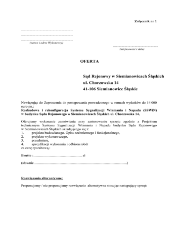 Załącznik nr 1 …................................................................. …................................................................. …................................................................. (nazwa i adres Wykonawcy) …........................................................ (miejscowość i data) OFERTA Sąd Rejonowy w Siemianowicach Śląskich ul. Chorzowska 14 41-106 Siemianowice Śląskie Nawiązując do Zaproszenia do postępowania prowadzonego w ramach wydatków do 14 000 euro pn.: Rozbudowa i rekonfiguracja Systemu Sygnalizacji Włamania i Napadu (SSWiN) w budynku Sądu Rejonowego w Siemianowicach Śląskich ul. Chorzowska 14, Oferujemy wykonanie zamówienia przy zastosowaniu sprzętu zgodnie z Projektem technicznym Systemu Sygnalizacji Włamania i Napadu budynku Sądu Rejonowego w Siemianowicach Śląskich składającego się z: 1. projektu budowlanego. Opisu technicznego i funkcjonalnego, 2. projektu wykonawczego, 3. przedmiaru, 4. specyfikacji wykonania i odbioru robót za cenę ryczałtową,: Brutto :...................................................... zł (słownie .......................................................................................................) Rozwiązania alternatywne: Proponujemy / nie proponujemy rozwiązanie alternatywne stosując następujący sprzęt: Lp Nazwa Producenta sprzętu, typ, elementy składowe Łączna cena ryczałtowa za całość usługi 1 2 …. RAZEM BRUTTO 1. Oświadczamy, Ŝe podstawowa cena ryczałtowa została obliczona w oparciu o projekt techniczny. 2. Oświadczamy, Ŝe oferta alternatywna uwzględnia wszystkie wymagania Zamawiającego i zawiera wszystkie niezbędne do jego uruchomienia urządzenia. 3. Oświadczamy, Ŝe zostaliśmy zapoznani z wszystkimi szczegółami niezbędnymi do opracowania oferty oraz zdobyliśmy konieczne informacje do właściwego przygotowania oferty i wykonania zamówienia. 4. Oświadczamy, Ŝe zobowiązujemy się, w przypadku wyboru naszej oferty, do zawarcia umowy na warunkach określonych w zaproszeniu, w miejscu i terminie wyznaczonym przez Zamawiającego. 5. Oświadczamy, Ŝe posiadamy odpowiednie uprawnienia do wykonania zamówienia zgodnie z obowiązującymi przepisami prawa. 6. Oświadczamy, Ŝe zobowiązujemy się, w przypadku wyboru naszej oferty, wykonać instalację w terminie do ……… dni od daty podpisania umowy. 7. Oświadczamy, Ŝe uwaŜamy się za związanych niniejszą ofertą na okres …...… dni (minimum 30 dni), licząc od dania upływu terminu składania ofert. 8. Oświadczamy, Ŝe przedstawione w ofercie ceny nie stanowią cen dumpingowych i złoŜenie oferty nie stanowi czynu nieuczciwej konkurencji. 9. Oświadczamy, Ŝe udzielamy ……… miesięcy gwarancji na wykonaną instalację oraz ……… miesięcy gwarancji na wykorzystany sprzęt (minimum 36 miesięcy). 10. WyraŜamy zgodę na konserwację SSWiN przez firmę posiadającą odpowiednie kwalifikacje, z którą Zamawiający zawarł umowę o konserwację SSWiN i zachowanie gwarancji na zainstalowane nowe urządzenia. 11. Warunki płatności : przelew w terminie 30 dni od daty otrzymania prawidłowo wystawionej faktury VAT. ............................, dnia....................2011r. ( Miejscowość ) ……………………………………… (pieczęć i podpisy upowaŜnionych przedstawicieli Wykonawcy)
