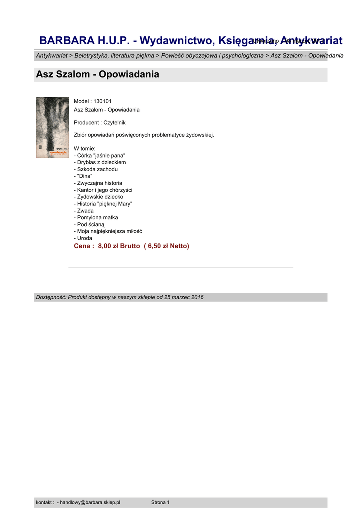 Utworzono Antykwariat : 08 marzec 2017 BARBARA H.U.P. - Wydawnictwo, Księgarnia, Antykwariat > Beletrystyka, literatura piękna > Powieść obyczajowa i psychologiczna > Asz Szalom - Opowiadania Asz Szalom - Opowiadania Model : 130101 Asz Szalom - Opowiadania Producent : Czytelnik Zbiór opowiadań poświęconych problematyce żydowskiej. W tomie: - Córka "jaśnie pana" - Dryblas z dzieckiem - Szkoda zachodu - "Dina" - Zwyczajna historia - Kantor i jego chórzyści - Żydowskie dziecko - Historia "pięknej Mary" - Zwada - Pomylona matka - Pod ścianą - Moja najpiękniejsza miłość - Uroda Cena : 8,00 zł Brutto ( 6,50 zł Netto) Dostępność: Produkt dostępny w naszym sklepie od 25 marzec 2016 kontakt : - [email protected] Strona 1