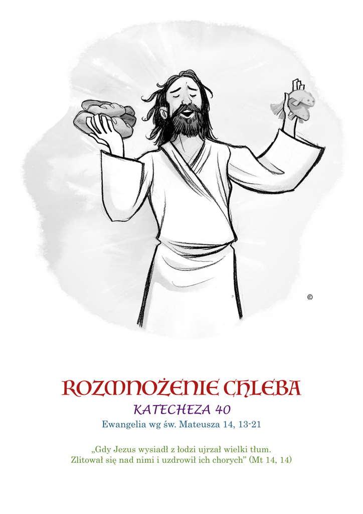 ROZMNOŻENIE CHLEBA KATECHEZA 40 Ewangelia wg św. Mateusza 14, 13-21 „Gdy Jezus wysiadł z łodzi ujrzał wielki tłum. Zlitował się nad nimi i uzdrowił ich chorych” (Mt 14, 14) Ewangelia wg św. Mateusza rozdział 14 wersy 13-21 Jezus oddalił się stamtąd w łodzi na miejsce pustynne, osobno. Lecz tłumy zwiedziały się o tym i z miast poszły za Nim pieszo. Gdy wysiadł, ujrzał wielki tłum. Zlitował się nad nimi i uzdrowił ich chorych. A gdy nastał wieczór, przystąpili do Niego uczniowie i rzekli: «Miejsce to jest puste i pora już spóźniona. Każ więc rozejść się tłumom: niech idą do wsi i zakupią sobie żywności!» Lecz Jezus im odpowiedział: «Nie potrzebują odchodzić; wy dajcie im jeść!» Odpowiedzieli Mu: «Nie mamy tu nic prócz pięciu chlebów i dwóch ryb». On rzekł: «Przynieście Mi je tutaj!» Kazał tłumom usiąść na trawie, następnie wziąwszy pięć chlebów i dwie ryby, spojrzał w niebo, odmówił błogosławieństwo i połamawszy chleby dał je uczniom, uczniowie zaś tłumom. Jedli wszyscy do sytości, i zebrano z tego, co pozostało, dwanaście pełnych koszy ułomków. Tych zaś, którzy jedli, było około pięciu tysięcy mężczyzn, nie licząc kobiet i dzieci. WERS DO ZAPAMIĘTANIA PRZEZ DZIECKO: „Gdy Jezus wysiadł z łodzi ujrzał wielki tłum. Zlitował się nad nimi i uzdrowił ich chorych” (Mt 14, 14) PROPOZYCJA PRACY Z DZIECKIEM DLA RODZICÓW: Katecheza powinna prowadzić do zrozumienia przez dziecko, że cuda, których dokonuje Jezus są dla ludzi dowodem Jego boskości. Zgromadzony tłum chętnie słucha. Jednak pora robi się późna i czas na posiłek. Apostołowie rozsądnie postępują prosząc Jezusa, by odprawił tłum. Jednak Jezus wykorzystuje ten moment, by pokazać kim naprawdę jest. Ktoś miał ze sobą bardzo popularny w tamtych czasach posiłek: podpłomyki, czyli płaskie chlebki oraz suszone ryby. Jezus łamie te pięć chlebów i podaje przez swoich uczniów zgłodniałym słuchaczom. Rozmnożenie chleba i nakarmienie 5-u tysięcy jest zapowiedzią Eucharystii. Sakramentu, w którym Bóg pod postacią chleba staje się dla nas pokarmem na życie wieczne. PROPOZYCJE ZABAWY Z DZIECKIEM: a. Ewangelia mówi o nakarmieniu 5-u tysięcy mężczyzn, nie licząc kobiet i dzieci. Egzegeci twierdzą, że w sumie mogło być około 15 000 osób (to tyle, ile zapełni połowę stadionu Sheffield United!). Razem z dzieckiem odszukać w encyklopedii lub w internecie miasteczko, które ma około 15 tysięcy mieszkańców. Następnie odszukać je na mapie. Można też poszukać zdjęć tego miasteczka. b. Jeśli dziecko chce spróbować, jak smakował posiłek, który zjedli słuchacze Jezusa, można go bardzo łatwo przygotować w domu. Wystarczy kupić w sklepie indyjskie płaskie chlebki oraz puszkę grillowanych sardynek. Smacznego! MODLITWA DO ODMAWIANIA PRZEZ CAŁY TYDZIEŃ: Dobry Boże, Ty jesteś wspaniały. Nakarmiłeś tysiące głodnych pięcioma chlebami i dwoma rybami. Pokazałeś, że troszczysz się o nasze potrzeby. Proszę, opiekuj się całą naszą rodziną. Amen.