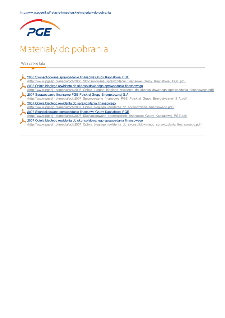 http://ww.w.pgeej1.pl/relacje-inwestorskie/materialy-do-pobrania Materiały do pobrania Wszystkie lata 2008 Skonsolidowane sprawozdanie finansowe Grupy Kapitałowej PGE (http://ww.w.pgeej1.pl/media/pdf/2008_Skonsolidwane_sprawozdanie_finansowe_Grupy_Kapitalowej_PGE.pdf) 2008 Opinia biegłego rewidenta do skonsolidowanego sprawozdania finansowego (http://ww.w.pgeej1.pl/media/pdf/2008_Opinia_i_raport_bieglego_rewidenta_do_skonsolidowanego_sprawozdania_finansowego.pdf) 2007 Sprawozdanie finansowe PGE Polskiej Grupy Energetycznej S.A. (http://ww.w.pgeej1.pl/media/pdf/2007_Sprawozdanie_finansowe_PGE_Polskiej_Grupy_Energetycznej_S.A.pdf) 2007 Opinia biegłego rewidenta do sprawozdania finansowego (http://ww.w.pgeej1.pl/media/pdf/2007_Opinia_bieglego_rewidenta_do_sprawozdania_finansowego.pdf) 2007 Skonsolidowane sprawozdanie finansowe Grupy Kapitałowej PGE (http://ww.w.pgeej1.pl/media/pdf/2007_Skonsolidowane_sprawozdanie_finansowe_Grupy_Kapitalowej_PGE.pdf) 2007 Opinia biegłego rewidenta do skonsolidowanego sprawozdania finansowego (http://ww.w.pgeej1.pl/media/pdf/2007_Opinia_bieglego_rewidenta_do_skonsolidowanego_sprawozdania_finansowego.pdf)