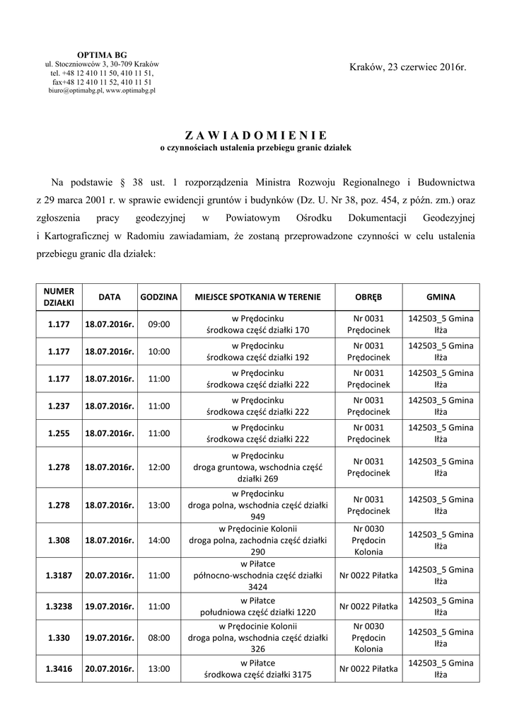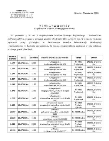 OPTIMA BG ul. Stoczniowców 3, 30-709 Kraków tel. +48 12 410 11 50, 410 11 51, fax+48 12 410 11 52, 410 11 51 Kraków, 23 czerwiec 2016r. [email protected], www.optimabg.pl ZAWIADOMIENIE o czynnościach ustalenia przebiegu granic działek Na podstawie § 38 ust. 1 rozporządzenia Ministra Rozwoju Regionalnego i Budownictwa z 29 marca 2001 r. w sprawie ewidencji gruntów i budynków (Dz. U. Nr 38, poz. 454, z późn. zm.) oraz zgłoszenia pracy geodezyjnej w Powiatowym Ośrodku Dokumentacji Geodezyjnej i Kartograficznej w Radomiu zawiadamiam, że zostaną przeprowadzone czynności w celu ustalenia przebiegu granic dla działek: NUMER DZIAŁKI DATA GODZINA MIEJSCE SPOTKANIA W TERENIE OBRĘB GMINA 1.177 18.07.2016r. 09:00 w Prędocinku środkowa część działki 170 Nr 0031 Prędocinek 142503_5 Gmina Iłża 1.177 18.07.2016r. 10:00 w Prędocinku środkowa część działki 192 Nr 0031 Prędocinek 142503_5 Gmina Iłża 1.177 18.07.2016r. 11:00 w Prędocinku środkowa część działki 222 Nr 0031 Prędocinek 142503_5 Gmina Iłża 1.237 18.07.2016r. 11:00 w Prędocinku środkowa część działki 222 Nr 0031 Prędocinek 142503_5 Gmina Iłża 1.255 18.07.2016r. 11:00 w Prędocinku środkowa część działki 222 Nr 0031 Prędocinek 142503_5 Gmina Iłża 1.278 18.07.2016r. 12:00 w Prędocinku droga gruntowa, wschodnia część działki 269 Nr 0031 Prędocinek 142503_5 Gmina Iłża 1.278 18.07.2016r. 13:00 1.308 18.07.2016r. 14:00 1.3187 20.07.2016r. 11:00 1.3238 19.07.2016r. 11:00 1.330 19.07.2016r. 08:00 1.3416 20.07.2016r. 13:00 w Prędocinku Nr 0031 142503_5 Gmina droga polna, wschodnia część działki Prędocinek Iłża 949 Nr 0030 w Prędocinie Kolonii 142503_5 Gmina Prędocin droga polna, zachodnia część działki Iłża Kolonia 290 w Piłatce 142503_5 Gmina północno‐wschodnia część działki Nr 0022 Piłatka Iłża 3424 w Piłatce 142503_5 Gmina Nr 0022 Piłatka południowa część działki 1220 Iłża w Prędocinie Kolonii Nr 0030 142503_5 Gmina droga polna, wschodnia część działki Prędocin Iłża 326 Kolonia w Piłatce 142503_5 Gmina Nr 0022 Piłatka środkowa część działki 3175 Iłża 1.3466 20.07.2016r. 14:00 1.940 18.07.2016r. 13:00 1.949 18.07.2016r. 12:00 1.949 18.07.2016r. 13:00 2.1275 18.07.2016r. 14:00 12.3344 21.07.2016r. 11:00 12.3344 21.07.2016r. 12:00 12.3344 21.07.2016r. w Piłatce 142503_5 Gmina Nr 0022 Piłatka środkowa część działki 3162/2 Iłża w Prędocinku Nr 0031 142503_5 Gmina droga polna, wschodnia część działki Prędocinek Iłża 949 w Prędocinku droga gruntowa, wschodnia część działki 269 Nr 0031 Prędocinek 142503_5 Gmina Iłża Nr 0031 Prędocinek 142503_5 Gmina Iłża Nr 0004 Chwałowice 142503_5 Gmina Iłża Nr 0001 Iłża 142503_4 Miasto Iłża w Piłatce środkowa część działki 3348 Nr 0001 Iłża 142503_4 Miasto Iłża 13:00 w Piłatce droga polna, północno‐wschodnia część działki 3340 Nr 0001 Iłża 142503_4 Miasto Iłża 11.2855/4 21.07.2016r. 13:00 w Piłatce droga polna, północno‐wschodnia część działki 3340 Nr 0001 Iłża 142503_4 Miasto Iłża 11.2855/4 21.07.2016r. 14:00 Nr 0001 Iłża 142503_4 Miasto Iłża 6.2542/4 22.07.2016r. 11:00 Nr 0001 Iłża 142503_4 Miasto Iłża w Prędocinku droga polna, wschodnia część działki 949 w Prędocinie Kolonii droga polna, zachodnia część działki 290 w Piłatce północna częśc działki 3368 w Piłatce środkowa część działki 3314 w Iłży północno ‐ wschodnia część działki 2571 Powyższe postępowanie prowadzone jest w celu przygotowania dokumentacji dla wydania decyzji ZRID (droga wojewódzka 747), w związku z tym, zapraszam do wzięcia udziału w opisanych czynnościach. ............................................... ( podpis ) POUCZENIE Nieusprawiedliwione niestawiennictwo stron nie wstrzymuje czynności geodety – art. 32 ust. 3 ustawy z 17 maja 1989 r. – Prawo geodezyjne i kartograficzne(tekst jedn. Dz.U. z 2010 r.Nr 193, poz. 1287 ze zm.). W razie usprawiedliwionego niestawiennictwa strony geodeta wstrzymuje czynności do czasu ustania przeszkody lub wyznaczenia pełnomocnika – nie dłużej jednak niż na okres miesiąca – art. 32 ust. 4 ustawy z 17 maja 1989 r. – Prawo geodezyjne i kartograficzne(tekst jedn. Dz.U. z 2010 r. Nr 193, poz. 1287 ze zm.). Zawiadomieni właściciele nieruchomości proszeni są o przybycie w oznaczonym terminie i miejscu ze wszystkimi dokumentami, jakie mogą być przydatne przy wykonywaniu czynności ustalenia granic działek ewidencyjnych oraz dokumentami potwierdzającymi ich tożsamość. W imieniu osób nieobecnychmogą występować odpowiednio upoważnieni pełnomocnicy. W przypadku współwłasności lub współużytkowania wieczystego, małżeńskiej wspólnoty ustawowej, itp. – uczestnikami postępowania są wszystkie strony mające tytuł prawny do nieruchomości.