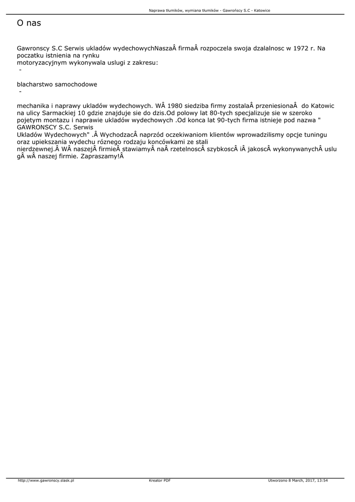 Naprawa tłumików, wymiana tłumików - Gawrońscy S.C - Katowice O nas Gawronscy S.C Serwis ukladów wydechowychNasza firma rozpoczela swoja dzalalnosc w 1972 r. Na poczatku istnienia na rynku motoryzacyjnym wykonywala uslugi z zakresu: blacharstwo samochodowe mechanika i naprawy ukladów wydechowych. W 1980 siedziba firmy zostala przeniesiona do Katowic na ulicy Sarmackiej 10 gdzie znajduje sie do dzis.Od polowy lat 80-tych specjalizuje sie w szeroko pojetym montazu i naprawie ukladów wydechowych .Od konca lat 90-tych firma istnieje pod nazwa " GAWRONSCY S.C. Serwis Ukladów Wydechowych" . Wychodzac naprzód oczekiwaniom klientów wprowadzilismy opcje tuningu oraz upiekszania wydechu róznego rodzaju koncówkami ze stali nierdzewnej. W naszej firmie stawiamy na rzetelnosc szybkosc i jakosc wykonywanych uslu g w naszej firmie. Zapraszamy! http://www.gawronscy.slask.pl Kreator PDF Utworzono 8 March, 2017, 13:54