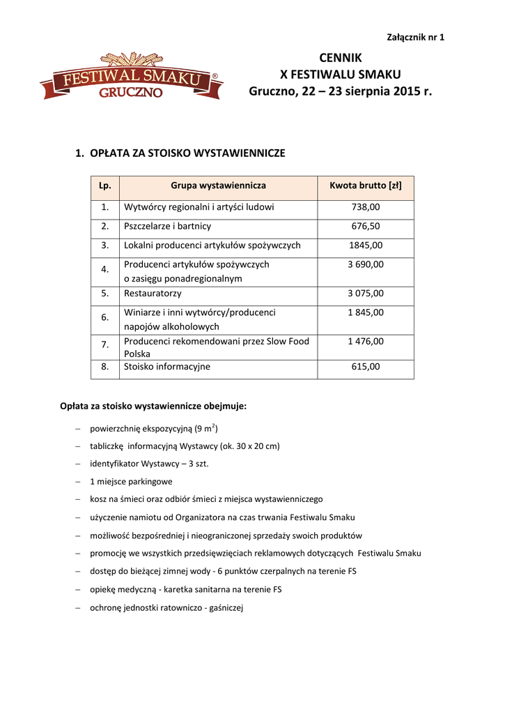 Załącznik nr 1 CENNIK X FESTIWALU SMAKU Gruczno, 22 – 23 sierpnia 2015 r. 1. OPŁATA ZA STOISKO WYSTAWIENNICZE Lp. Grupa wystawiennicza Kwota brutto [zł] 1. Wytwórcy regionalni i artyści ludowi 738,00 2. Pszczelarze i bartnicy 676,50 3. Lokalni producenci artykułów spożywczych 1845,00 4. Producenci artykułów spożywczych o zasięgu ponadregionalnym Restauratorzy 3 690,00 Winiarze i inni wytwórcy/producenci napojów alkoholowych Producenci rekomendowani przez Slow Food Polska Stoisko informacyjne 1 845,00 5. 6. 7. 8. 3 075,00 1 476,00 615,00 Opłata za stoisko wystawiennicze obejmuje: powierzchnię ekspozycyjną (9 m2) tabliczkę informacyjną Wystawcy (ok. 30 x 20 cm) identyfikator Wystawcy – 3 szt. 1 miejsce parkingowe kosz na śmieci oraz odbiór śmieci z miejsca wystawienniczego użyczenie namiotu od Organizatora na czas trwania Festiwalu Smaku możliwość bezpośredniej i nieograniczonej sprzedaży swoich produktów promocję we wszystkich przedsięwzięciach reklamowych dotyczących Festiwalu Smaku dostęp do bieżącej zimnej wody - 6 punktów czerpalnych na terenie FS opiekę medyczną - karetka sanitarna na terenie FS ochronę jednostki ratowniczo - gaśniczej 2. ZAPOTRZEBOWANIE NA PRZYŁĄCZE ENERGETYCZNE Lp. Przewidywany pobór prądu Kwota brutto [zł] 1. Opcja 1 – urządzenia do 2 kW 150,00 2. Opcja 2 – urządzenia od 2 kW do 4 kW 250,00 3. Opcja 3 – urządzenia od 4 kW do 8 kW 600,00 4. Opcja 4 – urządzenia powyżej 8 kW 1 200,00 3. DODATKOWA POWIERZCHNIA EKSPOZYCJNA Lp. 1. Powierzchnia ekspozycyjna Dodatkowa powierzchnia Kwota brutto za 1 m2 [zł] 60,00 4. ZGŁOSZENIE PRODUKTÓW DO KONKURSU Lp. 1. 2. 3. Nazwa konkursu Smak Roku Miód Roku Turniej Nalewek Kwota brutto za 1 produkt [zł] 10,00 10,00 zwolniona Gruczno, 13 marca 2015 r.