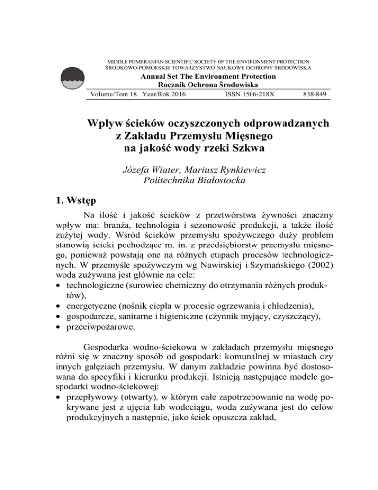 MIDDLE POMERANIAN SCIENTIFIC SOCIETY OF THE ENVIRONMENT PROTECTION ŚRODKOWO-POMORSKIE TOWARZYSTWO NAUKOWE OCHRONY ŚRODOWISKA Annual Set The Environment Protection Rocznik Ochrona Środowiska Volume/Tom 18. Year/Rok 2016 ISSN 1506-218X 838-849 Wpływ ścieków oczyszczonych odprowadzanych z Zakładu Przemysłu Mięsnego na jakość wody rzeki Szkwa Józefa Wiater, Mariusz Rynkiewicz Politechnika Białostocka 1. Wstęp Na ilość i jakość ścieków z przetwórstwa żywności znaczny wpływ ma: branża, technologia i sezonowość produkcji, a także ilość zużytej wody. Wśród ścieków przemysłu spożywczego duży problem stanowią ścieki pochodzące m. in. z przedsiębiorstw przemysłu mięsnego, ponieważ powstają one na różnych etapach procesów technologicznych. W przemyśle spożywczym wg Nawirskiej i Szymańskiego (2002) woda zużywana jest głównie na cele: • technologiczne (surowiec chemiczny do otrzymania różnych produktów), • energetyczne (nośnik ciepła w procesie ogrzewania i chłodzenia), • gospodarcze, sanitarne i higieniczne (czynnik myjący, czyszczący), • przeciwpożarowe. Gospodarka wodno-ściekowa w zakładach przemysłu mięsnego różni się w znaczny sposób od gospodarki komunalnej w miastach czy innych gałęziach przemysłu. W danym zakładzie powinna być dostosowana do specyfiki i kierunku produkcji. Istnieją następujące modele gospodarki wodno-ściekowej: • przepływowy (otwarty), w którym całe zapotrzebowanie na wodę pokrywane jest z ujęcia lub wodociągu, woda zużywana jest do celów produkcyjnych a następnie, jako ściek opuszcza zakład, Wpływ ścieków oczyszczonych odprowadzanych z Zakładu… 839 • szeregowy, w którym woda wykorzystywana jest w następujących po sobie działach zakładu, a ścieki, których nie można powtórnie wykorzystać są odprowadzane z zakładu, • obiegowy (zamknięty), w którym ta sama woda znajdująca się w obiegu, jest stale wykorzystywana, a woda świeża z ujęcia pokrywa jedynie straty, • kombinowany (mieszany), w którym działy lub urządzenia zaopatrywane są w wodę za pomocą różnych systemów. Przedstawione modele realizowane są poprzez odpowiednie systemy wodno-ściekowe, składające się z urządzeń i przewodów doprowadzających wodę oraz układu odprowadzającego ścieki (Nawirska i Szymański 2002, Malińska 2005). Racjonalne prowadzenie gospodarki ściekowej w zakładach przetwórstwa mięsnego na pierwszym miejscu powinno objąć minimalizację zużycia wody i minimalizację produkcji odpadów przedostających się do ścieków (Kubicki i Niewiadomska 1999, Tomczak-Wandzel i in. 2004). Może to zapoczątkować w zakładach przemysłu spożywczego poprawę oraz zwiększenie efektów ekonomicznych, a także również w ogromnym stopniu poprawić wizerunek przedsiębiorstwa, który stosuje technologie i wytwarza produkty przyjazne środowisku naturalnemu (TomczakWendzel i in. 2004, Malińska 2005). Celem pracy była analiza wpływu ścieków oczyszczonych odprowadzanych z zakładu przemysłu mięsnego do kanału Kaczor, a następnie do rzeki Szkwa i wpływ na jakość wody tego cieku i rzeki. Prowadzone badania dotyczyły sprawdzenie stopnia samooczyszczania ścieków na odcinku zakładu do rzeki. 2. Metodyka badań W celu określenia wahań składu fizyczno-chemicznego i stopnia samooczyszczania wody w rowie melioracyjnym i kanale melioracyjnym próbki pobierano w sześciu punktach. Punktem pierwszym był rów melioracji podstawowej kanał Kaczor 200 m przed połączeniem z rowem melioracji szczegółowej i stanowił punkt odniesienia dla pozostałych punktów. W punkcie drugim znajduje się wylot ścieków z ZPM „JBB” do rowu melioracji szczegółowej. Punkt trzeci to wlot rowu melioracji 840 Józefa Wiater, Mariusz Rynkiewicz szczegółowej do kanału Kaczor. Dwa następne punkty wyznaczono w pobliżu dróg gminnych. Ostatni szósty punkt wyznaczono przy ujściu kanału Kaczor do rzeki Szkwy. Wszystkie punkty otoczone były łąkami lub pastwiskami. Badania wykonano w trzech powtórzeniach dla każdej próbki. Następnie wyniki pogrupowano na pory roku i podano jako średnie kwartalne. Otrzymane wyniki poddano analizie statystycznej z wykorzystaniem programu STATISTICA 10 (StarSoft, Inc, 2011). Różnice oceniono przy użyciu testu Tukeya na poziomie istotności α = 0,05; wykorzystując pakiet ANOVA. 3. Omówienie wyników badań i dyskusja Skład wód powierzchniowych jest funkcją wielu parametrów, których udział charakteryzuje się dużą zmiennością w czasie i przestrzeni oraz różnorodnością substancji w nich występujących. Kurek (2004), Królak i in. (2011) na podstawie badań twierdzą, że na wysokość wartości ChZT w wodach rzek wpływała nieuporządkowana gospodarka ściekowa w ich zlewniach, Najwyższe wartości ChZT na poziomie 73,36 mg O2/dm3 zarejestrowano dla prób z drugiego punktu poboru tj. wylotu ścieków z ZMP „JBB”. Wartość ChZT była zdecydowanie niższa w pierwszym punkcie kontrolnym tj. w rowie melioracji podstawowej, przed wylotem rowu melioracji szczegółowej i wynosiła 19,05 mg O2/dm3. ChZT dla wody z pozostałych punktów kontroli pomiarowej (3-6) wskazuje na jego obniżenie w miarę wzrostu odległości od punktu w którym następował zrzut ścieków oczyszczonych z zakładu, w stronę ujścia kanału Kaczor do rzeki. Wartość tego wskaźnika w wodzie punktu szóstego uległa obniżeniu o połowę w stosunku do wody z punktu drugiego. Proces samooczyszczania zanieczyszczeń wód następował zarówno w rowie melioracji szczegółowej jak i podstawowej w Kanale Kaczor. Wartość ChZT zależała również od pory roku, przy czym niższe wartości zanotowano w sezonie wiosna-lato (36,14-38,82 mg O2/dm3), a znacznie wyższe w sezonie jesień-zima (59,54-63,77 mg O2/dm3). Analiza statystyczna potwierdziła, że różnice w ChZT w sezonie wiosennym i letnim nie były statystycznie istotne, podobny rezultat o