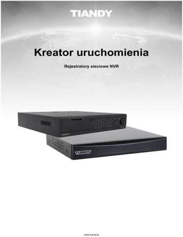 Kreator uruchomienia Rejestratory sieciowe NVR www.tiandy.pl Spis treści 1 Uruchomienie kreatora........................................................................................................................3 2 Wybór języka i rozdzielczości.............................................................................................................3 3 Ustawienie daty i czasu.......................................................................................................................3 4 Ustawienia sieci...................................................................................................................................4 5 Przygotowanie dysku do pracy...........................................................................................................4 6 Wyszukanie kamer..............................................................................................................................6 7 Zakończenie pracy..............................................................................................................................7 2 1 Uruchomienie kreatora Po pierwszym uruchomieniu rejestratora NVR zostanie uruchomiony kreator, który przeprowadzi użytkownika przez proces konfiguracji. 2 Wybór języka i rozdzielczości Należy wybrać żądany język obsługi i dopasować rozdzielczość wyświetlania obrazu do posiadanego monitora/telewizora. 3 Ustawienie daty i czasu Właściwa strefa czasowa dla Polski to GMT+01:00. 3 4 Ustawienia sieci Ustawienia sieci należy dopasować do adresacji używanej w danej sieci lokalnej. 5 Przygotowanie dysku do pracy 4 Po zaznaczeniu dysku na liście należy kliknąć przycisk Inicjalizacja. Uwidoczniony zostanie postęp formatowania dysku twardego. 5 Zakończenie formatowania zostanie potwierdzone komunikatem. Należy kliknąć Potwierdź. Ekran podsumowujący wykonaną operację. 6 Wyszukanie kamer Zaznaczenie pola z lewej strony adresu kamery IP i kliknięcie przycisku Następny spowoduje dodanie jej do podglądu. 6 7 Zakończenie pracy Okno to umożliwia powrót do wcześniejszych ustawień i zakończenie pracy kreatora. Notatki ............................................................................................................................................................................................... ............................................................................................................................................................................................... ............................................................................................................................................................................................... ............................................................................................................................................................................................... ............................................................................................................................................................................................... ............................................................................................................................................................................................... ............................................................................................................................................................................................... ............................................................................................................................................................................................... ............................................................................................................................................................................................... ............................................................................................................................................................................................... ............................................................................................................................................................................................... ............................................................................................................................................................................................... ............................................................................................................................................................................................... ............................................................................................................................................................................................... ............................................................................................................................................................................................... ............................................................................................................................................................................................... ............................................................................................................................................................................................... ............................................................................................................................................................................................... ............................................................................................................................................................................................... ............................................................................................................................................................................................... .......