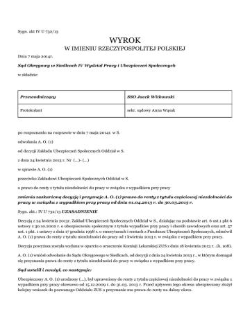 Sygn. akt IV U 732/13 WYROK W IMIENIU RZECZYPOSPOLITEJ POLSKIEJ Dnia 7 maja 2014r. Sąd Okręgowy w Siedlcach IV Wydział Pracy i Ubezpieczeń Społecznych w składzie: Przewodniczący SSO Jacek Witkowski Protokolant sekr. sądowy Anna Wąsak po rozpoznaniu na rozprawie w dniu 7 maja 2014r. w S. odwołania A. O. (1) od decyzji Zakładu Ubezpieczeń Społecznych Oddział w S. z dnia 24 kwietnia 2013 r. Nr (...)- (...) w sprawie A. O. (1) przeciwko Zakładowi Ubezpieczeń Społecznych Oddział w S. o prawo do renty z tytułu niezdolności do pracy w związku z wypadkiem przy pracy zmienia zaskarżoną decyzję i przyznaje A. O. (1) prawo do renty z tytułu częściowej niezdolności do pracy w związku z wypadkiem przy pracy od dnia 01.04.2013 r. do 30.03.2015 r. Sygn. akt.: IV U 732/13 UZASADNIENIE Decyzją z 24 kwietnia 2013r. Zakład Ubezpieczeń Społecznych Oddział w S., działając na podstawie art. 6 ust.1 pkt 6 ustawy z 30.10.2002 r. o ubezpieczeniu społecznym z tytułu wypadków przy pracy i chorób zawodowych oraz art. 57 ust. 1 pkt. 1 ustawy z dnia 17 grudnia 1998 r. o emeryturach i rentach z Funduszu Ubezpieczeń Społecznych, odmówił A. O. (1) prawa do renty z tytułu niezdolności do pracy od 1 kwietnia 2013 r. w związku z wypadkiem przy pracy. Decyzja powyższa została wydana w oparciu o orzeczenie Komisji Lekarskiej ZUS z dnia 18 kwietnia 2013 r. .(k. 108). A. O. (1) wniósł odwołanie do Sądu Okręgowego w Siedlcach, od decyzji z dnia 24 kwietnia 2013 r., w którym domagał się przyznania prawa do renty z tytułu niezdolności do pracy w związku z wypadkiem przy pracy. Sąd ustalił i zważył, co następuje: Ubezpieczony A. O. (1) urodzony (...), był uprawniony do renty z tytułu częściowej niezdolności do pracy w związku z wypadkiem przy pracy okresowo od 15.12.2009 r. do 31.03. 2013 r. Przed upływem tego okresu ubezpieczony złożył kolejny wniosek do pozwanego Oddziału ZUS o przyznanie mu prawa do renty na dalszy okres. W toku postępowania orzeczniczego A. O. (1) został przebadany przez Komisję Lekarską ZUS, która rozpoznała u niego: padaczkę pourazową, zaburzenia osobowości i zachowania u osoby po urazie czaszkowo-mózgowym, przebytym w 2008 r. (k. 6-7 a.l.). W ocenie komisji lekarskiej ZUS, schorzenia te nie powodują aktualnie niezdolności do pracy ubezpieczonego. Organ ten w uzasadnieniu ustaleń orzeczniczych podkreślił, że ubezpieczony dobrze zaadoptował się do obecnej sytuacji i podjął naukę na studiach wyższych. Orzeczenie to stało się podstawą do wydania zaskarżonej z dnia 23 kwietnia 2013 r. (k. 110 a.r.). W toku postępowania odwoławczego Sąd dopuścił dowód z opinii biegłych lekarzy: neurolog, psychiatra, psycholog, chirurg (k. 14), którym zlecił sporządzenie opinii odpowiadającej na pytanie czy ubezpieczony jest zdolny do pracy. Biegli po zbadaniu ubezpieczonego zdiagnozowali u niego następujące schorzenia – określenie chorób: stan po urazie wielonarządowym z urazem czaszkowo-mózgowym (20.06.2008r.). Padaczka pourazowa. Ograniczone zaburzenia emocji i zachowania. Stan po urazie głowy i klatki piersiowej (20.06.2008 r.). (k. 28 a.s.). Zdaniem biegłych schorzenia te powodują w dalszym ciągu częściową niezdolność do pracy ubezpieczonego w związkiem z wypadkiem przy pracy, okresowo od 01.04.2013 r. do 31.03.2015 r. Orzeczenie Komisji ds. orzekania o niepełnosprawności stało się podstawą wydania przez ZUS w dniu 24 kwietnia 2013 r. decyzji odmownej, wydanej na podstawie art. 6 ust. 1 pkt. 6 ustawy z dnia 30.10.2002 r. o ubezpieczeniu społecznym z tytułu wypadków przy pracy i chorób zawodowych. W uzasadnieniu opinii biegli stwierdzili, że główną przyczyną niezdolności do pracy ubezpieczonego, jest jego stan neurologiczny i psychiatryczny. Stan neurologiczny przejawia się głównie w padaczce, która uniemożliwia ubezpieczonemu pracę w określonych zawodach. Biegły psychiatra stwierdził utrzymującą się u ubezpieczonego (mimo leczenia) pobudliwość emocjonalną oraz trudności w kontroli emocji, organiczne zaburzenia osobowości i zachowania o etiologii pourazowej. Do opinii tej zastrzeżenia złożył pozwany organ rentowy, jednocześnie wnosząc o dopuszczenie dowodu z opinii innych biegłych neurologa i psychiatry (k. 36 a.s.). Zastrzeżenia zostały sformułowane w formie załącznika do pisma procesowego (k. 38 a.s.). W zastrzeżeniach tych stwierdzono, że opinia nie zawiera odniesienia do wykształcenia ubezpieczonego, który posiada wykształcenie średnie ogólne. W przeszłości wykonywał różne prace, takie jak przedstawiciel handlowy, pakowacz. Ponadto obecnie jest w trakcie nauki – studia wyższe na kierunku: zdrowie publiczne. Ponadto organ rentowy twierdzi, że w badaniu psychiatrycznym nie stwierdzono istotnych funkcjonalnie deficytów neurologicznych. W skutek czego nie może on wykonywać wielu prac (miedzy innymi: obsługiwać urządzeń w ruchu albo pracować na wysokości). Przyczyną stanu zdrowia i chorób ubezpieczonego, zdaniem biegłych, jest wypadek komunikacyjny jakiemu uległ on w dniu 20 czerwca 2008 r. Biegli nie podzielają w tym względzie opinii Komisji Lekarskiej ZUS, na podstawie której wydano decyzję odmawiającą ubezpieczonemu prawa do renty z powodu częściowej niezdolności do pracy. Następnie Organ Rentowy zakwestionował opinię wydaną w sprawie przez biegłych sądowych, przedstawił stanowisko Przewodniczącego Komisji Lekarskiej ZUS oraz wniósł o powołanie innego biegłego sądowego lekarza neurologa i psychiatrę. Ubezpieczony wyjaśnił, że jest na III roku studiów licencjackich i powodu, że trzy razy miał atak padaczki i musiał wziąć urlop dziekański po dwóch latach nauki. Jest na 6 semestrze nauki a program studiów przewiduje 7 semestrów. Pozostał mu więc jeszcze jeden semestr. Ponadto ubezpieczony wyjaśnił, że studia podjął w związku z zaleceniem lekarza neurologa, po to aby ćwiczyć pamięć