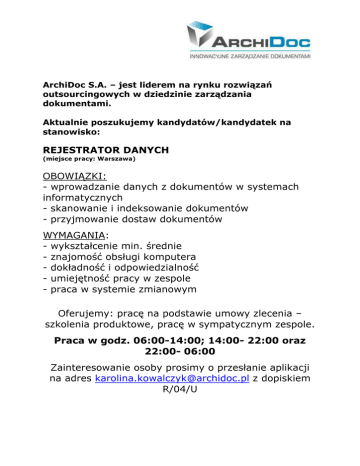 ArchiDoc S.A. – jest liderem na rynku rozwiązań outsourcingowych w dziedzinie zarządzania dokumentami. Aktualnie poszukujemy kandydatów/kandydatek na stanowisko: REJESTRATOR DANYCH (miejsce pracy: Warszawa) OBOWIĄZKI: - wprowadzanie danych z dokumentów w systemach informatycznych - skanowanie i indeksowanie dokumentów - przyjmowanie dostaw dokumentów WYMAGANIA: - wykształcenie min. średnie - znajomość obsługi komputera - dokładność i odpowiedzialność - umiejętność pracy w zespole - praca w systemie zmianowym Oferujemy: pracę na podstawie umowy zlecenia – szkolenia produktowe, pracę w sympatycznym zespole. Praca w godz. 06:00-14:00; 14:00- 22:00 oraz 22:00- 06:00 Zainteresowanie osoby prosimy o przesłanie aplikacji na adres [email protected] z dopiskiem R/04/U