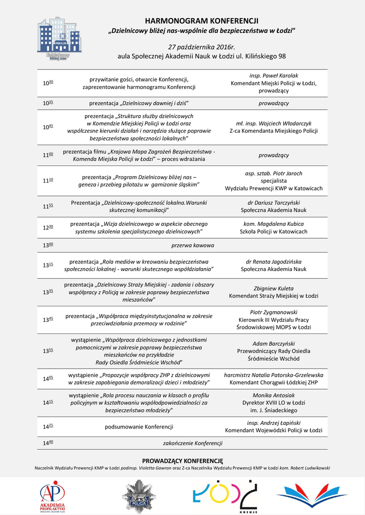 HARMONOGRAM KONFERENCJI „Dzielnicowy bliżej nas-wspólnie dla bezpieczeństwa w Łodzi” 27 października 2016r. aula Społecznej Akademii Nauk w Łodzi ul. Kilińskiego 98 1030 przywitanie gości, otwarcie Konferencji, zaprezentowanie harmonogramu Konferencji insp. Paweł Karolak Komendant Miejski Policji w Łodzi, prowadzący 1035 prezentacja „Dzielnicowy dawniej i dziś” prowadzący prezentacja „Struktura służby dzielnicowych w Komendzie Miejskiej Policji w Łodzi oraz współczesne kierunki działań i narzędzia służące poprawie bezpieczeństwa społeczności lokalnych” mł. insp. Wojciech Włodarczyk Z-ca Komendanta Miejskiego Policji 1100 prezentacja filmu „Krajowa Mapa Zagrożeń Bezpieczeństwa Komenda Miejska Policji w Łodzi” – proces wdrażania prowadzący 1110 prezentacja „Program Dzielnicowy bliżej nas – geneza i przebieg pilotażu w garnizonie śląskim” asp. sztab. Piotr Jaroch specjalista Wydziału Prewencji KWP w Katowicach 1155 Prezentacja „Dzielnicowy-społeczność lokalna.Warunki skutecznej komunikacji” dr Dariusz Tarczyński Społeczna Akademia Nauk 1230 prezentacja „Wizja dzielnicowego w aspekcie obecnego systemu szkolenia specjalistycznego dzielnicowych” kom. Magdalena Kubica Szkoła Policji w Katowicach 45 10 1300 przerwa kawowa 1315 prezentacja „Rola mediów w kreowaniu bezpieczeństwa społeczności lokalnej - warunki skutecznego współdziałania” dr Renata Jagodzińska Społeczna Akademia Nauk 1335 prezentacja „Dzielnicowy Straży Miejskiej - zadania i obszary współpracy z Policją w zakresie poprawy bezpieczeństwa mieszańców” Zbigniew Kuleta Komendant Straży Miejskiej w Łodzi 1345 prezentacja „Współpraca międzyinstytucjonalna w zakresie przeciwdziałania przemocy w rodzinie” Piotr Zygmanowski Kierownik III Wydziału Pracy Środowiskowej MOPS w Łodzi 1355 wystąpienie „Współpraca dzielnicowego z jednostkami pomocniczymi w zakresie poprawy bezpieczeństwa mieszkańców na przykładzie Rady Osiedla Śródmieście Wschód” Adam Barczyński Przewodniczący Rady Osiedla Śródmieście Wschód 1405 wystąpienie „Propozycje współpracy ZHP z dzielnicowymi w zakresie zapobiegania demoralizacji dzieci i młodzieży” harcmistrz Natalia Patorska-Grzelewska Komendant Chorągwii Łódzkiej ZHP 1415 wystąpienie „Rola procesu nauczania w klasach o profilu policyjnym w kształtowaniu współodpowiedzialności za bezpieczeństwo młodzieży” Monika Antosiak Dyrektor XVIII LO w Łodzi im. J. Śniadeckiego 1425 podsumowanie Konferencji insp. Andrzej Łapiński Komendant Wojewódzki Policji w Łodzi 1440 zakończenie Konferencji PROWADZĄCY KONFERENCJĘ Naczelnik Wydziału Prewencji KMP w Łodzi podinsp. Violetta Gawron oraz Z-ca Naczelnika Wydziału Prewencji KMP w Łodzi kom. Robert Ludwikowski