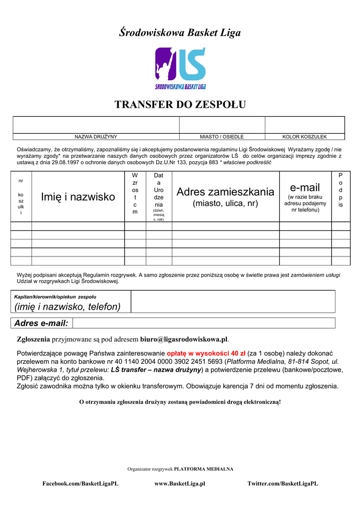 Środowiskowa Basket Liga TRANSFER DO ZESPOŁU NAZWA DRUŻYNY MIASTO / OSIEDLE KOLOR KOSZULEK Oświadczamy, że otrzymaliśmy, zapoznaliśmy się i akceptujemy postanowienia regulaminu Ligi Środowiskowej Wyrażamy zgodę / nie wyrażamy zgody* na przetwarzanie naszych danych osobowych przez organizatorów LŚ do celów organizacji imprezy zgodnie z ustawą z dnia 29.08.1997 o ochronie danych osobowych Dz.U.Nr 133, pozycja 883 * właściwe podkreślić nr ko sz ulk i Imię i nazwisko W zr os t c m Dat a Uro dze nia Adres zamieszkania (miasto, ulica, nr) (dzień, miesią c, rok) e-mail (w razie braku adresu podajemy nr telefonu) P o d p is Wyżej podpisani akceptują Regulamin rozgrywek. A samo zgłoszenie przez poniższą osobę w świetle prawa jest zamówieniem usługi Udział w rozgrywkach Ligi Środowiskowej. Kapitan/kierownik/opiekun zespołu (imię i nazwisko, telefon) Adres e-mail: Zgłoszenia przyjmowane są pod adresem [email protected]. Potwierdzające powagę Państwa zainteresowanie o płatę w wysokości 40 zł (za 1 osobę) należy dokonać przelewem na konto bankowe nr 40 1140 2004 0000 3902 2451 5693 (Platforma Medialna, 81-814 Sopot, ul. Wejherowska 1, tytuł przelewu: LŚ transfer – nazwa drużyny) a potwierdzenie przelewu (bankowe/pocztowe, PDF) załączyć do zgłoszenia. Zgłosić zawodnika można tylko w okienku transferowym. Obowiązuje karencja 7 dni od momentu zgłoszenia. O otrzymaniu zgłoszenia drużyny zostaną powiadomieni drogą elektroniczną! Organizator rozgrywek PLATFORMA MEDIALNA Facebook.com/BasketLigaPL www.BasketLiga.pl Twitter.com/BasketLigaPL