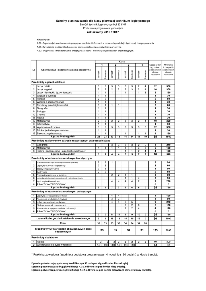 Szkolny plan nauczania dla klasy pierwszej technikum logistycznego Zawód: technik logistyk; symbol 333107 Podbudowa programowa: gimnazjum rok szkolny 2016 / 2017 Kwalifikacje: A.30:Organizacjaimonitorowanieprzepływuzasobówiinformacjiwprocesachprodukcji,dystrybucjiimagazynowania. A.31:Zarządzanieśrodkamitechnicznymipodczasrealizacjiprocesówtransportowych. A.32:Organizacjaimonitorowanieprzepływuzasobówiinformacjiwjednostkachorganizacyjnych. Klasa II semestr I semestr II semestr I semestr II semestr 4 I semestr Obowiązkowe i dodatkowe zajęcia edukacyjne 3 II semestr Lp 2 I semestr 1 3 2 1 1 2 1 1 1 1 1 1 2 1 3 1 1 23 3 2 1 1 2 1 1 1 1 1 1 2 1 3 1 1 23 3 2 1 3 2 1 3 3 1 3 3 1 2 2 1 4 4 3 Liczba godzin Minimalna tygodniowo liczba godzin w czteroletnim w czteroletnim okresie okresie nauczania nauczania Przedmioty ogólnokształcące 1 2 3 4 5 6 7 8 9 10 11 12 13 14 15 16 Język polski Język angielski Język niemiecki / Język francuski Wiedza o kulturze Historia Wiedza o społeczeństwie Podstawy przedsiębiorczości Geografia Biologia Chemia Fizyka Matematyka Informatyka Wychowanie fizyczne Edukacja dla bezpieczeństwa Zajęcia z wychowawcą Łączna liczba godzin 1 1 2 2 3 3 2 4 3 3 3 3 3 3 1 13 1 13 1 14 1 14 1 11 1 19 3 1 1 5 3 1 1 5 2 3 2 7 2 3 4 9 12 10 5 1 2 1 2 1 1 1 1 10 1 12 1 4 65 360 300 150 30 60 30 60 30 30 30 30 300 30 360 30 120 1950 Przedmioty realizowane w zakresie rozszerzonym oraz uzupełniające 1 Geografia 2 Matematyka 3 Historia i społeczeństwo - przedmiot uzupełniający Łączna liczba godzin 1 1 3 1 3 1 1 1 4 4 2 2 3 2 2 2 3 2 1 1 2 2 4 8 6 4 18 240 180 120 540 Przedmioty w kształceniu zawodowym teoretycznym 1 2 3 4 5 6 7 8 Przedsiębiorstwologistycznewgospodarcerynkowej Logistykawprocesachprodukcji Zapasyimagazynowanie Dystrybucja Procesytransportowewlogistyce 4 1 1 4 1 1 4 4 2 7 7 6 6 6 4 3 4 4 3 4 Logistykawjednostkachgospodarczychiadministracyjnych Językangielskizawodowy PRAKTYKA ZAWODOWA* Łączna liczba godzin 9 9 3 2 3 2 3 3 9 0 0 25 90 60 90 60 90 90 270 0 750 Przedmioty w kształceniu zawodowym praktycznym 1 2 3 4 5 6 Logistykazaopatrzeniaiprodukcji Planowanieprodukcjiidystrybucji Usługitransportowo-spedycyjne Obsługajednostekzewnętrznych Planowanieprzepływuzasobówiinformacji 5 2 2 5 2 2 6 4 4 3 9 5 4 0 PRAKTYKA ZAWODOWA* Łączna liczba godzin 0 0 11 11 9 9 10 0 Łączna liczba godzin kształcenia zawodowego 9 9 18 18 15 15 16 0 Rzem 33 33 35 35 34 34 34 28 Tygodniowy wymiar godzin obowiązkowych zajęć edukacyjnych 33 35 34 31 120 90 270 150 120 0 750 25 50 1500 133 3990 10 1,4 300 42 Przedmioty dodatkowe 1 2 Religia Wychowanie do życia w rodzinie 2 2 2 2 2 2 14R 14R 14R 14R 14R 14R 2 2 * Praktyka zawodowa (zgodnie z podstawą programową) - 4 tygodnie (160 godzin) w klasie trzeciej. EgzaminpotwierdzającypierwsząkwalifikacjęA.30.odbywasiępodkoniecklasydrugiej. EgzaminpotwierdzającydrugąkwalifikacjęA.31.odbywasiępodkoniecklasytrzeciej. EgzaminpotwierdzającytrzeciąkwalifikacjęA.32.odbywasiępodkoniecpierwszegosemestruklasyczwartej.