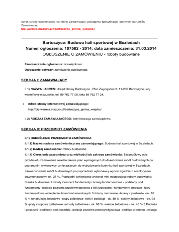 Adres strony internetowej, na której Zamawiający udostępnia Specyfikację Istotnych Warunków Zamówienia: bip.warmia.mazury.pl/bartoszyce_gmina_wiejska/ Bartoszyce: Budowa hali sportowej w Bezledach Numer ogłoszenia: 107582 - 2014; data zamieszczenia: 31.03.2014 OGŁOSZENIE O ZAMÓWIENIU - roboty budowlane Zamieszczanie ogłoszenia: obowiązkowe. Ogłoszenie dotyczy: zamówienia publicznego. SEKCJA I: ZAMAWIAJĄCY I. 1) NAZWA I ADRES: Urząd Gminy Bartoszyce , Plac Zwycięstwa 2, 11-200 Bartoszyce, woj. warmińsko-mazurskie, tel. 89 762 77 00, faks 89 762 77 24. Adres strony internetowej zamawiającego: http://bip.warmia.mazury.pl/bartoszyce_gmina_wiejska/ I. 2) RODZAJ ZAMAWIAJĄCEGO: Administracja samorządowa. SEKCJA II: PRZEDMIOT ZAMÓWIENIA II.1) OKREŚLENIE PRZEDMIOTU ZAMÓWIENIA II.1.1) Nazwa nadana zamówieniu przez zamawiającego: Budowa hali sportowej w Bezledach. II.1.2) Rodzaj zamówienia: roboty budowlane. II.1.4) Określenie przedmiotu oraz wielkości lub zakresu zamówienia: Szczegółowy opis przedmiotu zamówienia określa zakres prac wymaganych do dokończenia robót budowanych po poprzednim wykonawcy, zmierzających do wybudowania budynku hali sportowej w Bezledach. Zaawansowanie robót budowlanych po poprzednim wykonawcy wynosi zgodnie z kosztorysem powykonawczym ok. 27 %. Poprzedni wykonawca wykonał min. następujące roboty budowlane: Branża budowlana 1.roboty ziemne 2.fundamenty i ściany fundamentowe - podkłady pod fundamenty -izolacje poziomą przeciwwilgociową z folii izolacyjnej -fundamenty stopowe i ławy fundamentowe -ocieplenie ścian fundamentowych 3.ściany murowane -ściany z pustaków -ok. 88 % 4.konstrukcje żelbetowe -słupy żelbetowe -belki i podciągi - ok. 80 % -ściany żelbetowe - ok. 93 % -płyty stropowe żelbetowe -schody żelbetowe - ok. 66 % -wieńce żelbetowe - ok. 40 % 5.Podłoża i posadzki -podkłady pod posadzki -izolacja pozioma przeciwwilgociowa -podkład z betonu -izolacja pozioma przeciwwilgociowa pod płytę żelbetową -płyta żelbetowa 6.Elewacja -Ocieplenie ścian styropianem wraz z zamontowaniem siatki na kleju 7.Roboty rozbiórkowe Branża sanitarna 1.przyłącze kanalizacji sanitarnej 2.wykonano poziomy podposadzkowe 3.sieć wodociągowa 4.przełożono sieć cieplną Branża elektryczna 1.Ułożono kabel zasilający docelowy ze złącza kablowego do skrzynki rozdzielczej głównej 2.Wykonano instalacje odgromową wokół budynku Dokładniejszy zakres prac do wykonania określa przedmiar robót załączony do SIWZ. Należy zwrócić uwagę na roboty budowlane, które nie zostały całkowicie wykonane przez poprzedniego wykonawcę. Poprzedni Wykonawca zamontował tylko część marek i okuć stalowych służących do zamontowania dźwigarów dachowych z drewna klejonego, ponadto przedmiotowe marki i okucia nie są zabezpieczone przeciwogniowo i przeciwkorozyjnie. Nie wykonano również dylatacji posadzki hali sportowej. W pozycji uwzględniającej ocieplenie ścian budynku należy uwzględnić brak listew narożnych i wykończeniowych. Biorąc pod uwagę powyższe a także fakt, iż jest to kontynuacja budowy rozpoczętej przez poprzedniego wykonawcę, sporządzający ofertę winien w celu starannego przygotowania oferty dokonać wizji lokalnej w terenie i na tej podstawie zgodnie z dokumentacją oszacować swoją ofertę. Wizji lokalnej można dokonać w dni robocze od poniedziałku do piątku w godzinach 8.00-14.00. O wizji lokalnej należy poinformować zamawiającego z 3 dniowym wyprzedzeniem. Szczegółowy zakres robót objęty przedmiotem umowy określa dokumentacja projektowa: aProjekt budowlany: Budowa hali sportowej przy szkole podstawowej w Bezledach, gm. Bartoszyce wraz z przebudową istniejącego zjazdu z drogi krajowej na działkę, niezbędną infrastrukturą techniczną oraz parkingiem dla samochodów osobowych i drogą wewnętrzną, branża architektura, konstrukcja, instalacje sanitarne, instalacje elektryczne, drogi, b-Projekt budowlany:Przebudowa zjazdu publicznego z drogi krajowej nr 51 w km07+107 (działka o nr ew. 479) na działkę o nr ew. 16/15 w miejscowości Bezledy, Gmina Bartoszyce, cProjekt budowlany: Przyłączy wod.-kan. wraz z przebudową wewnętrznych sieci dla budowanego budynku hali sportowej przy szkole podstawowej w Bezledach, gm. Bartoszyce wraz z przebudową istniejącego zjazdu z drogi krajowej na działkę, niezbędną infrastrukturą techniczną oraz parkingiem dla samochodów osobowych i drogą wewnętrzną, d-Projekt wykonawczy: Budowa hali sportowej przy szkole podstawowej w Bezledach, gm. Bartoszyce wraz z przebudową istniejącego zjazdu z drogi krajowej na działkę, niezbędną infrastrukturą techniczną oraz parkingiem dla samochodów osobowych i drogą wewnętrzną - TOM I: Architektura i zagospodarowanie terenu, e-Projekt wykonawczy: Budowa hali sportowej przy szkole podstawowej w Bezledach, gm. Bartoszyce wraz z przebudową istniejącego zjazdu z drogi krajowej na działkę, niezbędną infrastrukturą techniczną oraz parkingiem dla samochodów osobowych i drogą wewnętrzną - TOM II: Konstrukcja, f-Projekt wykonawczy: Budowa hali sportowej przy szkole podstawowej w Bezledach, gm. Bartoszyce wraz z przebudową istniejącego zjazdu z drogi krajowej na działkę, niezbędną infrastrukturą techniczną oraz parkingiem dla samochodów osobowych i drogą wewnętrzną - TOM III: Instalacje sanitarne, gProjekt wykonawczy: Budowa hali sportowej przy szkole podstawowej w Bezledach, gm. Bartoszyce wraz z przebudową istniejącego zjazdu z drogi krajowej na działkę, niezbędną infrastrukturą techniczną oraz parkingiem dla samochodów osobowych i drogą wewnętrzną - TOM IV: Instalacje elektryczne, h-Projekt wykonawczy: Budowa hali sportowej przy szkole podstawowej w Bezledach, gm. Bartoszyce wraz z przebudową istniejącego zjazdu z drogi krajowej na działkę, niezbędną infrastrukturą techniczną oraz parkingiem dla samochodów osobowych i drogą wewnętrzną - T