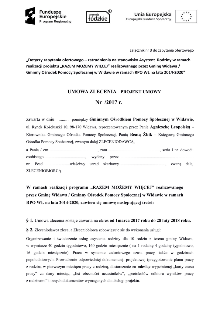 załącznik nr 3 do zapytania ofertowego „Dotyczy zapytania ofertowego – zatrudnienia na stanowisko Asystent Rodziny w ramach realizacji projektu „RAZEM MOŻEMY WIĘCEJ” realizowanego przez Gminę Widawa / Gminny Ośrodek Pomocy Społecznej w Widawie w ramach RPO WŁ na lata 2014-2020” UMOWA ZLECENIA - PROJEKT UMOWY Nr /2017 r. zawarta w dniu .......... pomiędzy Gminnym Ośrodkiem Pomocy Społecznej w Widawie, ul. Rynek Kościuszki 10, 98-170 Widawa, reprezentowanym przez Panią Agnieszkę Leopolską – Kierownika Gminnego Ośrodka Pomocy Społecznej, Panią Beatą Żbik – Księgową Gminnego Ośrodka Pomocy Społecznej, zwanym dalej ZLECENIODAWCĄ, a Panią / em ..............................................., zam...................................................., seria i nr. dowodu osobistego........................................., nr. Pesel..........................właściwy wydany urząd przez.......................................................................... skarbowy.............................................., zwaną dalej ZLECENIOBIORCĄ. W ramach realizacji programu „RAZEM MOŻEMY WIĘCEJ” realizowanego przez Gminę Widawa / Gminny Ośrodek Pomocy Społecznej w Widawie w ramach RPO WŁ na lata 2014-2020, zawiera się umowę następującej treści: § 1. Umowa zlecenia zostaje zawarta na okres od 1marca 2017 roku do 28 luty 2018 roku. § 2. Zleceniodawca zleca, a Zleceniobiorca zobowiązuje się do wykonania usługi: Organizowanie i świadczenie usług asystenta rodziny dla 10 rodzin z terenu gminy Widawa, w wymiarze 40 godzin tygodniowo, 160 godzin miesięcznie ( na 1 rodzinę 4 godziny tygodniowo, 16 godzin miesięcznie). Praca w systemie zadaniowego czasu pracy, także w godzinach popołudniowych. Prowadzenie odpowiedniej dokumentacji projektowej (przygotowanie planu pracy z rodziną w pierwszym miesiącu pracy z rodziną, dostarczanie co miesiąc wypełnionej „karty czasu pracy” za dany miesiąc, „list obecności uczestników”, „protokołów odbioru wyników pracy z rodzinami” i innych dokumentów wymaganych do obsługi projektu. § 3. Zlecenie będzie wykonywane: poza siedzibą lub miejscem prowadzenia działalności Zleceniodawcy: teren gminy Widawa – miejsca zamieszkania 10 rodzin do których zostanie skierowany asystent w ramach realizacji projektu. Wykaz rodzin w załączniku nr 1 do umowy, dostarczonym po zakończeniu procesu rekrutacji uczestników projektu. § 4 Za wykonanie przedmiotu umowy Zleceniodawca wypłaci Zleceniobiorcy comiesięczne wynagrodzenie, którego termin płatności ustala się na 7 dni po wystawieniu rachunku przez Zleceniobiorcę za poprzedni miesiąc. § 5. Za wykonanie przedmiotu umowy Zleceniodawca wypłaci Zleceniobiorcy kwotę 18 złotych brutto za 1 godzinę wykonanej pracy, zgodnie z kartą czasu pracy z rodziną, zgodnie z wystawionym rachunkiem. Koszty dojazdu do miejsca zamieszkania 10 rodzin (miejsca pracy asystenta) są wliczone w wysokość wynagrodzenia. Wynagrodzenie będzie wypłacane na konto Zleceniobiorcy: Nazwa Banku................................................................ Numer konta................................................................... Rachunek jest wystawiany na podmiot: Gmina Widawa / Gminny Ośrodek Pomocy Społecznej w Widawie ul. Rynek Kościuszki 10, 98-170 Widawa NIP Gminy: 831-156-93-44 § 6. W momencie podpisania umowy, zgodnie ze złożonym przez Zleceniobiorcę załącznikiem nr. 4 (wzór oświadczenia zleceniobiorcy), Zleceniobiorca z tytułu wykonywania tej umowy: - wnosi o objęcie ubezpieczeniem emerytalnym i rentowym - wnosi / nie wnosi o objęcie dobrowolnym ubezpieczeniem chorobowym § 7. Postanowienia ogólne 1. W przypadku nienależytego lub nieterminowego wykonania zlecenia Zleceniodawca ma prawo odmowy wypłaty całości lub części umownej kwoty, może wypowiedzieć umowę bez zachowania okresu wypowiedzenia. 2. Przez nienależyte wykonywanie umowy strony rozumieją w szczególności nieterminowe wykonanie danego zlecenia, nie dostarczenie wymaganych dokumentów, potwierdzających wykonanie przedmiotu umowy. 3. Zleceniobiorca nie może bez uprzedniej pisemnej zgody Zleceniodawcy zmienić uzgodnionego wcześniej sposobu wykonywania zlecenia. 4. Zleceniodawca comiesięcznie nadzoruje i akceptuje wykonane przez Zleceniobiorcę zadania. 5. Zleceniodawca nie odpowiada za szkody wyrządzone przez Zleceniobiorcę osobom trzecim w trakcie wykonywania zlecenia. 6. Zleceniobiorca nie wykonuje zlecenia pod kierownictwem Zleceniodawcy, wykonuje je z zachowaniem należytej staranności samodzielnie. 7. Zleceniobiorca oświadcza, że stan jego zdrowia pozwala na wykonanie zlecenia. 8. Wszelkie zmiany do niniejszej umowy wymagają potwierdzenia na piśmie pod rygorem nieważności. 9. W sprawach nieuregulowanych niniejszą umową mają zastosowanie przepisy Kodeksu cywilnego, oraz inne właściwe przepisy powszechnie obowiązujące. W przypadku powstania sporów w związku ze stosowaniem postanowień niniejszej umowy właściwym sądem do rozstrzygnięcia sporu będzie Sąd Rejonowy w Łasku. 10. Umowę sporządzono w dwóch jednobrzmiących egzemplarzach – po jednym dla każdej ze stron. § 8. Zleceniobiorca zobowiązany jest do: 1. Przestrzegania tajemnicy służbowej i ochrony danych osobowych. 2. Dostarczania wymaganych dokumentów potwierdzających wykonanie przedmiotu umowy za dany miesiąc w terminie do 4 dnia następnego miesiąca po wykonaniu usługi. 3. Wykonywania przedmiotu umowy z należytą starannością i rzetelnością. Powyższe zlecenie przyjmuję do wykonania Zleceniobiorca: ............................................... (data i podpis) Zleceniodawca: ................................................... (data i podpis) ZAŁĄCZNIKI: załącznik nr 1 do umowy – wykaz rodzin (dostarczony po zakończeniu procesu rekrutacji, przed podpisaniem umowy), załącznik nr 2 do umowy – upoważnienie do przetwarzania danych osobowych, zał