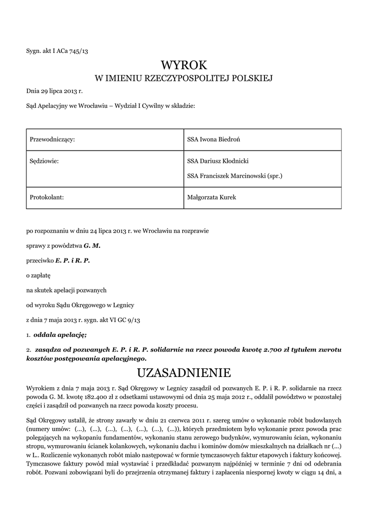 Sygn. akt I ACa 745/13 WYROK W IMIENIU RZECZYPOSPOLITEJ POLSKIEJ Dnia 29 lipca 2013 r. Sąd Apelacyjny we Wrocławiu – Wydział I Cywilny w składzie: Przewodniczący: SSA Iwona Biedroń Sędziowie: SSA Dariusz Kłodnicki SSA Franciszek Marcinowski (spr.) Protokolant: Małgorzata Kurek po rozpoznaniu w dniu 24 lipca 2013 r. we Wrocławiu na rozprawie sprawy z powództwa G. M. przeciwko E. P. i R. P. o zapłatę na skutek apelacji pozwanych od wyroku Sądu Okręgowego w Legnicy z dnia 7 maja 2013 r. sygn. akt VI GC 9/13 1. oddala apelację; 2. zasądza od pozwanych E. P. i R. P. solidarnie na rzecz powoda kwotę 2.700 zł tytułem zwrotu kosztów postępowania apelacyjnego. UZASADNIENIE Wyrokiem z dnia 7 maja 2013 r. Sąd Okręgowy w Legnicy zasądził od pozwanych E. P. i R. P. solidarnie na rzecz powoda G. M. kwotę 182.400 zł z odsetkami ustawowymi od dnia 25 maja 2012 r., oddalił powództwo w pozostałej części i zasądził od pozwanych na rzecz powoda koszty procesu. Sąd Okręgowy ustalił, że strony zawarły w dniu 21 czerwca 2011 r. szereg umów o wykonanie robót budowlanych (numery umów: (...), (...), (...), (...), (...), (...), (...)), których przedmiotem było wykonanie przez powoda prac polegających na wykopaniu fundamentów, wykonaniu stanu zerowego budynków, wymurowaniu ścian, wykonaniu stropu, wymurowaniu ścianek kolankowych, wykonaniu dachu i kominów domów mieszkalnych na działkach nr (...) w L.. Rozliczenie wykonanych robót miało następować w formie tymczasowych faktur etapowych i faktury końcowej. Tymczasowe faktury powód miał wystawiać i przedkładać pozwanym najpóźniej w terminie 7 dni od odebrania robót. Pozwani zobowiązani byli do przejrzenia otrzymanej faktury i zapłacenia niespornej kwoty w ciągu 14 dni, a ewentualną sporną część kwoty pozwani powinni w powyższym terminie zakwestionować, w przeciwnym bowiem wypadku uważano, że faktura została w całości zatwierdzona. Powód wykonywał powyższe roboty w okresie od lipca 2011 do marca 2012 r. Równolegle z pracami na rzecz pozwanych powód wykonywał prace na innych budowach. Po zakończeniu poszczególnych etapów powód prac wystawił pozwanym faktury VAT o numerach: (...) oraz nr: (...), (...), (...), na łączną kwotę 248.000 zł. W fakturach nr nr: (...), (...), (...), (...), (...), (...), (...), (...), (...), (...), (...) i (...) powód jako sposób zapłaty wpisał: „gotówka”. W fakturach nr nr: (...), (...), (...), (...) jako sposób zapłaty wskazano: „przelew”. Wszystkie faktury zostały podpisane przez pozwanych. Pozwany R. P. odbierając fakturę VAT nr (...) z dnia 1.02.2012 r. na kwotę 20.000 zł przekreślił sposób zapłaty „gotówka” zmieniając go na „przelew”. Pozwani w formie przelewu zapłacili powodowi: – w dniu 27.09.2011 r. kwotę 14.000 zł z tytułu faktury nr (...), – w dniu 16.12.2011 r. kwotę 16.000 zł z tytułu faktury nr (...), – w dniu 10.01.2012 r. kwotę 16.000 zł z tytułu faktury nr (...), – w dniu 28.12.2012 r. kwotę 10.243,07 zł z tytułu faktury nr (...). Powód w pismach z 18 maja 2012 r. i 24 sierpnia 2012 r. wzywał pozwanych do zapłaty należności w kwocie 254.400 zł. Pozwani odmówili zapłaty wskazując, że uregulowali już wszelkie należności. Część zleconych powodowi prac została przez niego wykonana wadliwie, co skutkowało reklamacjami ze strony nabywców domów. Zgłaszane usterki dotyczyły między innymi dachów, tj. braku pasów nadrynnowych, braku grzebieni okapu, obróbek blacharskich, w tym uszczelnienia cieknącego włazu i komina dachu, jak również krzywych ścian oraz nieprawidłowego wylania posadzek. Pozwani wzywali powoda telefonicznie, a w dniu 15 września 2012 r. pisemnie, do usunięcia w terminie 7 dni na działce (...) wad nienależycie dachu i uzupełnienia braku pasów nadrynnowych, braku grzebieni okapu, uzupełnienia obróbek blacharskich, w tym uszczelnienie cieknącego włazu i komina dachu oraz poprawienia blacharki obróbki komina (brak estetyki). Powód skierował swych pracowników do usunięcia zgłoszonych wad, jednak nie przystąpili pni do prac poprawkowych, nie dokonali oględzin budynku i nie usunęli żadnych usterek. Pozwani zlecili dokonanie prac poprawkowych K. L., prowadzącemu Zakład (...). W budynkach wybudowanych przez powoda dokonał on m.in. demontażu dachówek przy okapach i zamontował pasy nadrynnowe i grzebienie okapu, dokonał poprawek obróbek blacharskich pokrycia dachowego, wymienił blachy przy kominach i poprawił folie przy oknach dachowych, za co wystawił pozwanym faktury. Wykonane przez niego prace były celowe i konieczne. Z tytułu powyższych poprawek pozwani ponieśli koszty na sumę 9.756,93 zł. Pozwani złożyli oświadczenie o potrąceniu przysługującej im z tego tytułu wierzytelności z wierzytelnością powoda z tytułu niezapłaconej faktury VAT nr (...) z dnia 1.02.2012 r. w kwocie 20.000 zł. Pozostałą do zapłaty kwotę 10.243,07 zł zapłacili powodowi w dniu 28 grudnia 2012 r. Przy takich ustaleniach Sąd Okręgowy uznał, iż pozwani nie udowodnili swoich twierdzeń, że zapłacili powodowi kwotę 182.400 zł z wystawionych przez niego faktur. W uzasadnieniu wyroku stwierdził, że pozwani nie wykazali, aby strony przyjęły inne ustalenia dotyczące sposobu zapłaty niż określone w § 6 zawartych umów. Za gołosłowne uznał twierdzenie pozwanych, że zapłaty dokonywano w drodze „wymiany” faktury na gotówkę. Sąd zauważył jednocześnie, iż faktura nie jest dowodem zapłaty, natomiast zamieszczona na spornych fakturach adnotacja „gotówka” oznacza tylko formę płatności, a nie pokwitowanie zapłaty, przy czym odwołał się do stanowiska wyrażonego w wyroku Sądu Najwyższego z 7 października 2003 r. IV CK 57/02. W ocenie Sądu Okręgowego faktu zapłaty powyższej należności nie potwierdzili również słuchani w sprawie świadkowie. Także podnoszonej przez pozwanych okoliczn