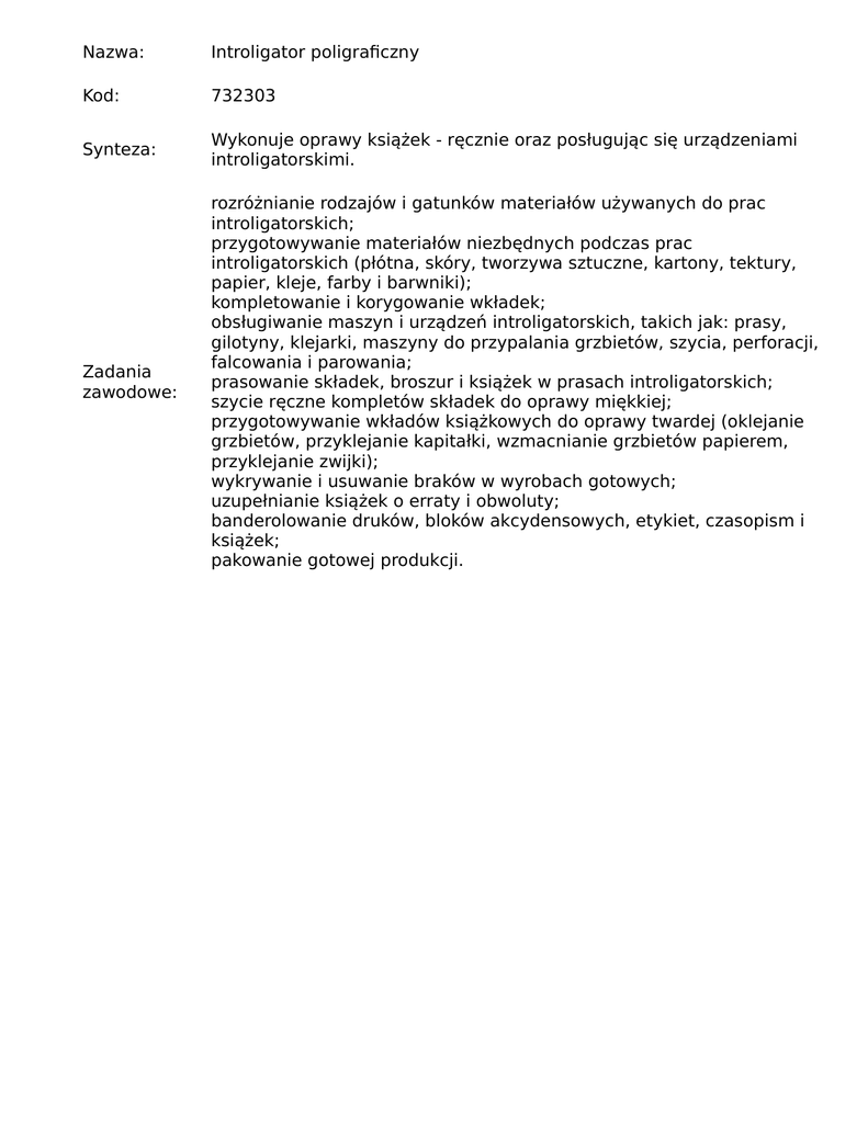 Nazwa: Introligator poligraficzny Kod: 732303 Synteza: Wykonuje oprawy książek - ręcznie oraz posługując się urządzeniami introligatorskimi. Zadania zawodowe: rozróżnianie rodzajów i gatunków materiałów używanych do prac introligatorskich; przygotowywanie materiałów niezbędnych podczas prac introligatorskich (płótna, skóry, tworzywa sztuczne, kartony, tektury, papier, kleje, farby i barwniki); kompletowanie i korygowanie wkładek; obsługiwanie maszyn i urządzeń introligatorskich, takich jak: prasy, gilotyny, klejarki, maszyny do przypalania grzbietów, szycia, perforacji, falcowania i parowania; prasowanie składek, broszur i książek w prasach introligatorskich; szycie ręczne kompletów składek do oprawy miękkiej; przygotowywanie wkładów książkowych do oprawy twardej (oklejanie grzbietów, przyklejanie kapitałki, wzmacnianie grzbietów papierem, przyklejanie zwijki); wykrywanie i usuwanie braków w wyrobach gotowych; uzupełnianie książek o erraty i obwoluty; banderolowanie druków, bloków akcydensowych, etykiet, czasopism i książek; pakowanie gotowej produkcji.