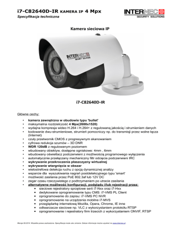 i7-C82640D-IR KAMERA IP 4 Mpx Specyfikacja techniczna Kamera sieciowa IP i7-C82640D-IR Główne cechy: • • • • • • • • • • • • • • • • • kamera zewnętrzna w obudowie typu 'bullet' maksymalna rozdzielczość 4 Mpx(2688x1520) wydajna kompresja wideo H.264 i H.264+ z regulowaną jakością i strumieniem danych kodowanie dwu-strumieniowe, strumień pomocniczy np. do transmisji przez wolne łącza (Internet) czuły przetwornik CMOS z progresywnym skanowaniem cyfrowa redukcja szumów – 3D DNR WDR 120dB z regulowanym poziomem wbudowany obiektyw, dostępne ogniskowe: 4mm , 6mm wbudowany oświetlacz podczerwieni z możliwością programowego wyłączenia automatycznie przełączany mechaniczny filtr odcięcia podczerwieni IRC wykrywanie przekroczenia płaszczyzny wirtualnej wykrywanie wtargnięcia w obszar wielostrefowa detekcja ruchu z opcją dynamicznej analizy wsparcie dla wyszukiwania nagrań postdetekcyjnego typu 'smart' możliwość zasilania przez PoE 802.3af lub 12V DC zegar czasu rzeczywistego z podtrzymaniem po utracie zasilania alternatywne możliwość konfiguracji, podglądu i/lub rejestracji przez: ▪ sieciowe rejestratory sprzętowe serii i7-Nxx oraz i7-Hxx ▪ dedykowane oprogramowanie typu CMS: i7-VMS PL Client ▪ oprogramowanie do zapisu: i7-VMS PC NVR ▪ oprogramowanie na urządzenia mobilne i7-MVS ▪ przeglądarkę internetową Mozilla, Opera, Chrome, IE inne ▪ odtwarzacze sieciowe np. VLC z wykorzystaniem protokółu RTSP ▪ oprogramowanie i rejestratory firm trzecich z wykorzystaniem ONVIF, RTSP Wersja 08.2014. Wszelkie prawa zastrzeżone. Specyfikacja może ulec zmianie. Dalsze informacje można uzyskać na www.internec.pl . i7-C82640D-IR KAMERA IP 4 Mpx Specyfikacja techniczna Parametry techniczne: Model Parametry Kamera Przetwornik Min. oświetlenie Elektroniczna migawka Obiektyw Kąt widzenia Mocowanie obiektywu Cyfrowa redukcja szumów Szeroki zakres dynamiki Dzień / Noc BLC Standard kompresji Kompresja wideo Strumień bitowy Dodatkowe funkcje kodera Kompresja audio Dwustrumieniowość Obraz Maks.rozdzielczość obrazu Liczba klatek na sekundę (fps) przy zadanej rozdzielczości Ustawienia obrazu Funkcje Detekcja ruchu Alarmy inteligentne Sieć Zapis sieciowy Opcje zapisu Zdarzenia alarmowe Reakcje alarmowe Protokoły Bezpieczeństwo Obsługa Interfejs Interfejs komunikacyjny Przycisk reset i7-C82640D-IR Kamera 4Mpx w obudowie zewnętrzej typu 'bullet' 1/3” CMOS z progresywnym skanowaniem 0.01Lux @ (F1.2,AGC ON), 0.028Lux @ (F2.0,AGC ON), 0Lux przy IR ON 1/3s -1/100,000s 4mm / F2.0 , 6mm / F2.0 85° (4mm), 55° (6mm) M12 3D DNR z regulowanym poziomem 0-100 WDR 120 dB z regulowanym poziomem 0-100 Filtr odcięcia podczerwieni IR cut: 7 poziomów przełączania automatycznego; harmonogram godzinowy przełączania Tak z wyborem strefy H.264 main profile / H.264+ / MJPEG 256 Kbps~16Mbps ROI: 4 obszary zainteresowania, SVC Nie dotyczy Tak 2688 x 1520 p× 50 Hz: 20fps (2688 x 1520), 25fps (1920 x 1080), 25fps (1280 x 720) 60 Hz: 20fps (2688 x 1520), 30fps (1920 x 1080), 30fps (1280 x 720) Nasycenie, jasność, kontrast, barwa ostrość: ustawiane przez CMS lub przeglądarkę Znak wodny, przeciwmigotanie, lustro, obrót 90°, maski prywatności na obrazie, smart IR, własny tekst na obrazie. 22x18 pól, czułość 6 poziomów, tryby pracy: normalny oraz zaawansowany. W trybie zaawansowanym możliwość definiowania stref o różnej czułości oraz różnicowania czułości w trybie dzień i noc. Wtargnięcie w obszar – 4 obszary Przekroczenie płaszczyzny wirtualnej – 4 płaszczyzny NAS (obsługa NFS, SMB/CIFS), ANR Nagrywanie z nadpisywaniem lub do zapełnienia nośnika. Harmonogramy zapisu: ciągły, alarmowy, z detekcji ruchu. Nagrywanie strumienia głównego lub pomocniczego. Detekcja ruchu, sabotaż wideo, przekroczenie płaszczyzny wirtualnej, wtargnięcie w obszar, nieuprawnione logowanie, błąd zapisu, konflikt adresów IP, odłączenie od sieci IP. Wyzwolenie nagrywania, wysłanie email, zrzut zdjęcia na FTP, przesłanie informacji o zdarzeniu do oprogramowania i7-VMS TCP/IP, HTTP, DHCP, DNS, DDNS, RTP, RTSP, PPPoE, SMTP, NTP, UPnP, ICMP, IGMP, SNMP, FTP, 802.1x, QoS ,HTTPS, UPnP, IPv6, Bonjour Ochrona hasłem z opcją dostępu anonimowego, możliwość definiowania użytkowników, filtr adresów IP, blokada konta przy niepoprawnym logowaniu ONVIF (PROFILE S, PROFILE G), PSIA, CGI, ISAPI RJ45 10M / 100M Ethernet Tak Wersja 08.2014. Wszelkie prawa zastrzeżone. Specyfikacja może ulec zmianie. Dalsze informacje można uzyskać na www.internec.pl . i7-C82640D-IR KAMERA IP 4 Mpx Specyfikacja techniczna Ogólne Kamera zewnętrzna IP66 ; -30℃~+60℃, wilgotność maks. 95% (nieskondensowana) Wbudowany oświetlacz podczerwieni o zasięgu do 30m. Oświetlacz Możliwość programowego wyłączenia. Zasilanie 12V DCV +/-10% lub PoE (802.3af) Pobór prądu Max 5W Wymiary 60,4x76.9x139,2mm (z uchwytem) Waga 380g Zasilacz nie jest zawarty w zestawie, należy nabyć oddzielnie Warunki pracy Informacje do zamówień: i7-C82640D-IR 4mm i7-C82640D-IR 6mm Wymiary: jednostka [mm] Wersja 08.2014. Wszelkie prawa zastrzeżone. Specyfikacja może ulec zmianie. Dalsze informacje można uzyskać na www.internec.pl .